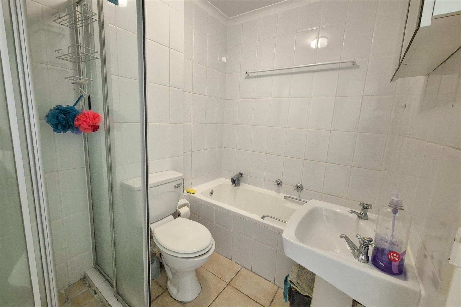 BATHROOMS: The apartment features a full family bathroom complete with a basin, toilet, bath, and shower - neatly tiled and well-maintained.