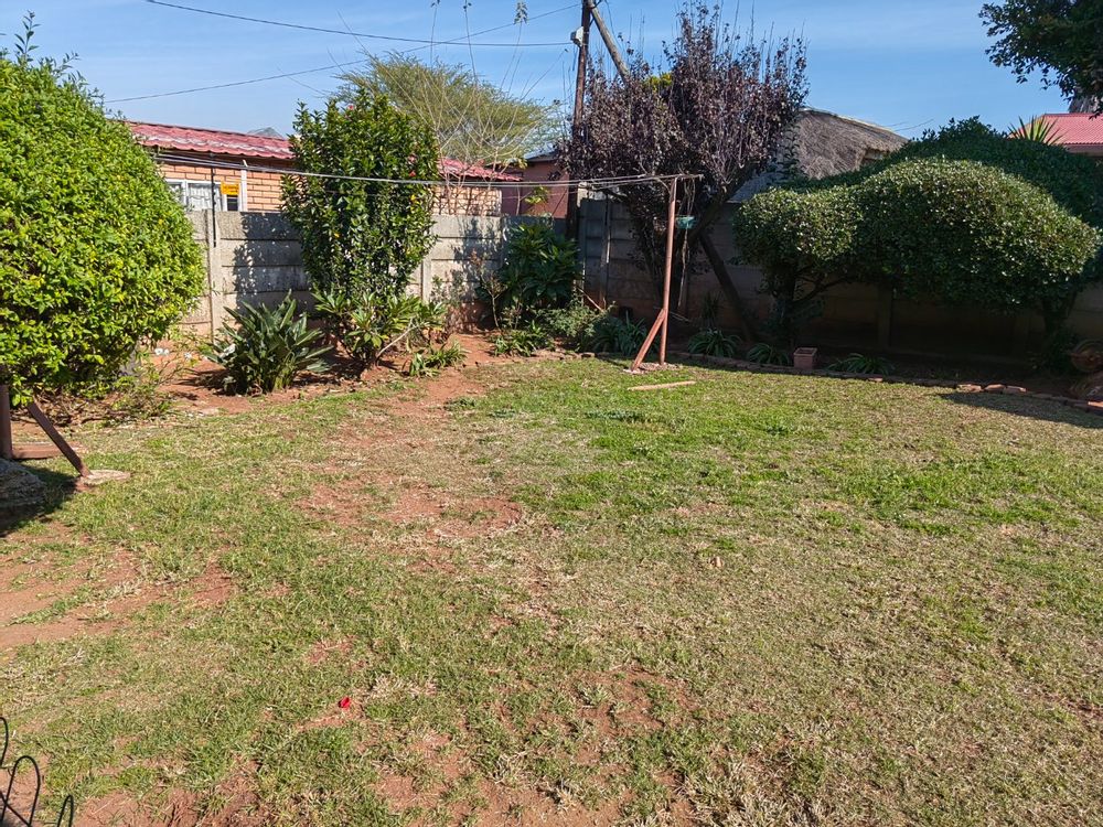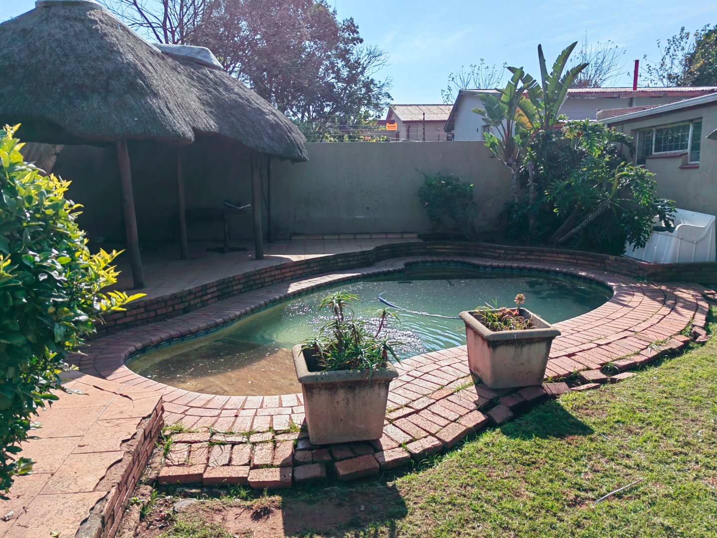 Directly out of the doors of the additional sitting room is a large well-manicured garden with an entertainment area under a Lapa and a swimming pool.