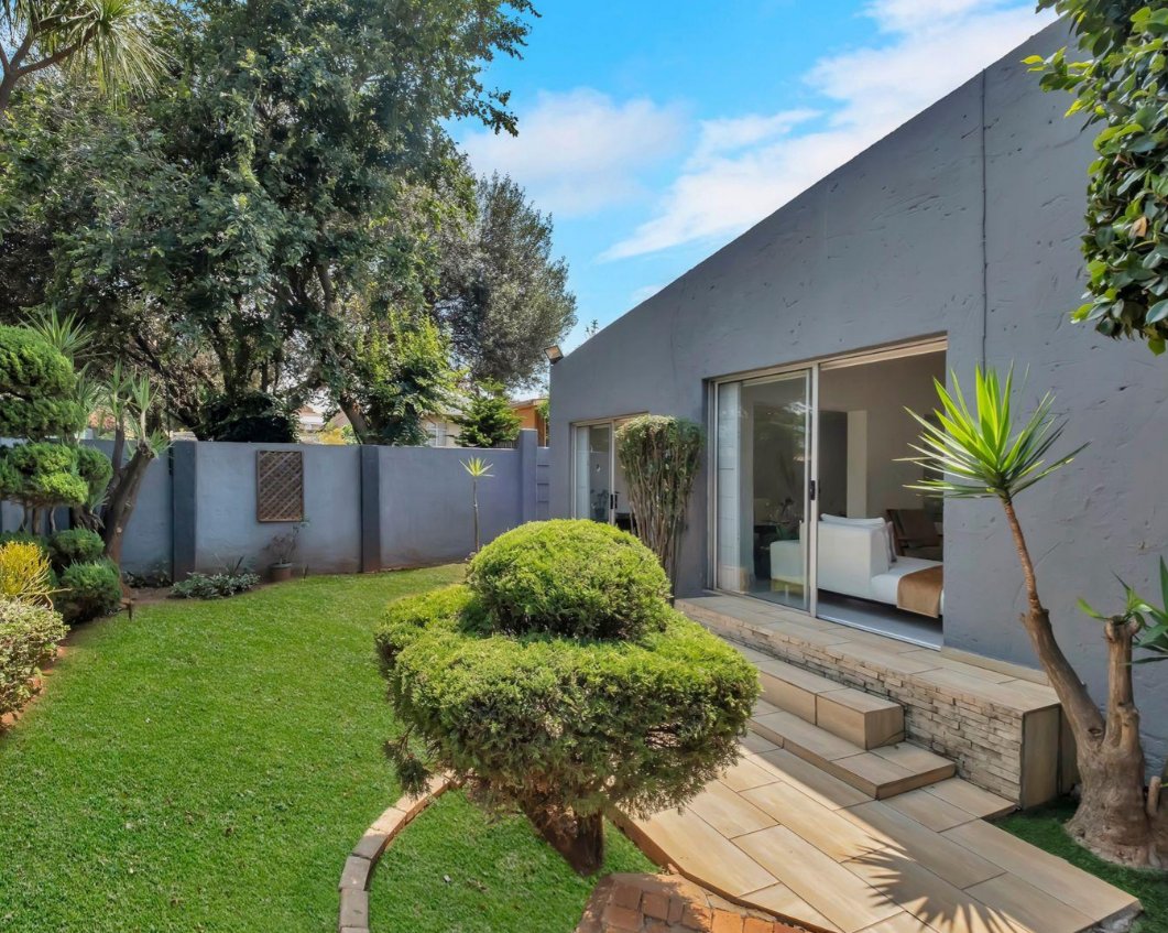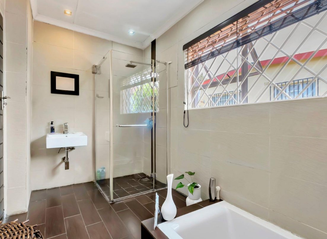 The property includes a Hollywood garage for two cars, extra off-street parking, and a storeroom. A spacious garden offers plenty of room to relax or entertain. Security is a priority with Trellidor security doors, a burglar alarm, and two geysers ensuring efficiency and convenience. Featuring the finest fixtures and fittings, this home is a must-see. Contact us today to arrange a viewing!