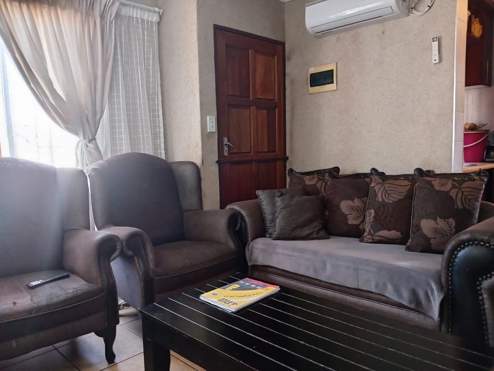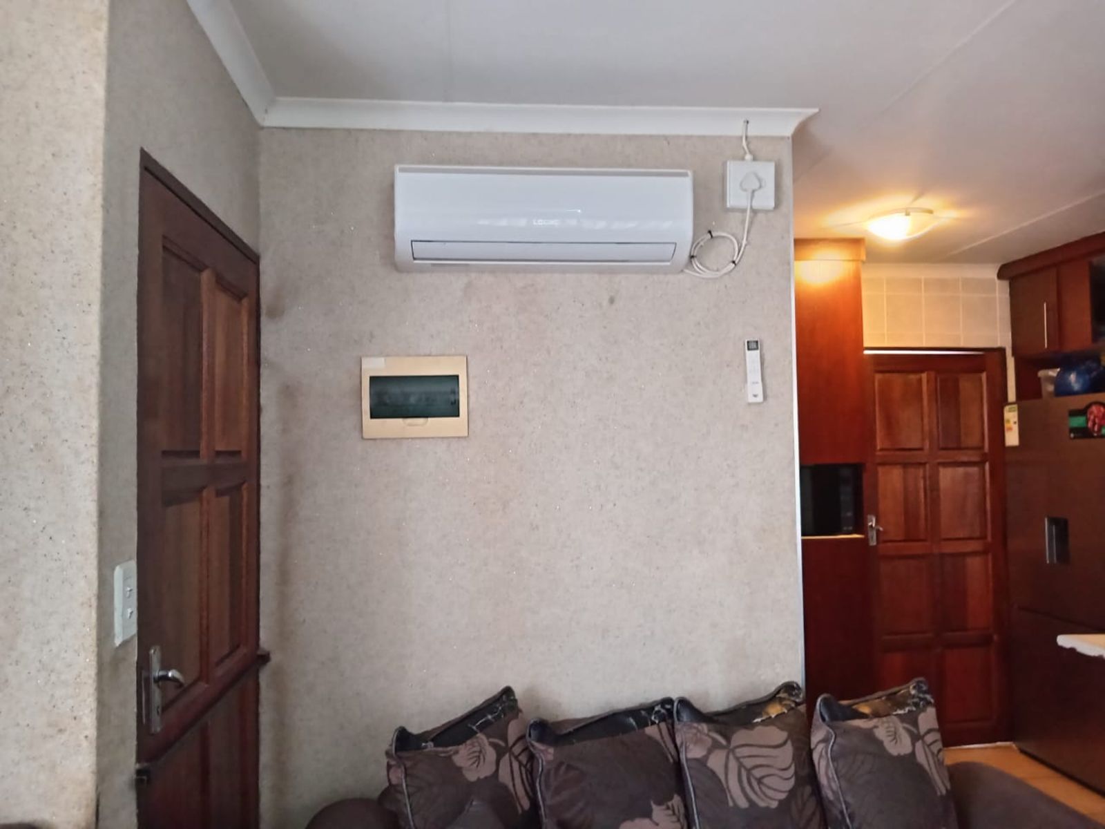 Open-Plan Kitchen and Lounge: Featuring built-in cupboards and an air conditioning system for year-round comfort.