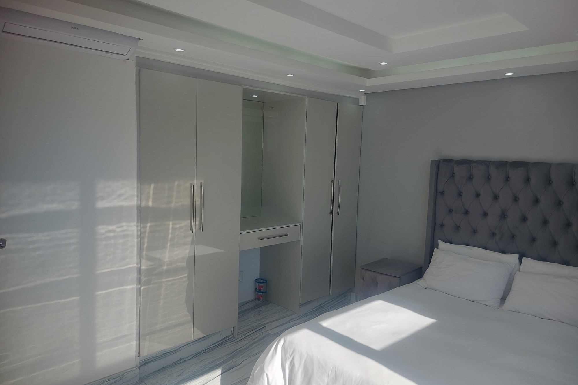 Two spacious bedrooms, each fitted with built-in cupboards and wardrobes