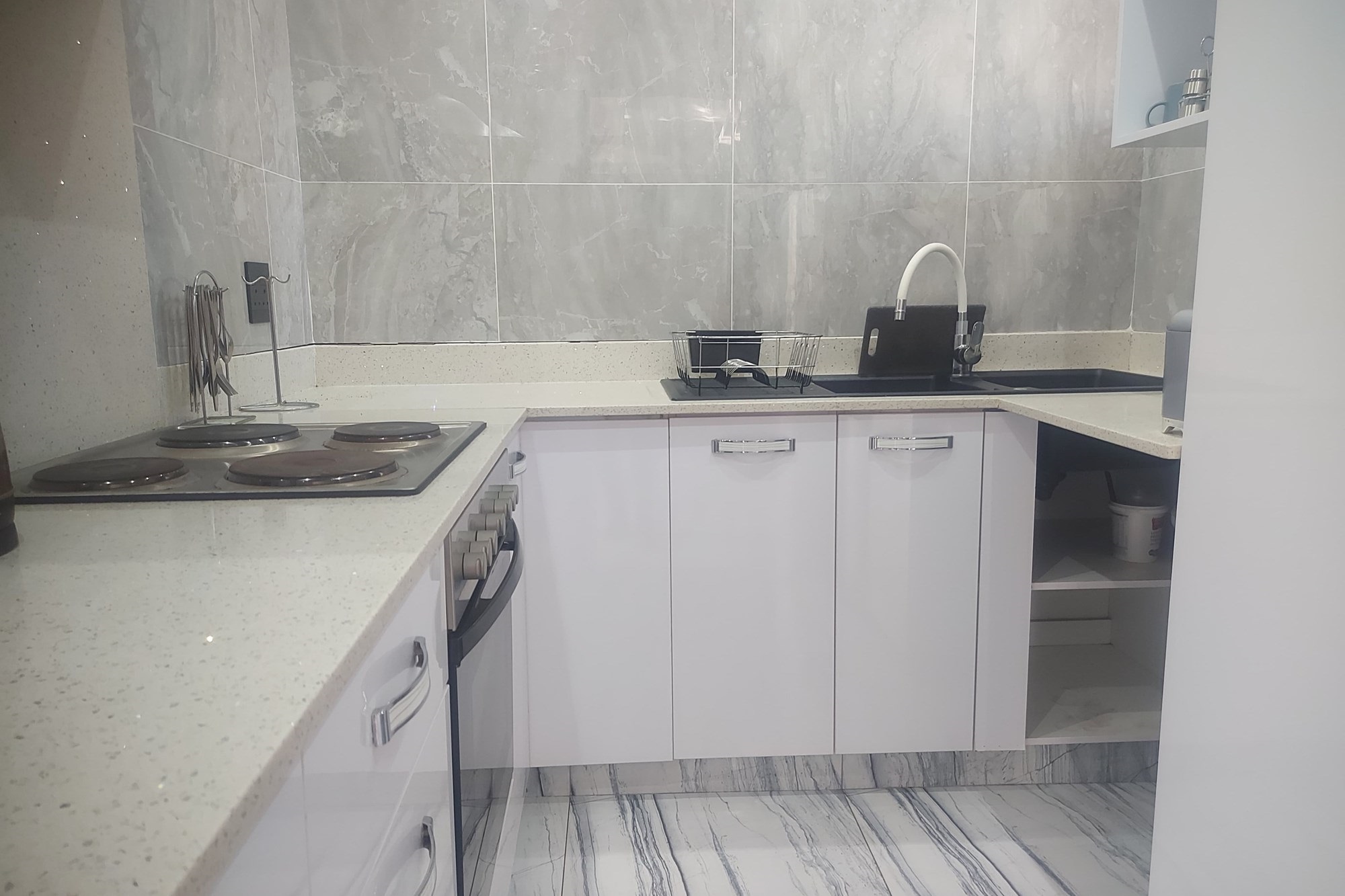 A modern, fully equipped kitchen and open-plan dining and living area with panoramic sea views