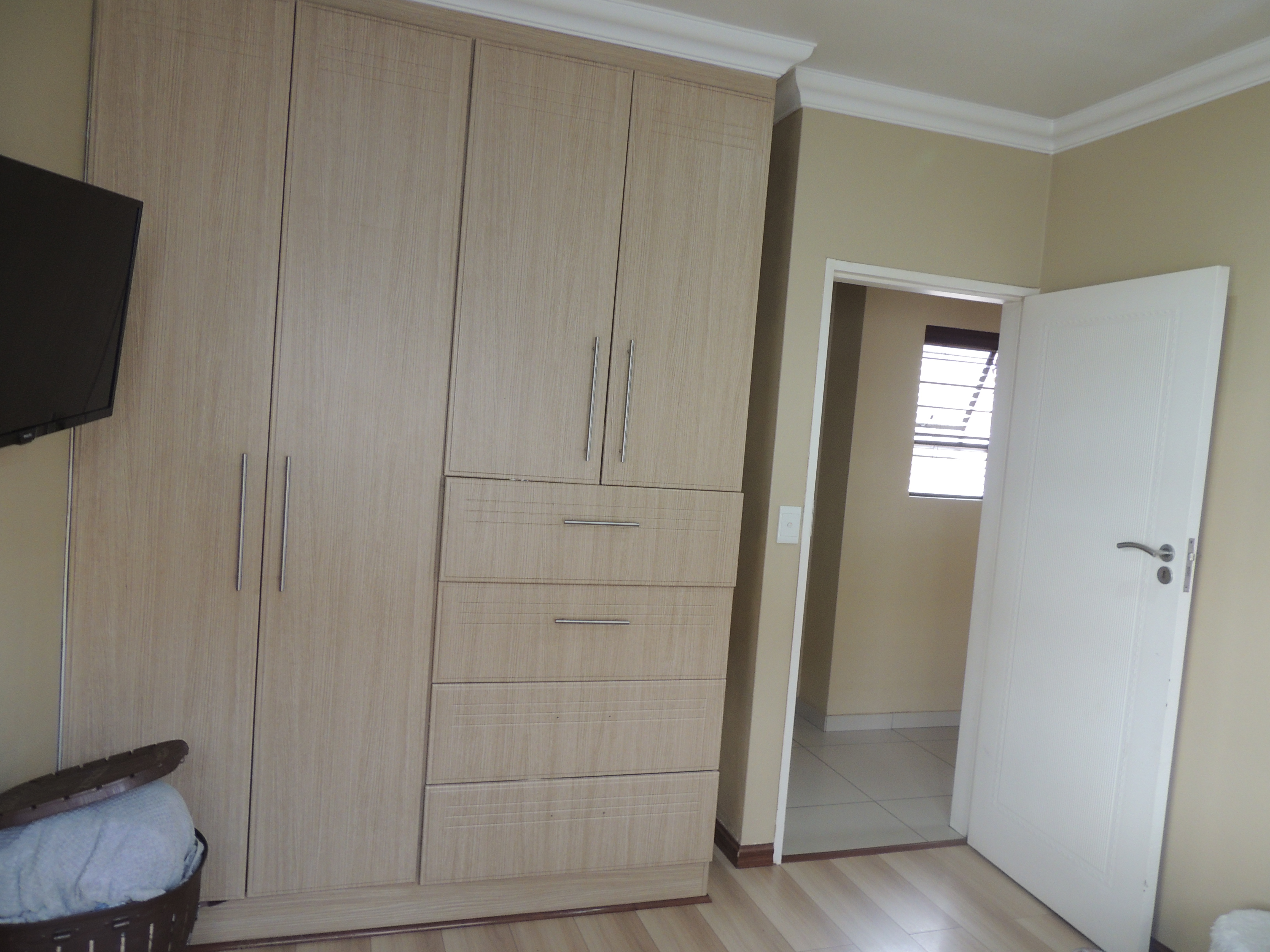 Built over two levels, the property boasts three spacious bedrooms with built-in cupboards. The master suite features an ensuite bathroom with a bath, shower, double basin, and toilet. A second well-appointed bathroom, complete with a bath, shower, basin, and toilet, serves the remaining bedrooms.