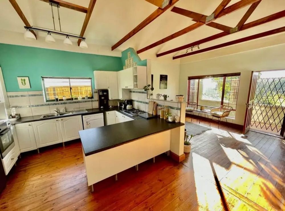 The open-plan kitchen, dining and living areas flow effortlessly to a outdoor braai area ideal for relaxed entertaining without the upkeep of a garden. Beautiful wooden flooring and open trusses add character and charm throughout.