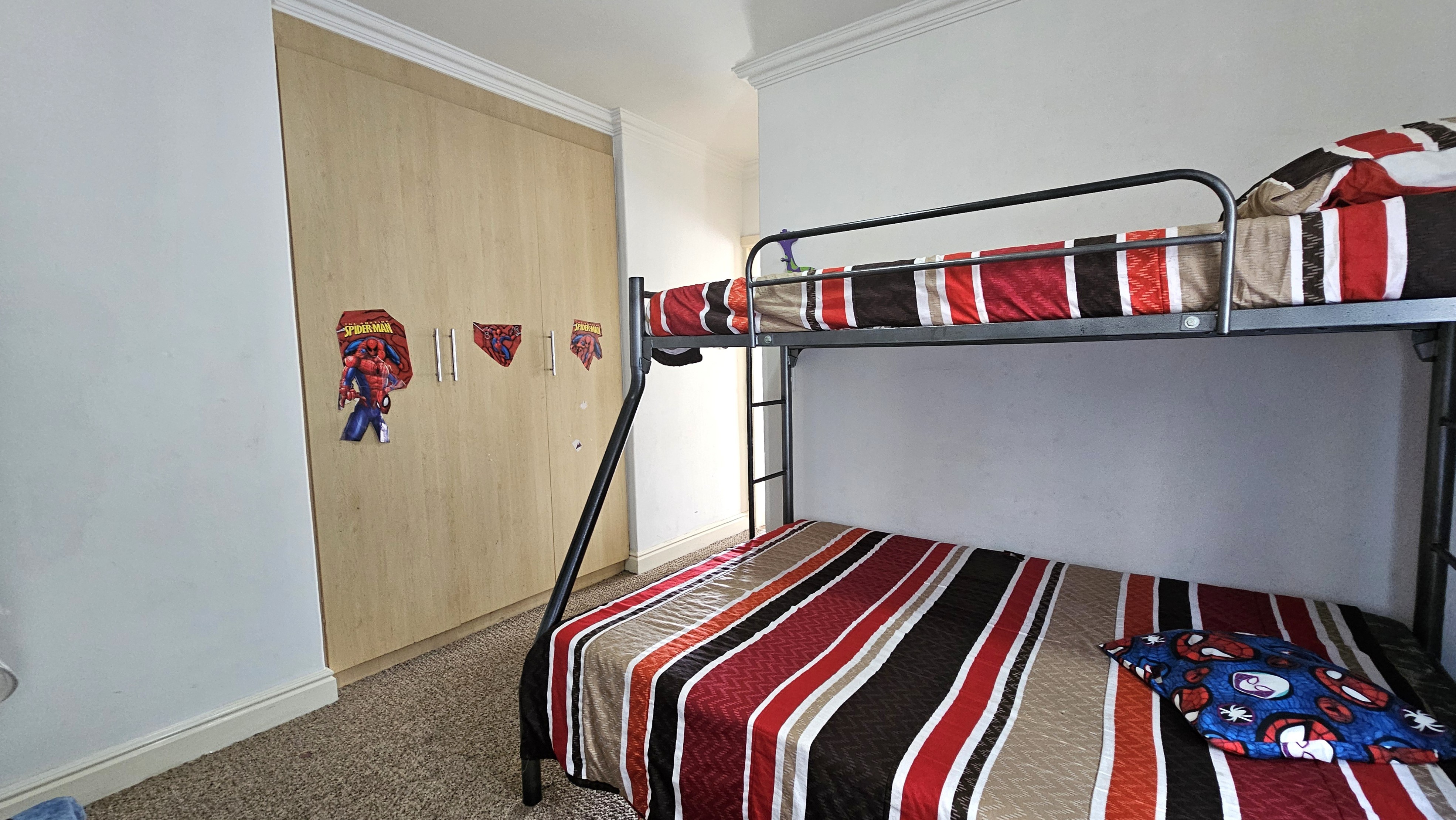 The home offers three carpeted bedrooms, each with built-in cupboards. The main bedroom includes an en-suite bathroom with a shower, toilet, and basin. The family bathroom features a bath, toilet, and basin.