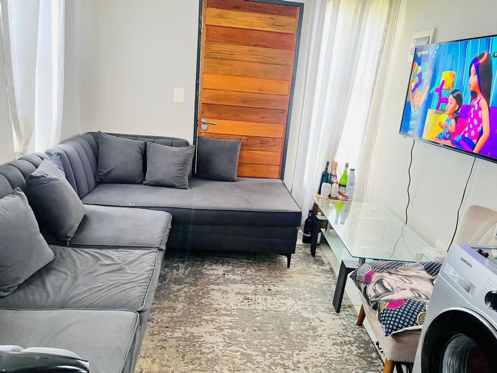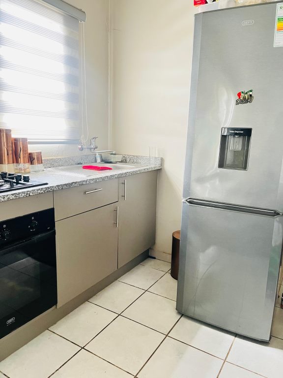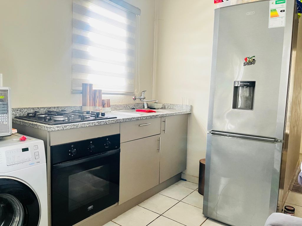 Two bedrooms have built-in cupboards, a sparkling bathroom, and a modern kitchen equipped with all necessary appliances.