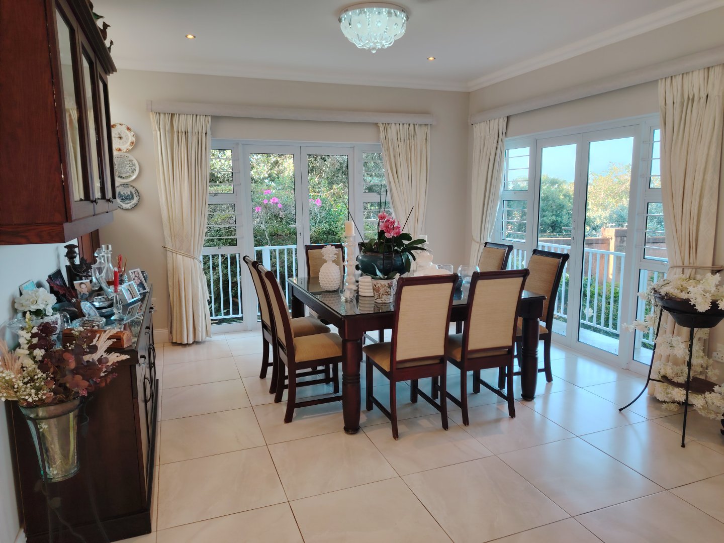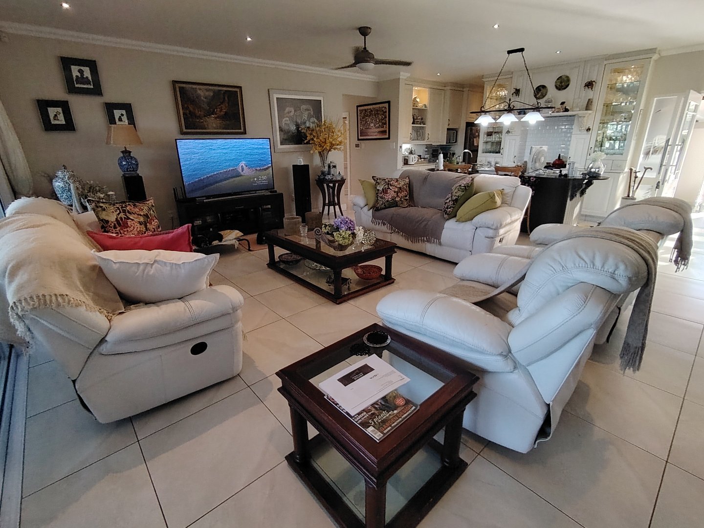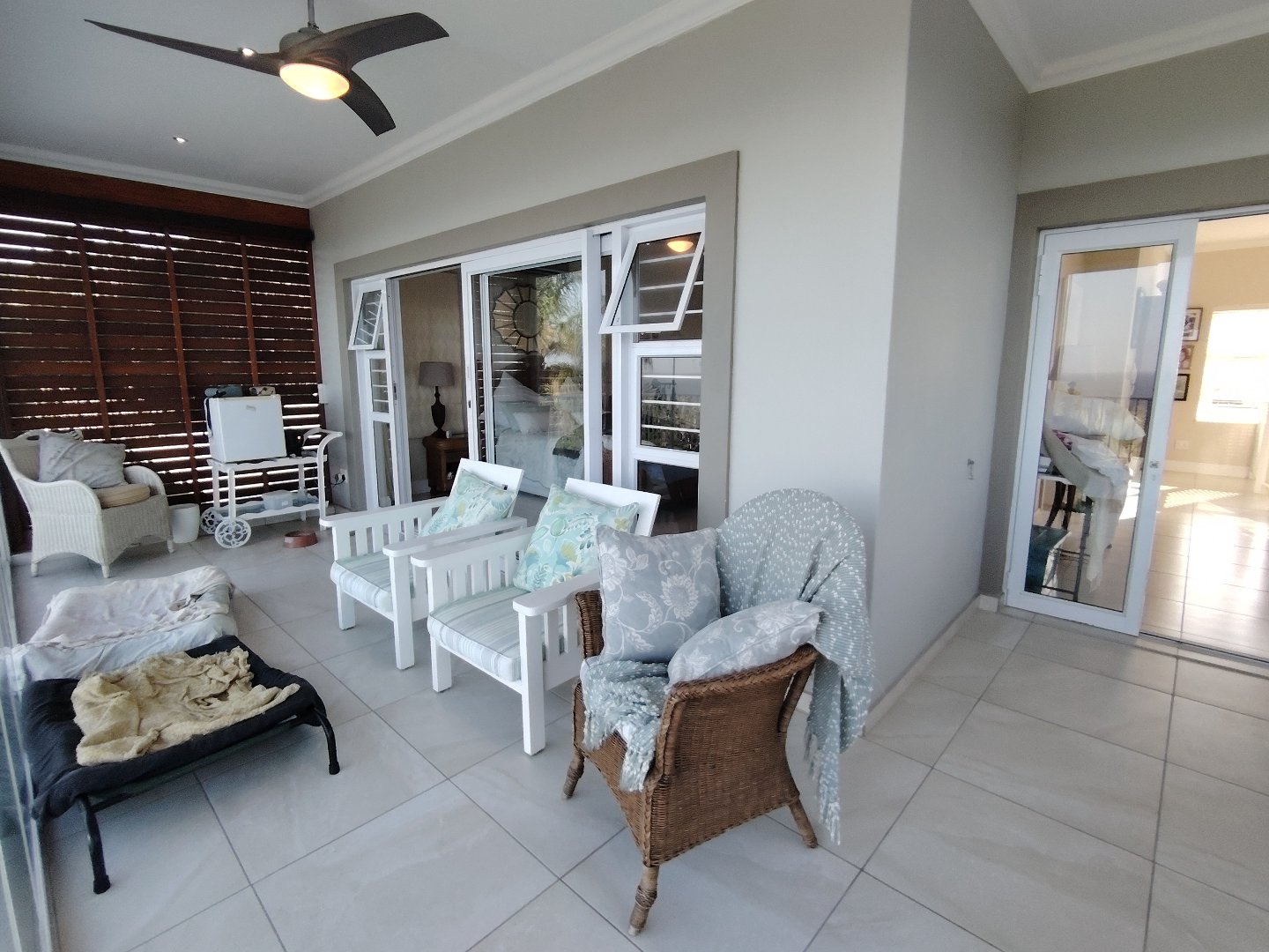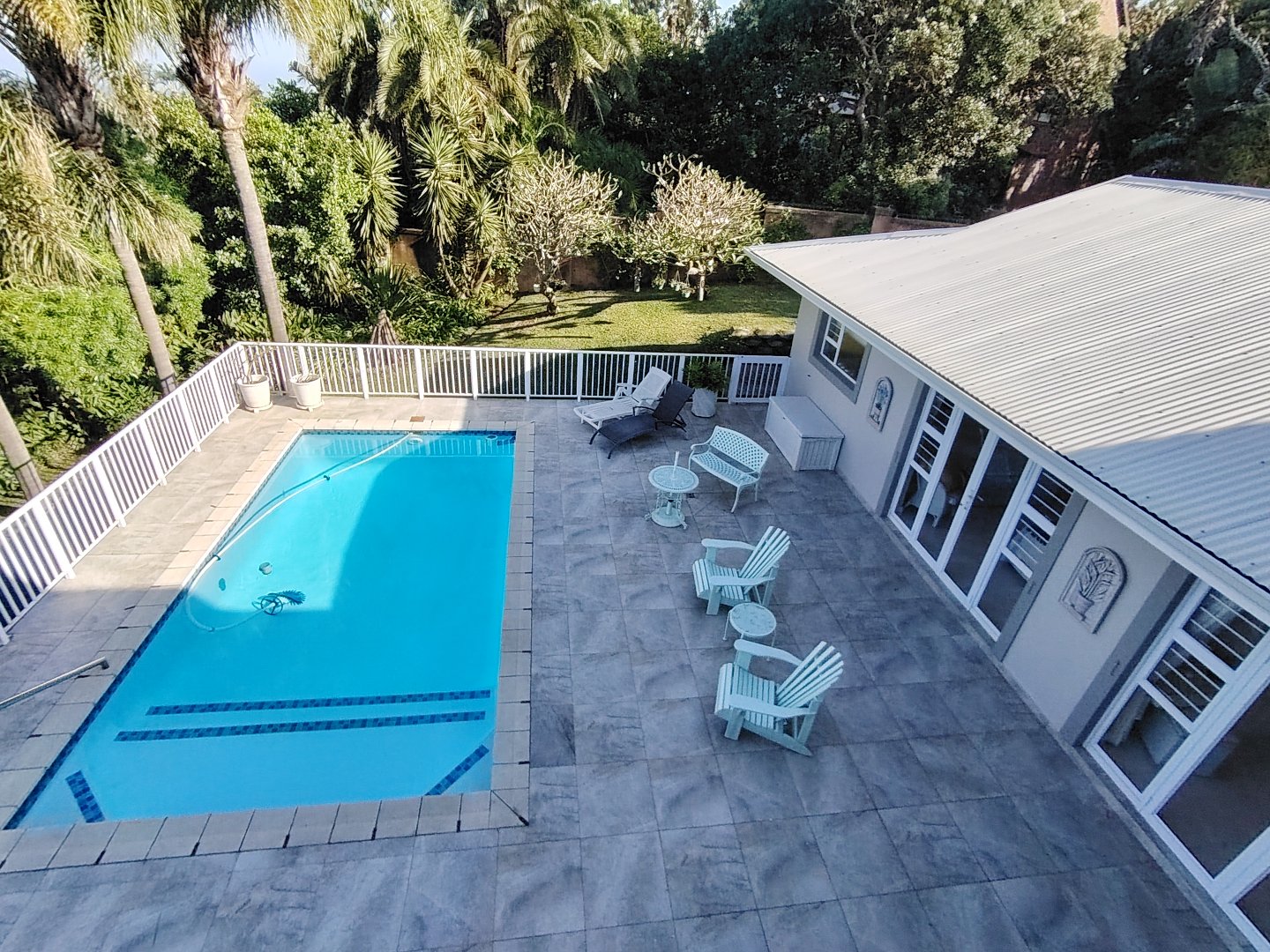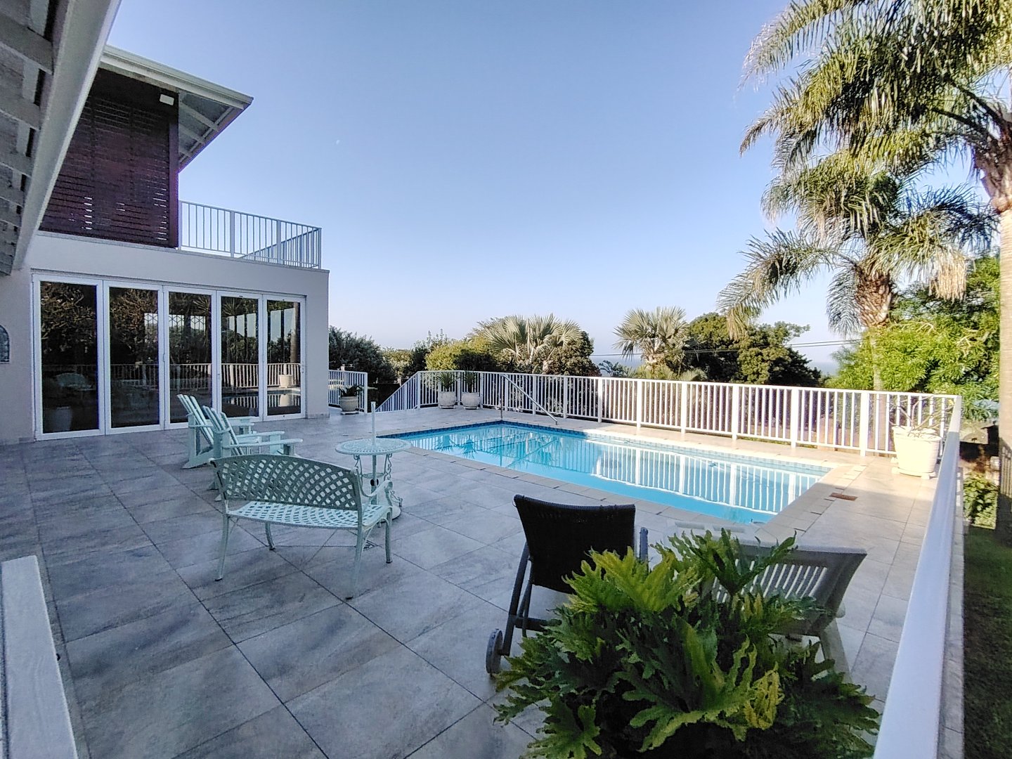 Take a walk through this spectacular home. When entering the property the green lush garden leads your eye towards to breathtaking double storey home, the outdoor entrance area is tranquil and entering the home the spacious open plan lounge / dining room / kitchen will make you stand still to take it all in. From the lounge, the enclosed patio with glass stack sliding doors, overlooking the pool with sea views. The dining room is situated on the left and the stairs leading to the top but let's finish downstairs first. The kitchen is breathtaking with granite tops, pantry, scullery and a laundry - it's any Chef's dream. To the right down the hall, the family bathroom is to the right, the entrance hall connects the three bedrooms downstairs. The first bedroom is smaller and it's overlooking the pool, the second bedroom has a walk in cupboard and full bathroom and is overlooking the pool. The third bedroom is overlooking the side garden and has it's own bathroom. Now we are moving up the stairs with a chandelier and the space opens up to a study. To the right is the main fourth bedroom with a full bathroom and walk in cupboard, the enclosed balcony with glass stack doors will ensure that you will wake up with sunrise every morning, the open balcony is a bonus - with 180 degree sea views. This concludes the house - the flat let is next. The flat consists of a lounge / kitchen and with a few steps up the one bedroom and bathroom completes the flat let. The sparkling swimming pool will keep the whole family busy the whole year and the yard is big enough to keep the four legged friends running around. The property offers a double garage and under cover parking. The solar panels, generator, invertor, gas geysers and electric fence are all the boxes are are ticked at this home.