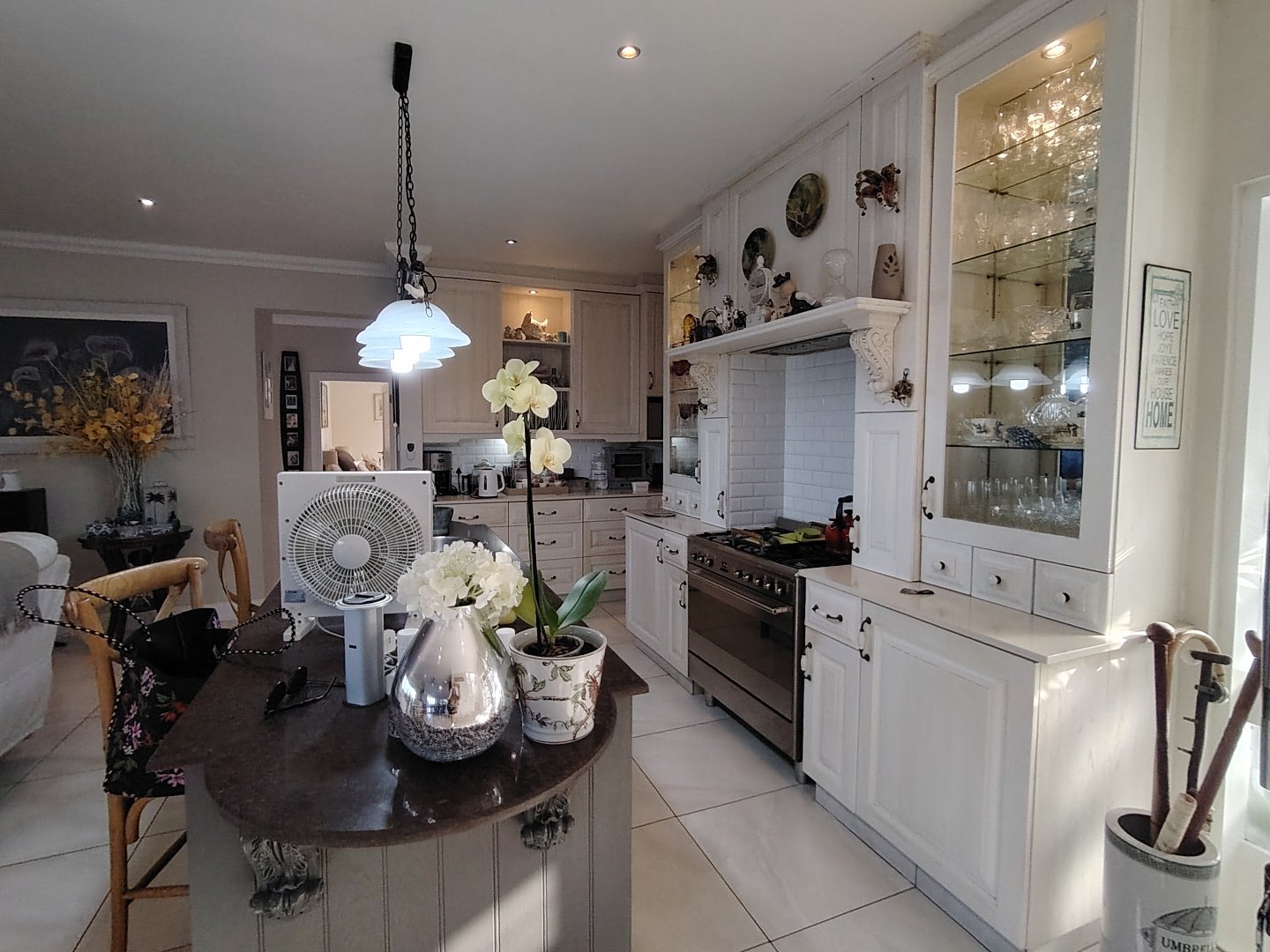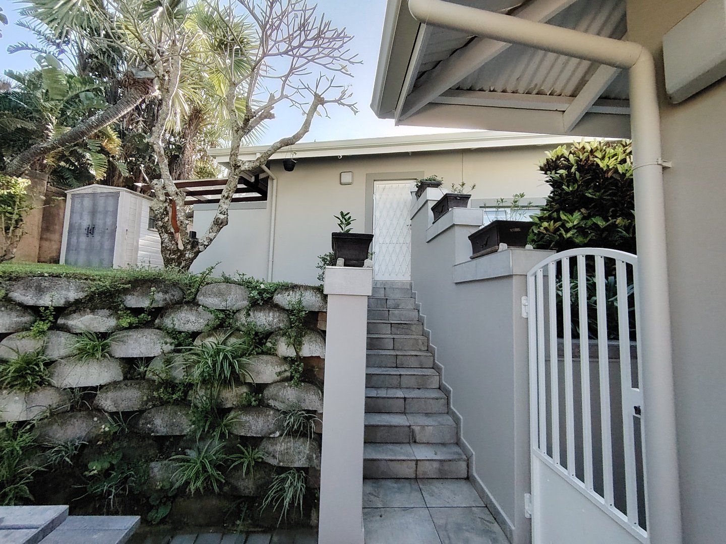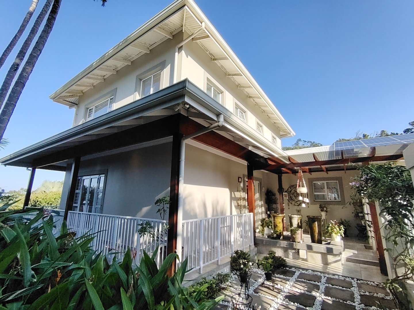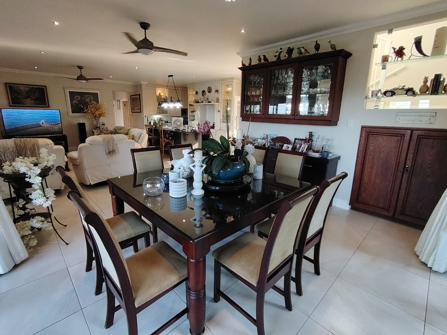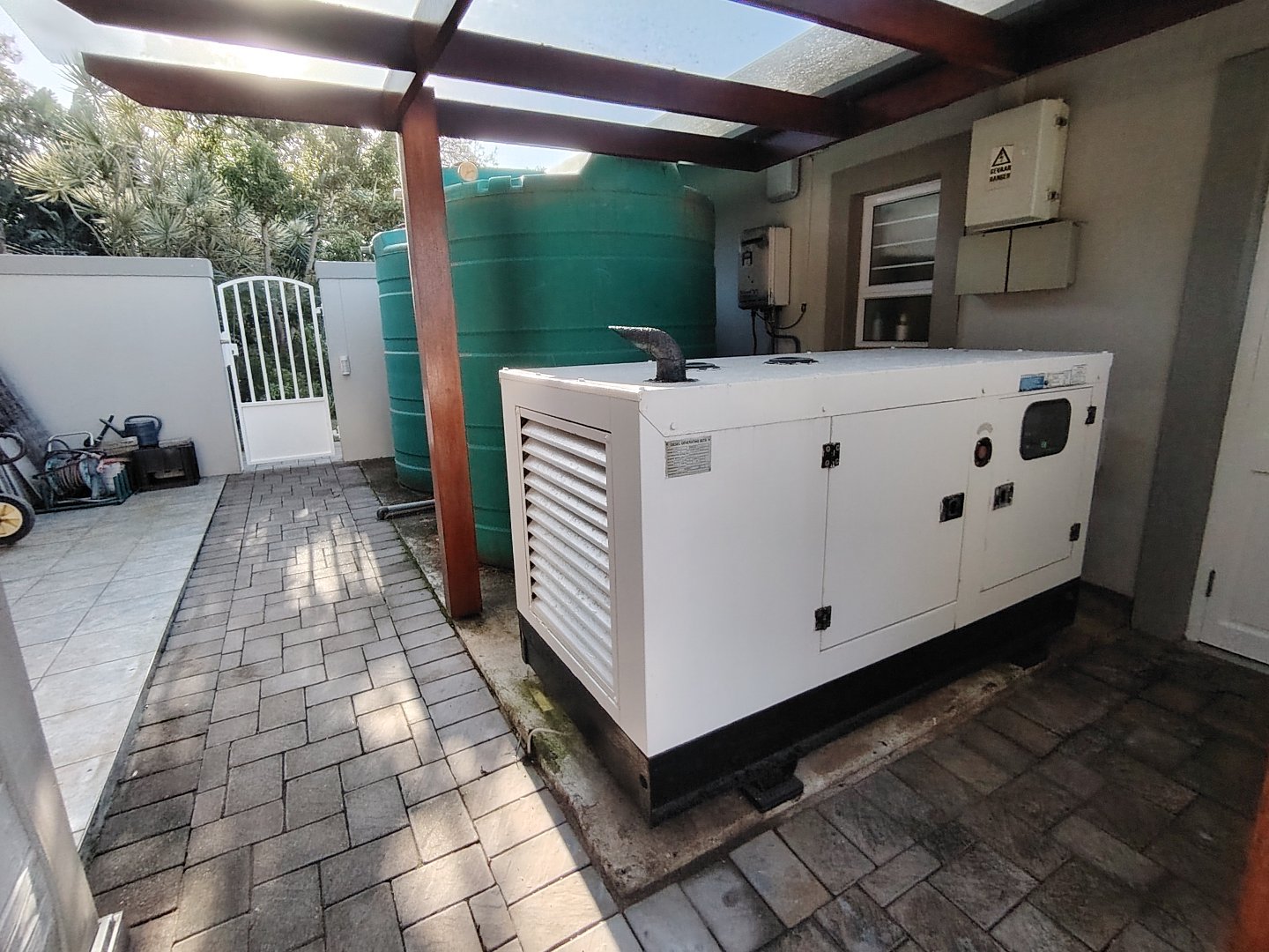 Take a walk through this spectacular home. When entering the property the green lush garden leads your eye towards to breathtaking double storey home, the outdoor entrance area is tranquil and entering the home the spacious open plan lounge / dining room / kitchen will make you stand still to take it all in. From the lounge, the enclosed patio with glass stack sliding doors, overlooking the pool with sea views. The dining room is situated on the left and the stairs leading to the top but let's finish downstairs first. The kitchen is breathtaking with granite tops, pantry, scullery and a laundry - it's any Chef's dream. To the right down the hall, the family bathroom is to the right, the entrance hall connects the three bedrooms downstairs. The first bedroom is smaller and it's overlooking the pool, the second bedroom has a walk in cupboard and full bathroom and is overlooking the pool. The third bedroom is overlooking the side garden and has it's own bathroom. Now we are moving up the stairs with a chandelier and the space opens up to a study. To the right is the main fourth bedroom with a full bathroom and walk in cupboard, the enclosed balcony with glass stack doors will ensure that you will wake up with sunrise every morning, the open balcony is a bonus - with 180 degree sea views. This concludes the house - the flat let is next. The flat consists of a lounge / kitchen and with a few steps up the one bedroom and bathroom completes the flat let. The sparkling swimming pool will keep the whole family busy the whole year and the yard is big enough to keep the four legged friends running around. The property offers a double garage and under cover parking. The solar panels, generator, invertor, gas geysers and electric fence are all the boxes are are ticked at this home.