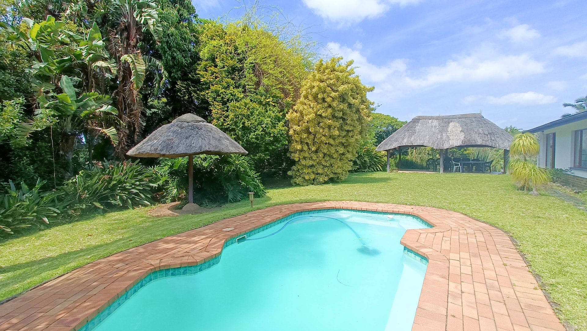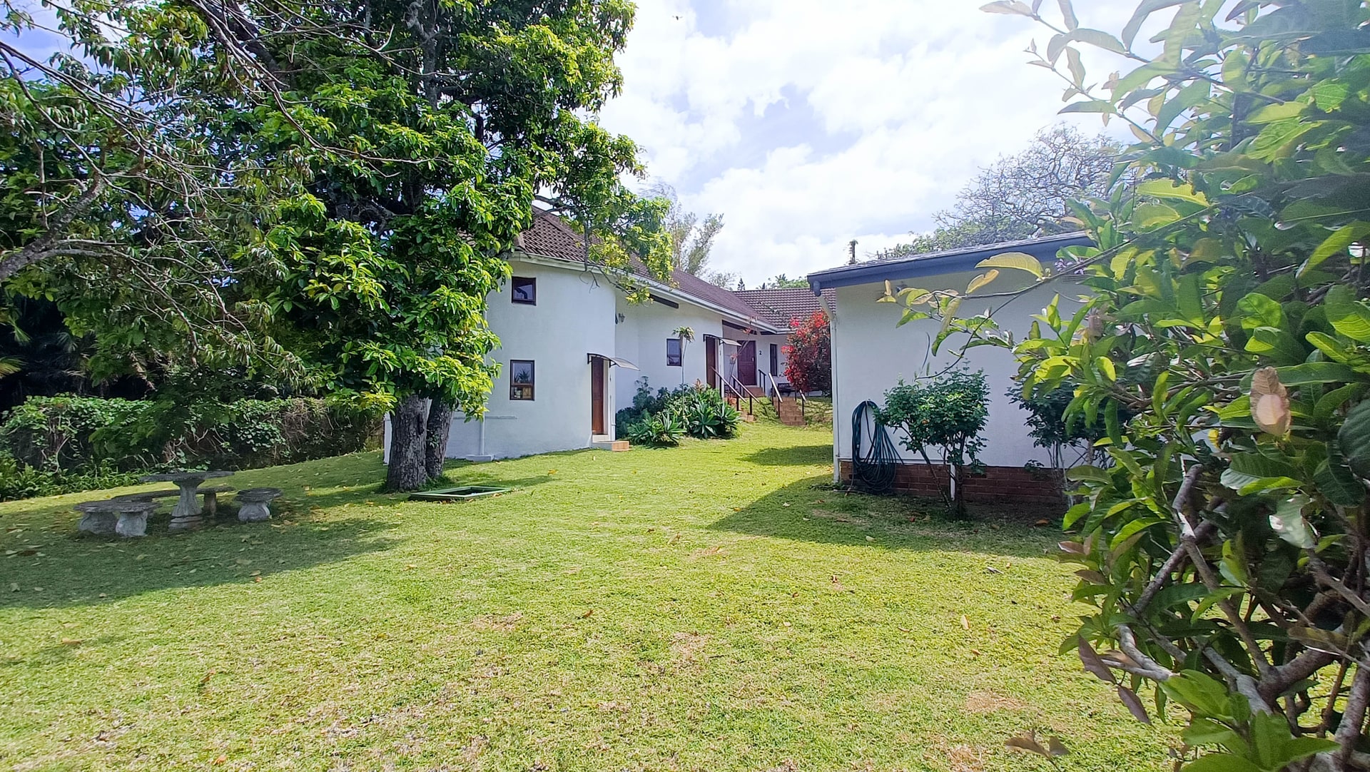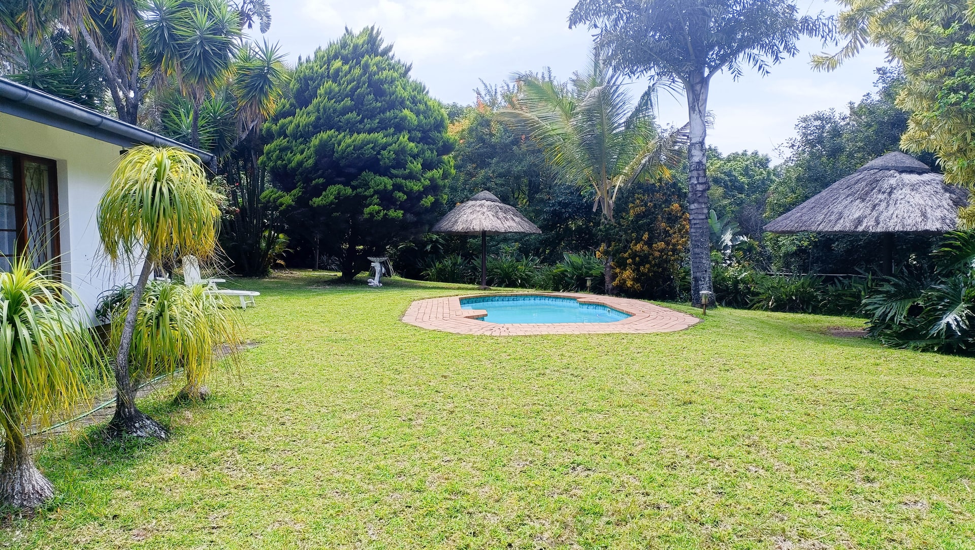 An income generating, farm style house is for sale in the upmarket suburb of Southbroom on the KZN South Coast. The property consists of 1, three-bedroom, 2-bathroom main house and 5, income generating cottages that can house between 4 to 7 people per room. The MAIN HOUSE: has 3 bedrooms with the main-en-suite and the second bathroom shared by the other 2 bedrooms. The house has a wonderful entrance hall that leads into the large main lounge with built in fireplace. Off the lounge is a small room currently used for storage. The kitchen is spacious enough and has a separate scullery and laundry facility. The Cottages: All five of the cottages are fully equipped for self catering and each have their own bathrooms. Four of the five cottages have 2 rooms that can accommodate small families or groups. Furniture in the cottages come with the sale. The property is large with most of it in natural bush and it is where the Bushbuck trail runs through. There is a deck that has a wonderful view overlooking the lush bush and trees with the distant ocean in view. The main house has a sparkling swimming pool with a built-in braai and Lapa for those beautiful African evening Set in amongst the tree is a Gazebo that one can have small functions or parties. Contact us for a viewing of this beautiful homestead.
