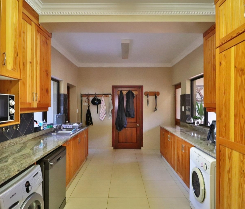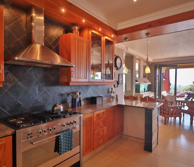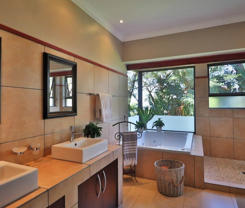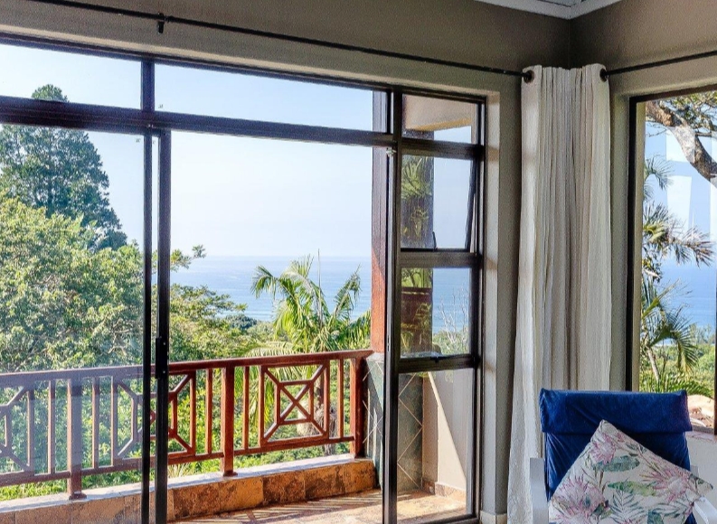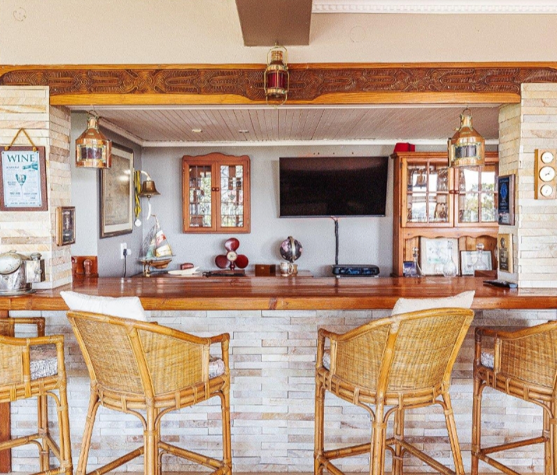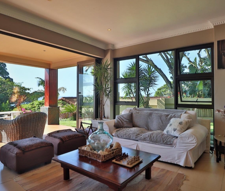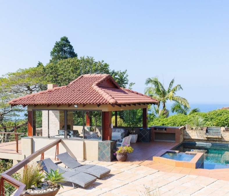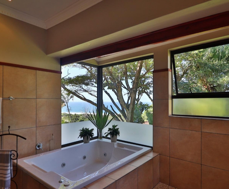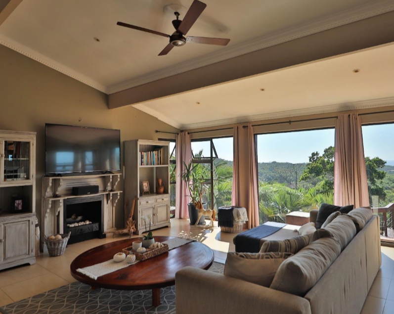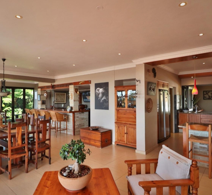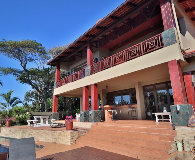 A breathtaking Bali-inspired sanctuary with panoramic sea and inland views. Perched in an elevated position within walking distance to the beach and golf course, this remarkable residence effortlessly blends tropical elegance with modern sophistication. A sweeping driveway welcomes you to the grand entrance, setting the tone for what lies beyond. The expansive open-plan living and dining areas flow seamlessly together, complemented by a chic built-in bar — perfect for both intimate gatherings and lavish entertaining. Stacking doors lead out to a spectacular entertainment haven featuring a partially covered patio, a charming gazebo, a built-in pizza oven, and a stunning rim-flow pool with jacuzzi — all framed by endless coastal vistas. The designer kitchen boasts granite countertops, ample cabinetry, and a separate scullery/laundry for added convenience. A private guest suite downstairs opens to a tranquil garden patio, offering guests their own secluded retreat. Upstairs, two beautiful bedrooms open onto a shared balcony where ocean breezes and sunrise views await. The master suite is a true sanctuary — complete with a spa-style bathroom, dressing room, and sweeping views from every angle. A spacious family lounge with exposed trusses adds a touch of architectural flair and warmth. The property also includes a self-contained one-bedroom flat with its own entrance, ideal for rental income, extended family, or staff accommodation. An additional office or potential second flat enjoys lovely elevated views. Two double garages offer ample parking — one with direct access to the home and another with an attached storeroom. Additional features include a 5000L water tank with pump, full generator wiring, automated gates, CCTV, and exterior beams for peace of mind. Every inch of this home exudes sophistication, privacy, and coastal luxury — the perfect blend of resort-style living and everyday comfort.