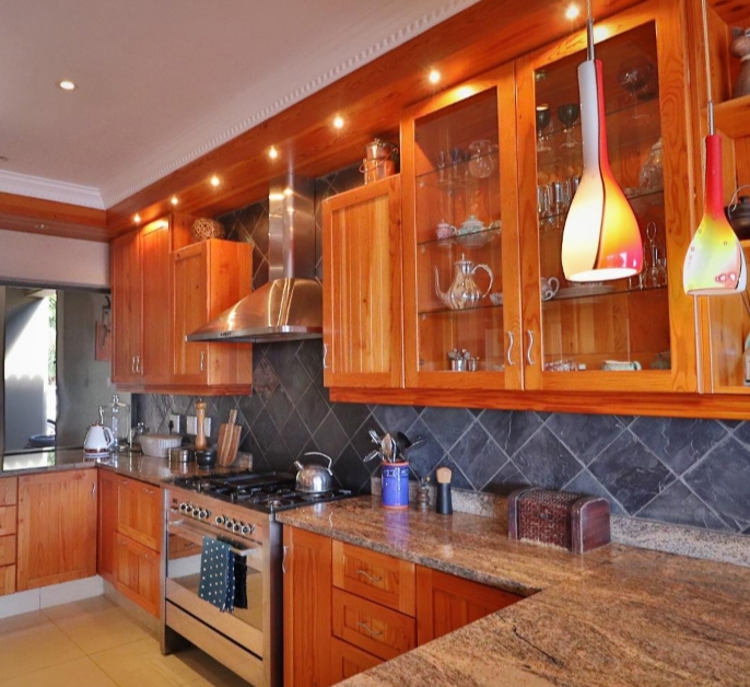 Two double garages offer ample parking — one with direct access to the home and another with an attached storeroom. Additional features include a 5000L water tank with pump, full generator wiring, automated gates, CCTV, and exterior beams for peace of mind.
