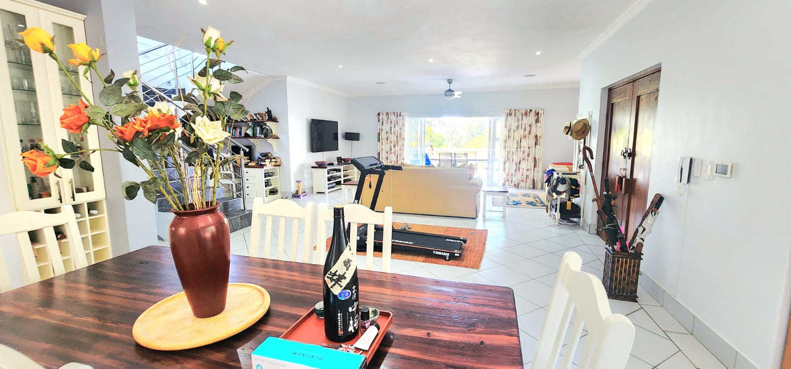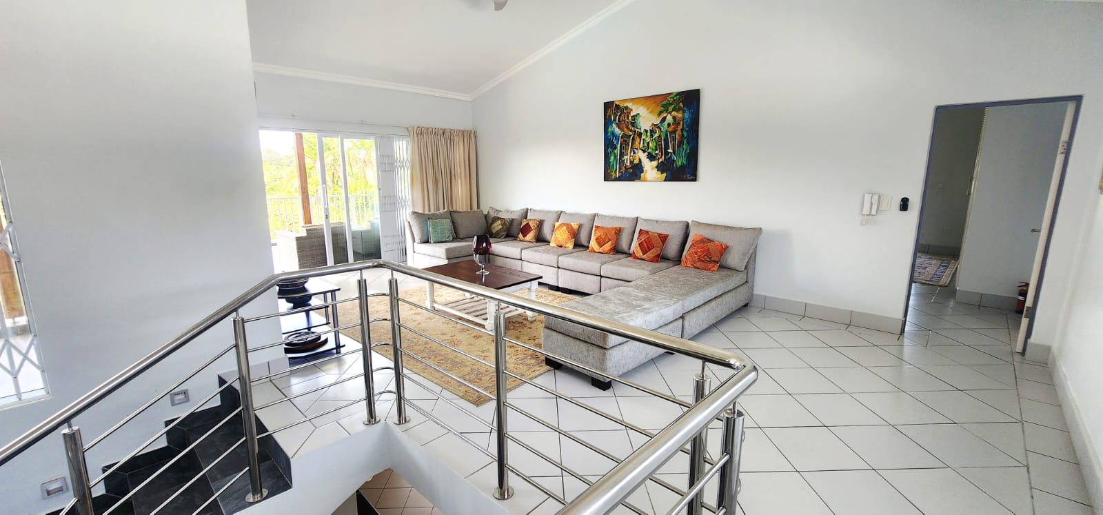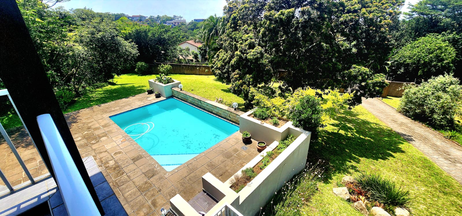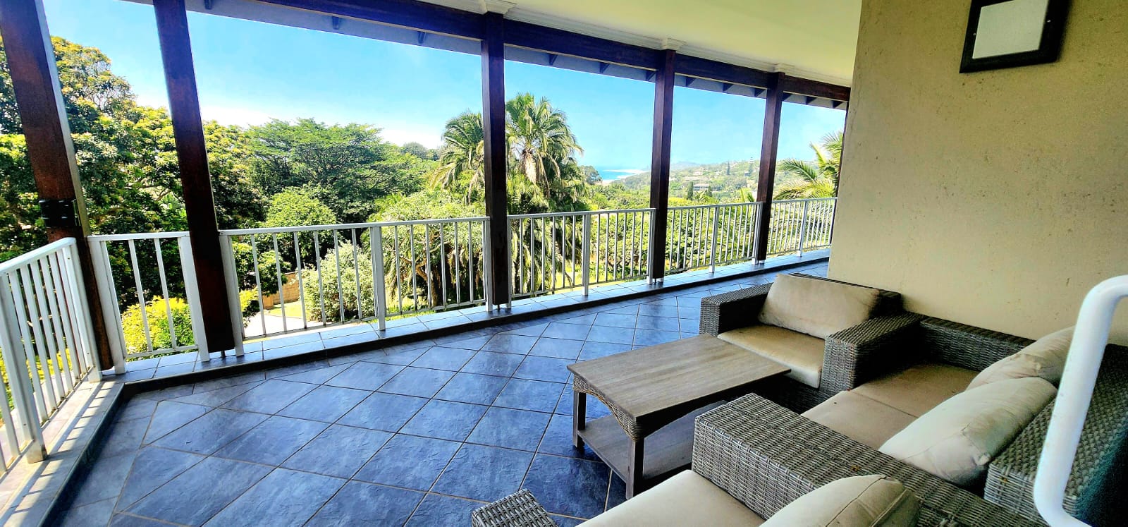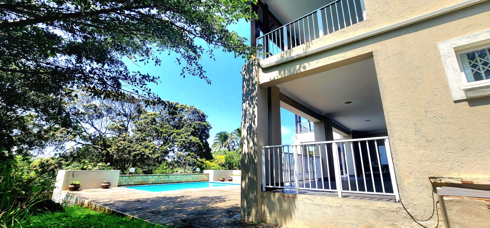 Set on a large stand of 6,537m2, with rolling lawns and large indigenous trees, is this sprawling home of 791m2. A paved driveway leads to this magnificent home, with 2 automated garages and a golf cart garage or small workshop. A drive through portico welcomes one, this flows to the double hand carved entrance doors to the large open plan living area, consisting of a modern kitchen (granite tops, laundry, gas hob, eye level oven and breakfast counter) dining area and lounge which opens to the enclosed patio with the entire front equipped with stacker doors, which also give access to the entertainment area with gas braai and a large swimming pool. There are 2 large bedrooms on this level, one is ensuite and both open to the covered patio, also overlooking the garden and pool deck. There is also a family bathroom with a separate loo, perfect for the guests. There is an office space adjacent to the dramatic stairway, which takes one to another lounge/pajama lounge (doors opening to the upstairs covered balcony) this leads to the open plan area currently used as a music room with a coffee station (doors to the balcony as well) and on to the 3rd bedroom also ensuite and also with doors to the balcony. On the opposite side of this level is the main suite, which is extra large and can accommodate a lounge area as well, a walk through bank of cupboards leads to the dramatic main ensuite bathroom (oval bath with large pane windows offering amazing ocean views, an extra large shower, loo and double vanity) This bedroom also opens to the covered balcony, offering amazing breaker views. The home has aircons in the dining and lounge areas and the main bedroom, there is surround sound throughout the home, alarm system and beams and strategically placed security lighting around the entire boundary wall which also has electric fencing. The home is off the grid with an efficient high end solar system and there are 3 X 5,000l water tanks for back-up. There is a one bedroom flat at the back of the property, with an open plan lounge/kitchenette and a bathroom. This attractive home with full width patios and balcony's resembles the Natal Colonial style homes from the earlier years.