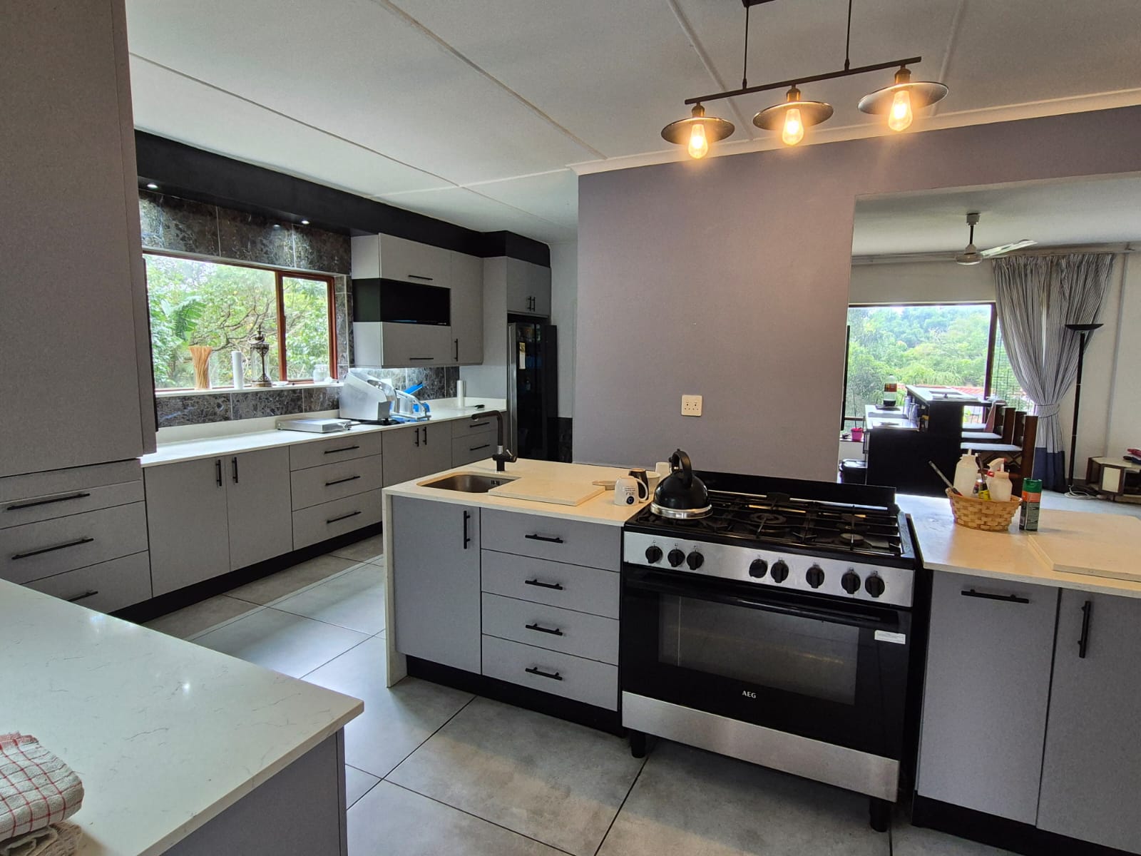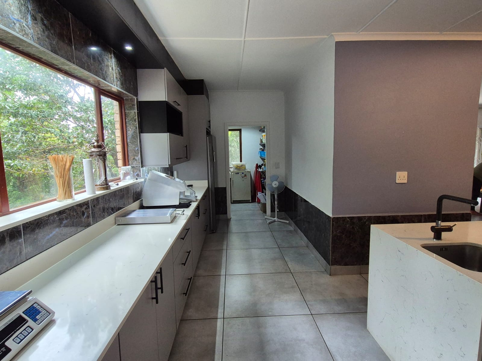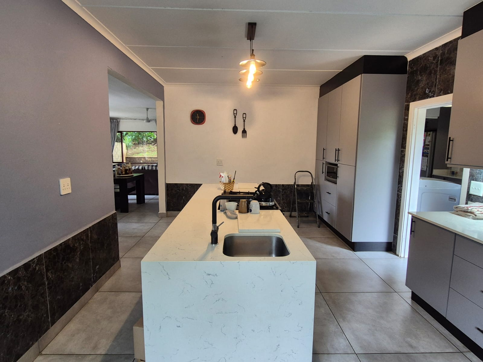 The sleek, contemporary kitchen is a chef’s dream, featuring a central island, gas hob, eye-level oven, and ample cabinetry. A walk-in pantry and separate scullery/laundry add everyday convenience.
