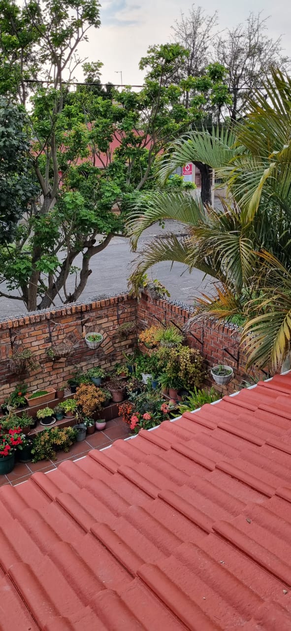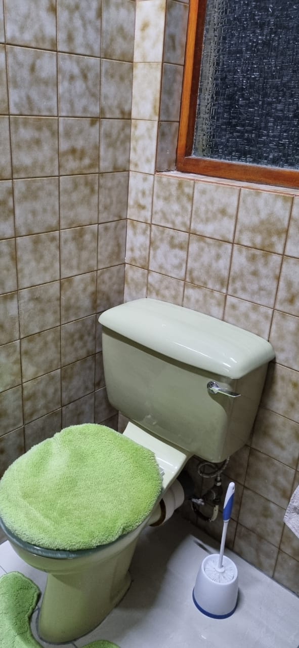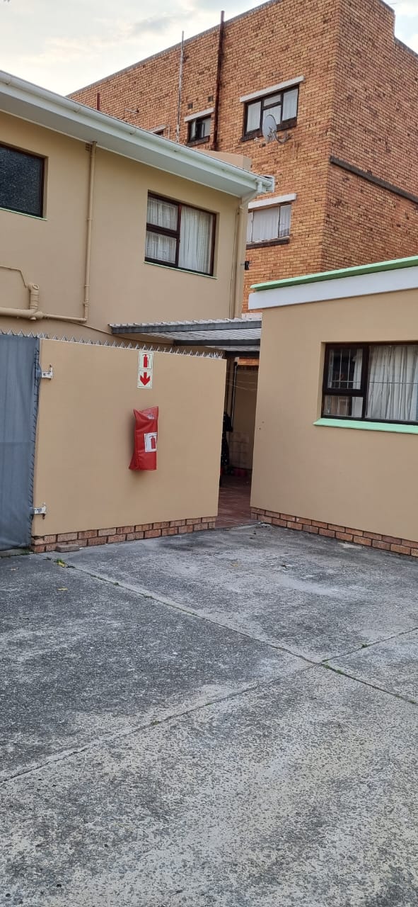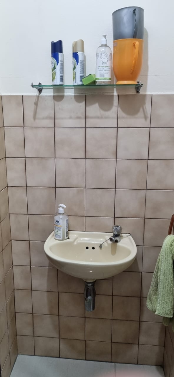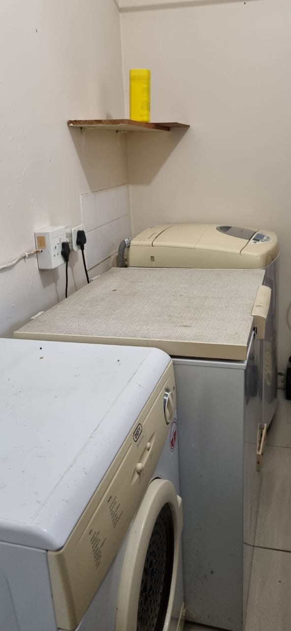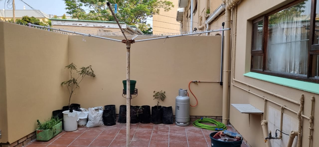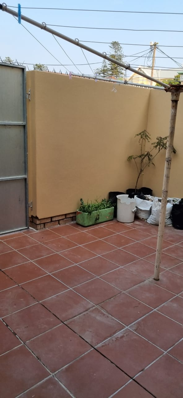 A private courtyard with washing line, domestic room, and a bathroom with shower and toilet