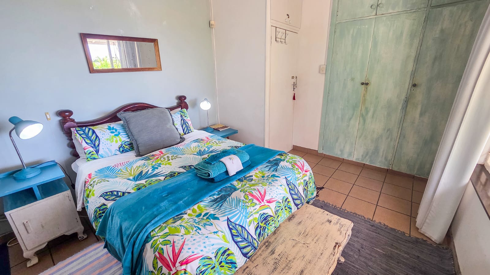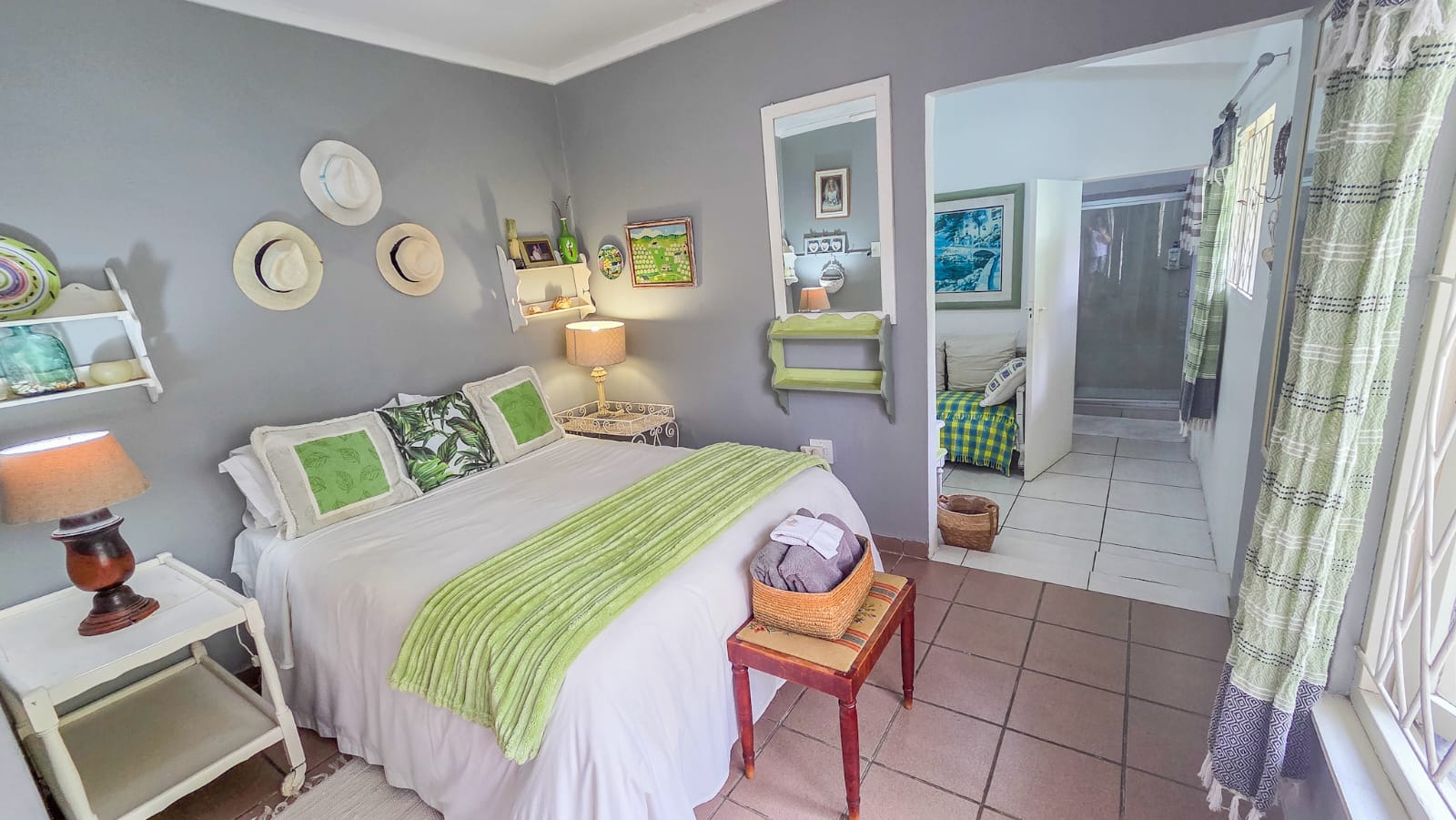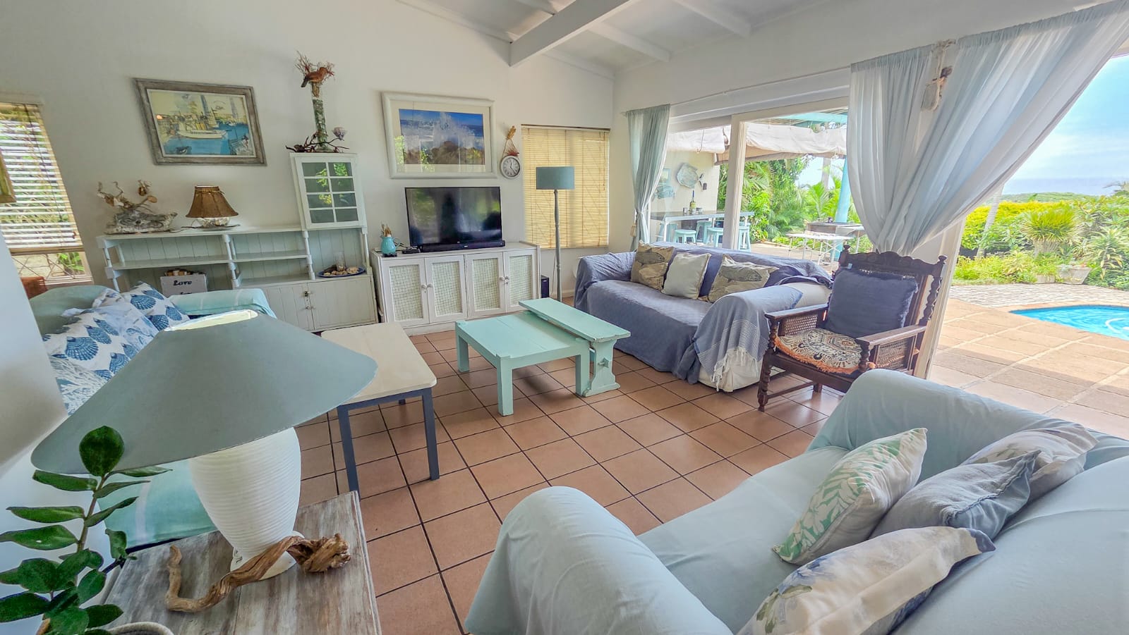 Outside, you’ll find a variety of inviting spaces to relax and unwind. Enjoy sundowners in the tranquil outdoor area, host friends at the braai area overlooking the sparkling blue swimming pool, or retreat to the cozy patio to read a book while taking in the sunrise or sunset with a cup of coffee.