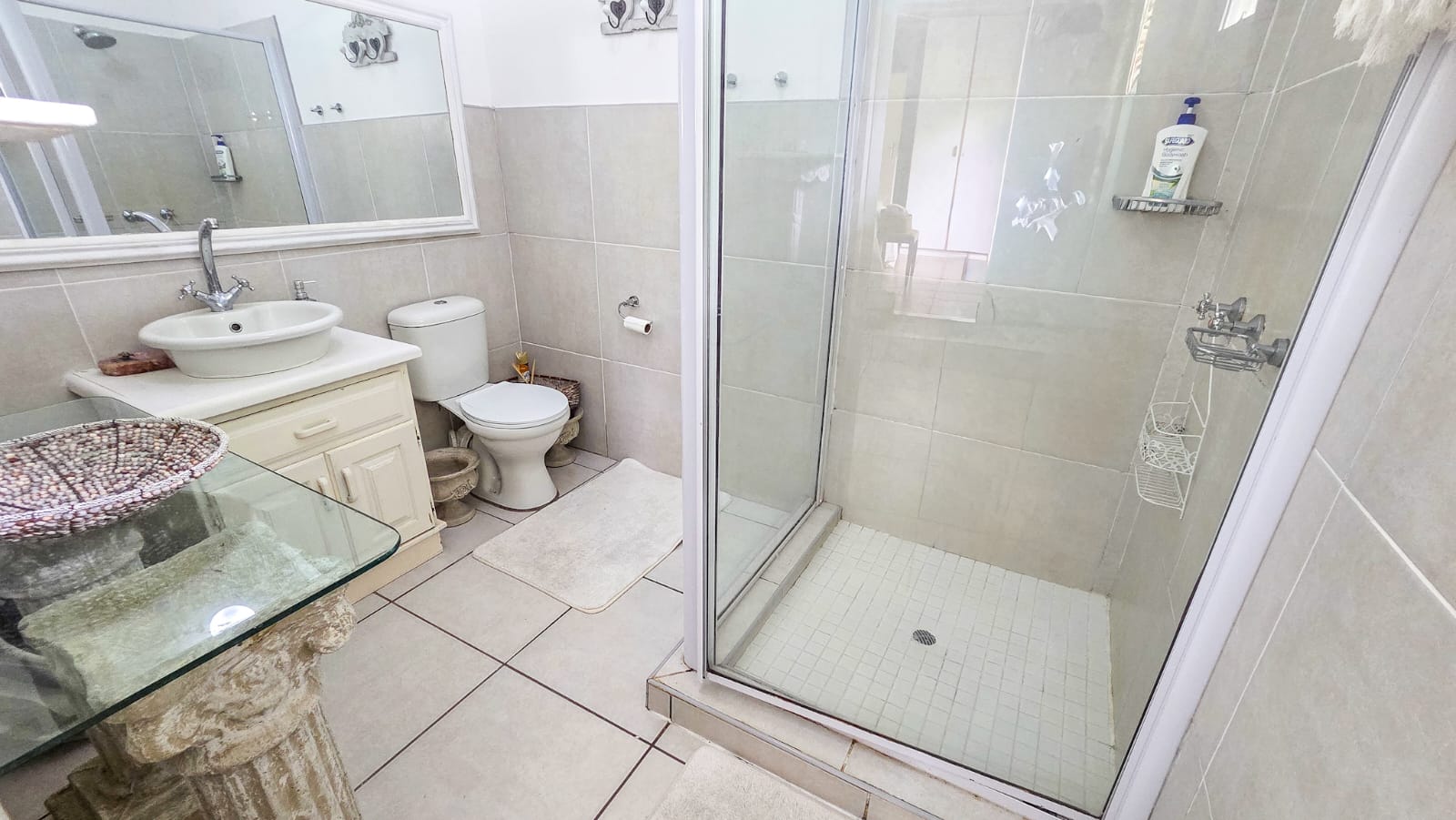The main house features five spacious bedrooms and three bathrooms. Most of the bedrooms are fitted with built-in cupboards, while two bedrooms boast en-suite bathrooms equipped with a shower, basin, and toilet. The third bathroom is a full bathroom, offering a bath, shower, basin, and toilet.