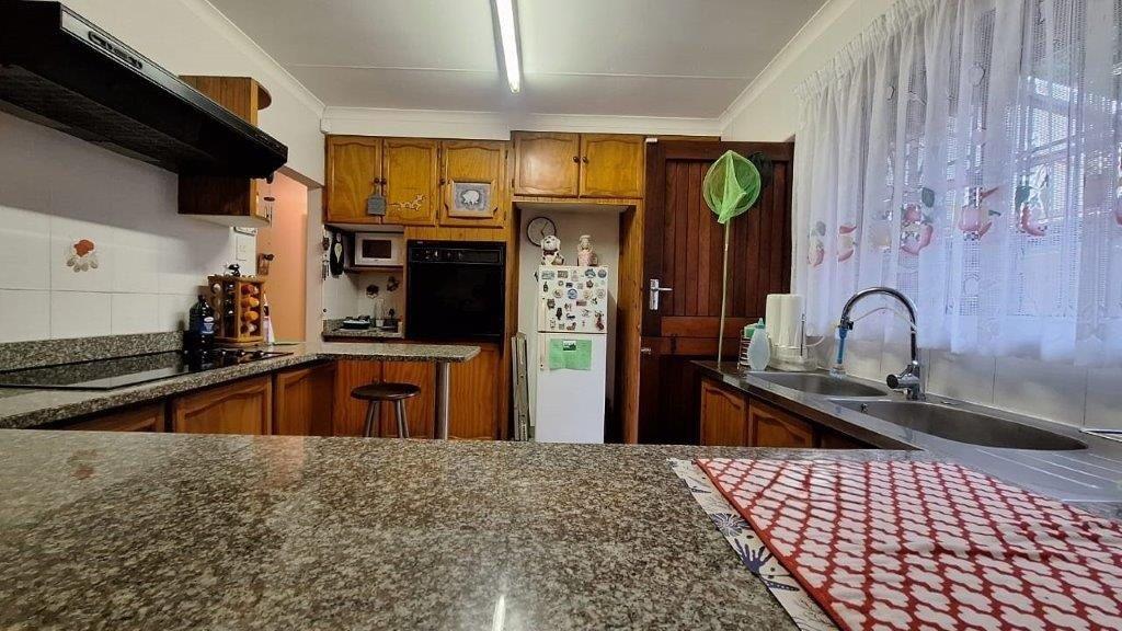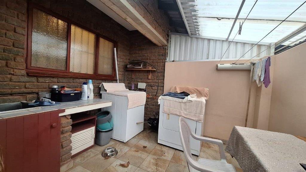 The kitchen boasting solid timber cupboards for ample storage, granite countertops for durability and elegance, and a pantry for extra space. A covered and sheltered outdoor area adjacent to the kitchen is equipped for washing appliances, ensuring practicality and functionality.