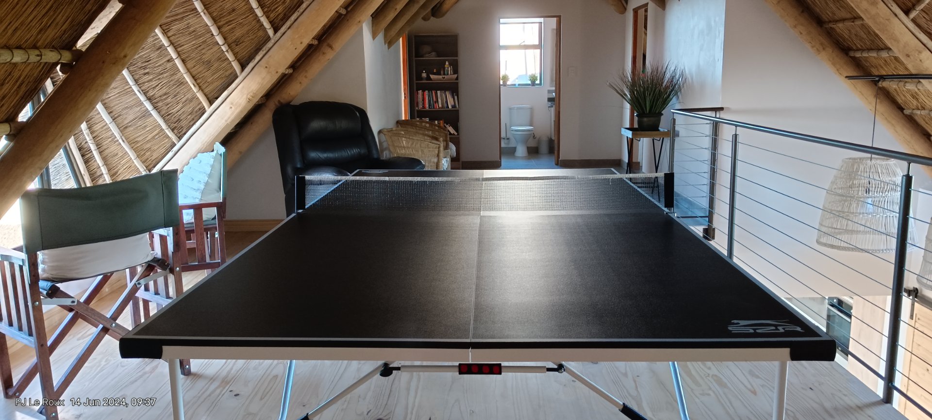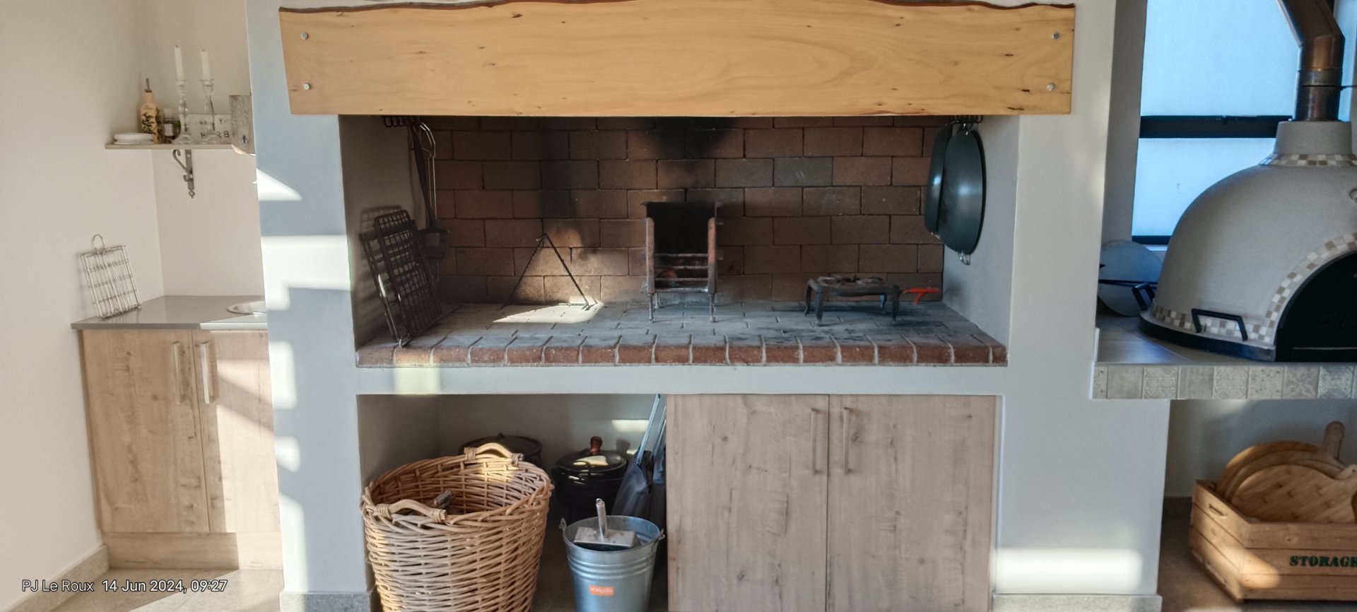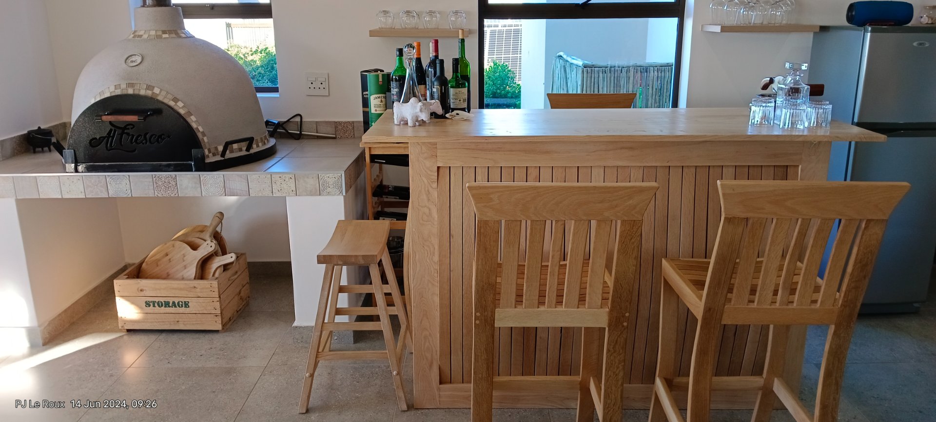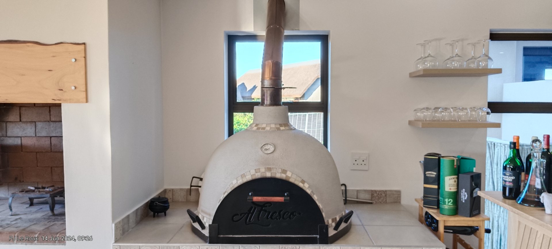 Enjoy seamless indoor-outdoor living with front stack doors that flood the interiors with natural light and provide uninterrupted views. The open-plan living areas are perfect for entertaining, featuring a well-appointed kitchen with a wood-burning pizza oven, indoor braai, and sophisticated bar area.