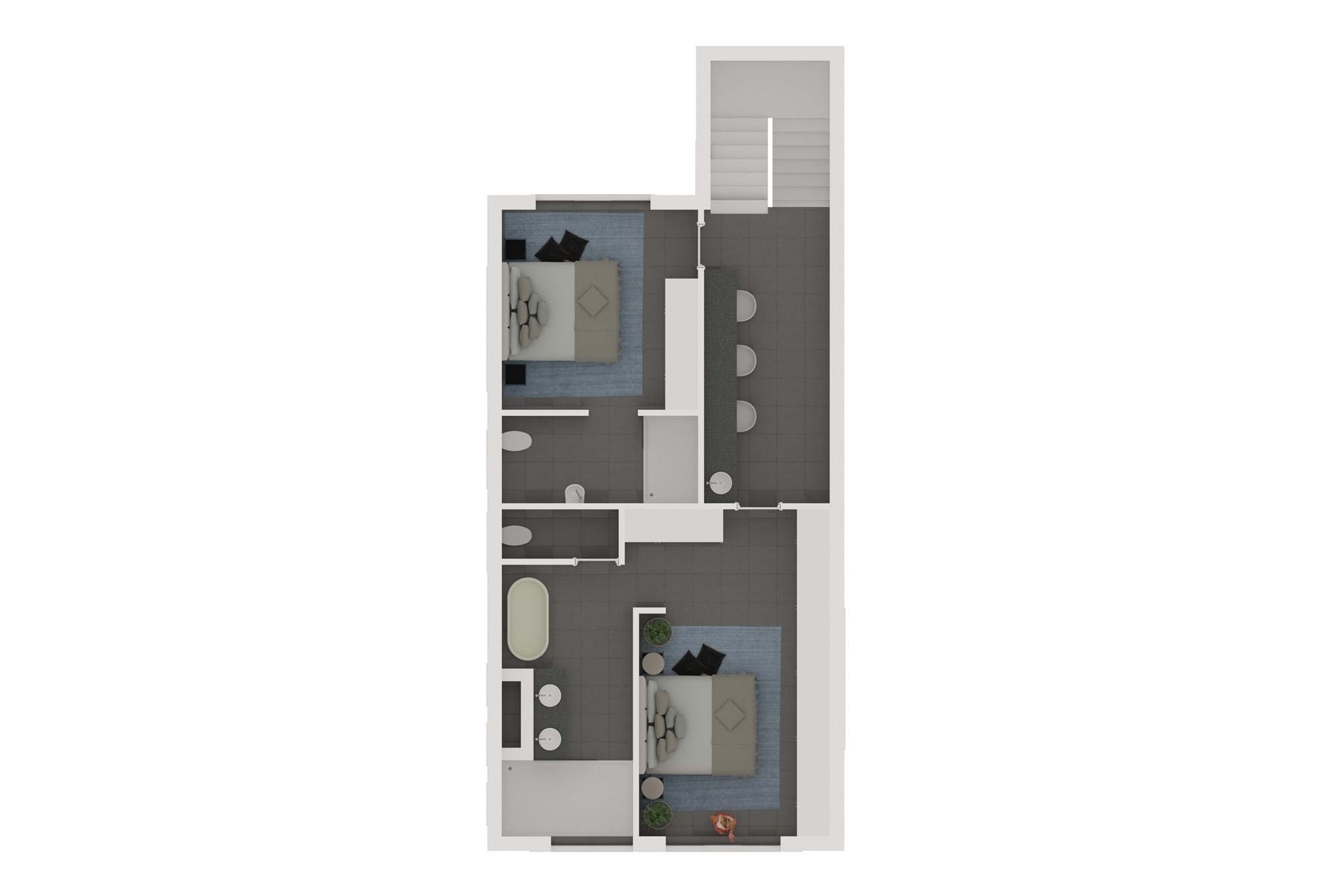 Upstairs, two additional en-suite bedrooms are separated by a versatile study nook — ideal for working from home, quiet reading, or homework. High ceilings, tiled roofs, and large aluminium windows fill the home with natural light and create a bright, airy atmosphere throughout.