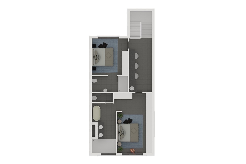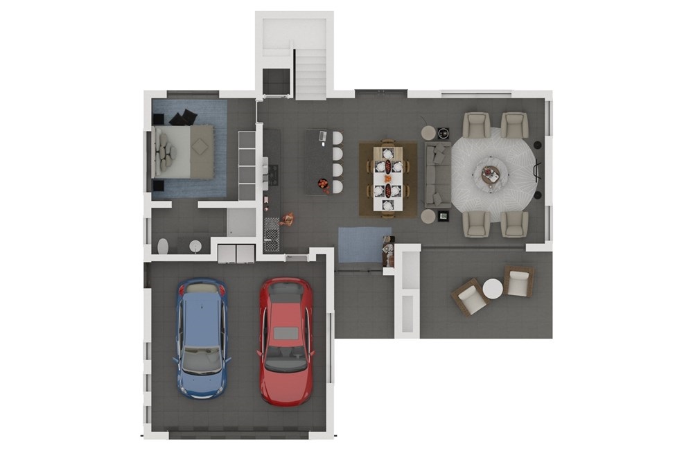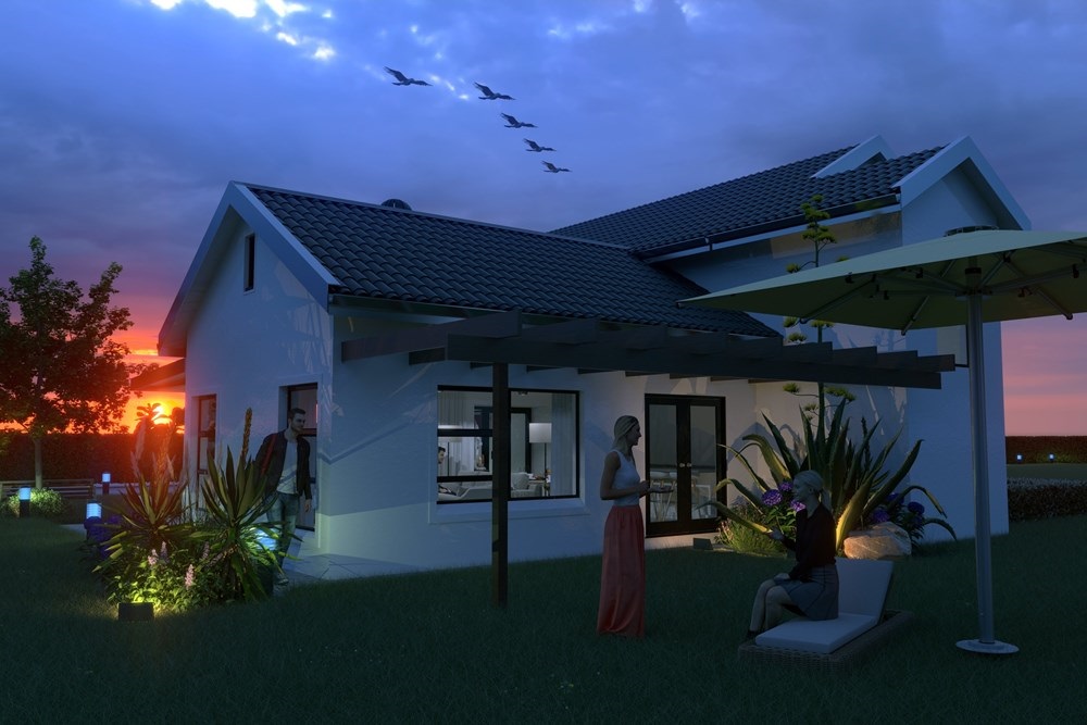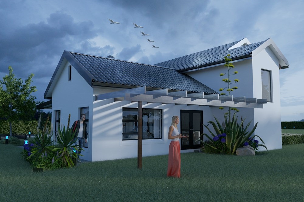 Each plot-and-plan package ensures a stress-free build process, managed from start to finish by experienced developers. These thoughtfully designed double-storey homes boast open-plan living with modern finishes, high ceilings, and large aluminium windows that flood the interiors with abundant natural light. A spacious double garage provides direct access to the kitchen, which flows seamlessly into a bright lounge and dining area. Sliding doors lead to a covered patio with a built-in braai, perfect for entertaining or enjoying coastal sunsets. On the ground floor, an en-suite bedroom is ideal for guests or those preferring single-level living, while upstairs, two additional en-suite bedrooms flank a versatile study nook, making it perfect for remote work or relaxation.