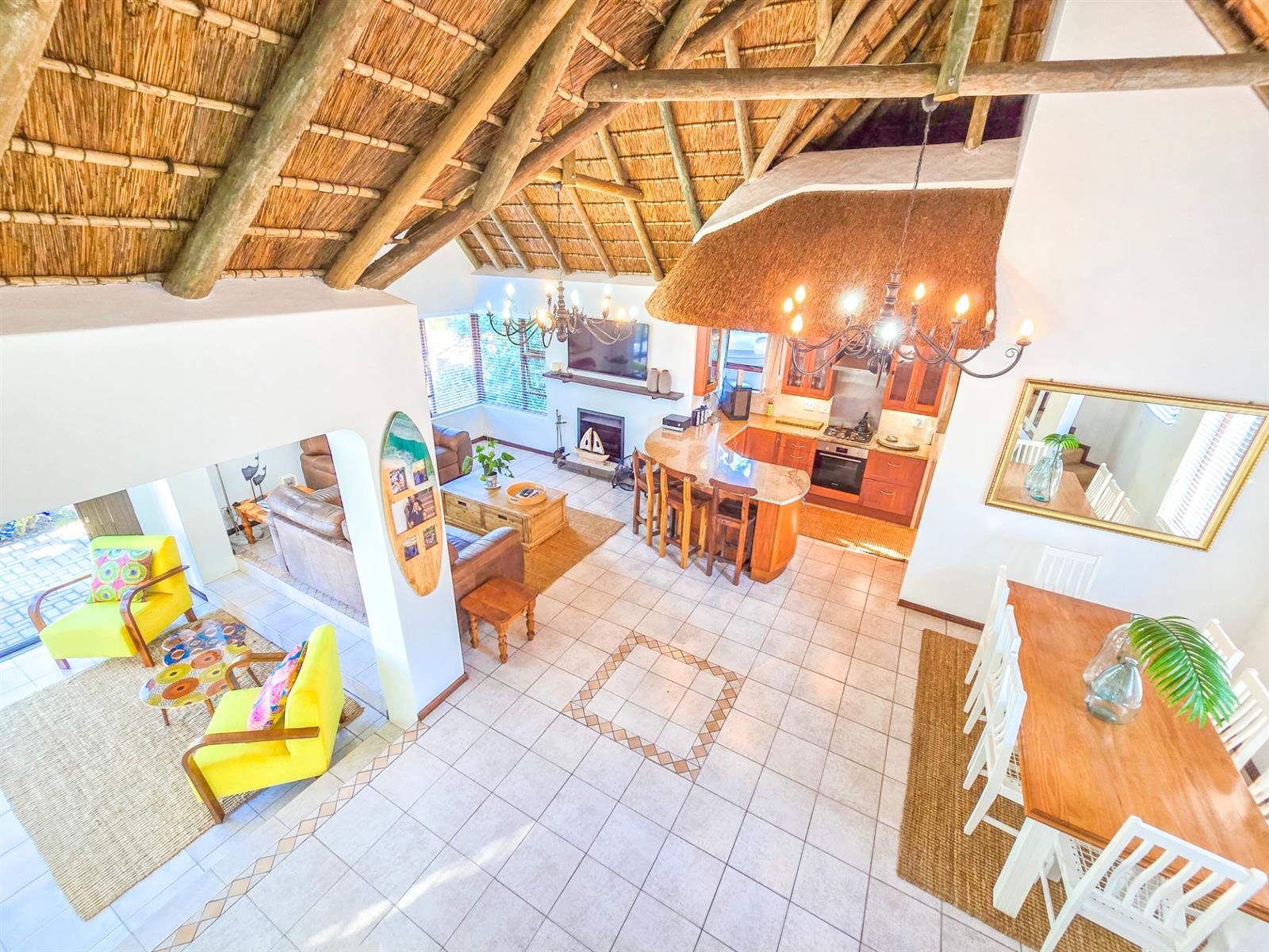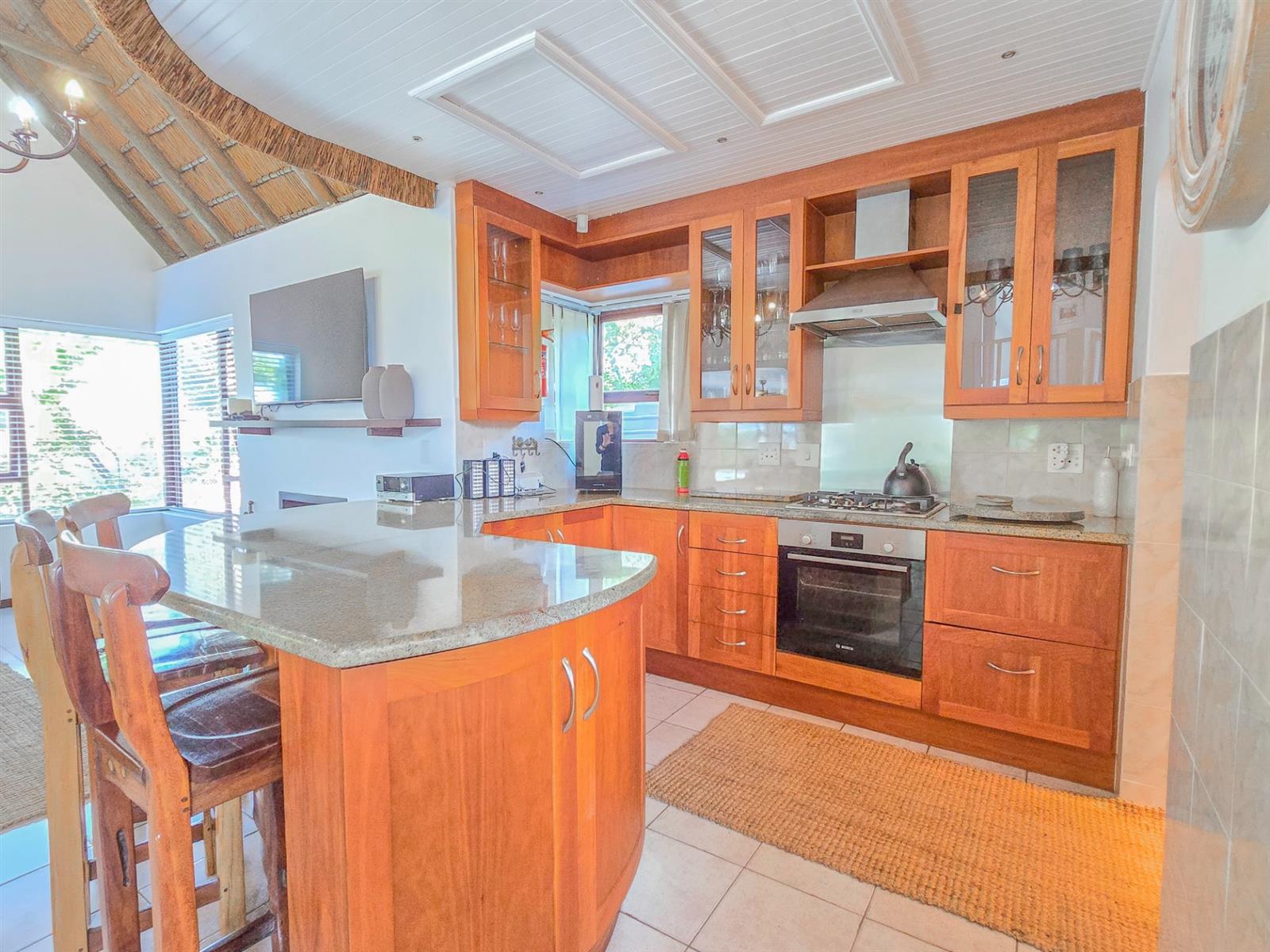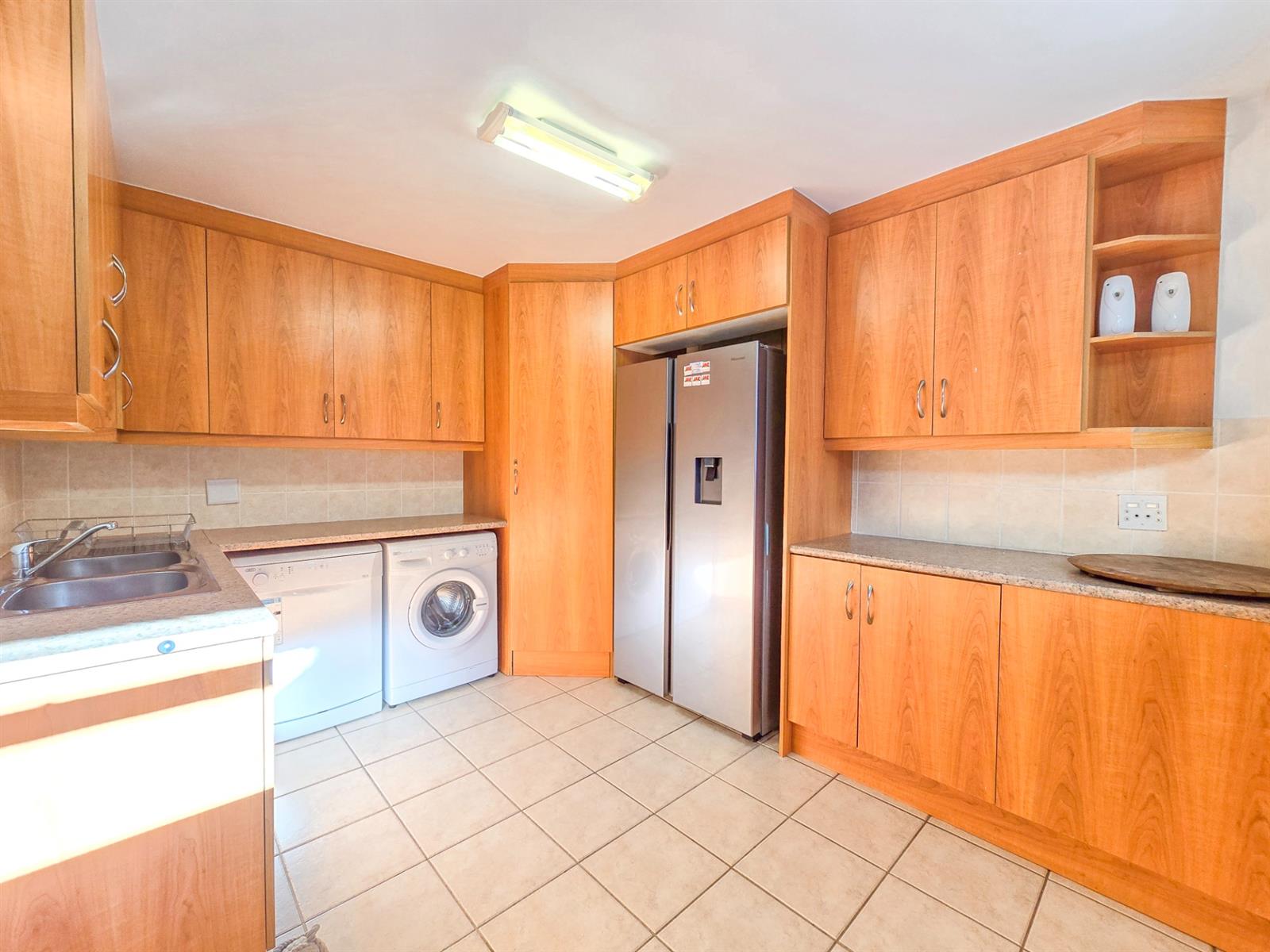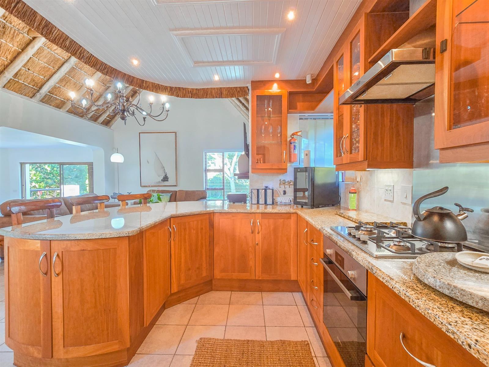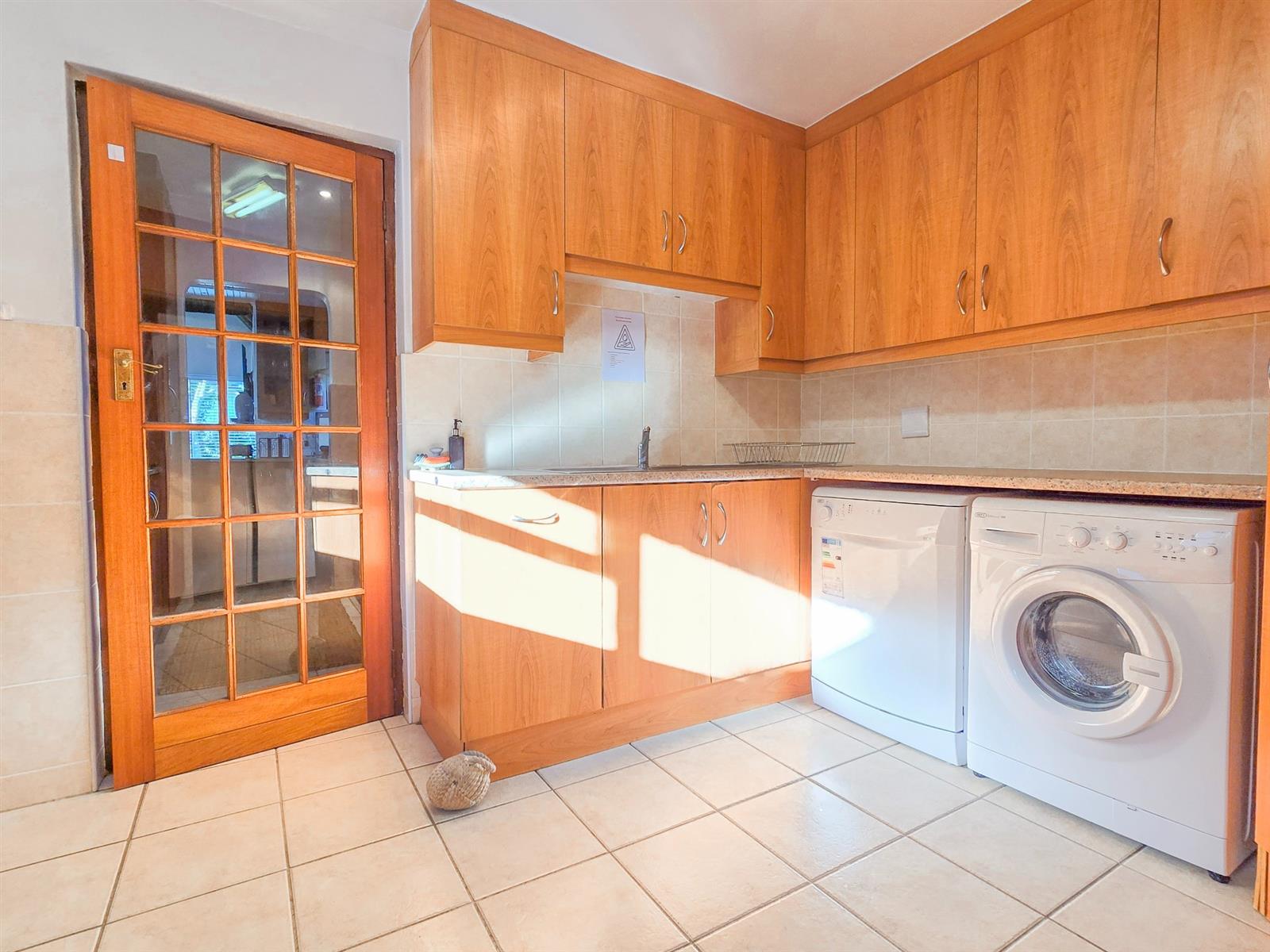 At the heart of the home is a bright, open-plan living space where the lounge with fireplace, TV area, dining space, and kitchen come together effortlessly — ideal for everyday family living and relaxed entertaining. The kitchen is fitted with granite countertops and generous cupboard space, complemented by a spacious scullery that incorporates the laundry, pantry, and utility area, neatly tucked away from the main living areas.