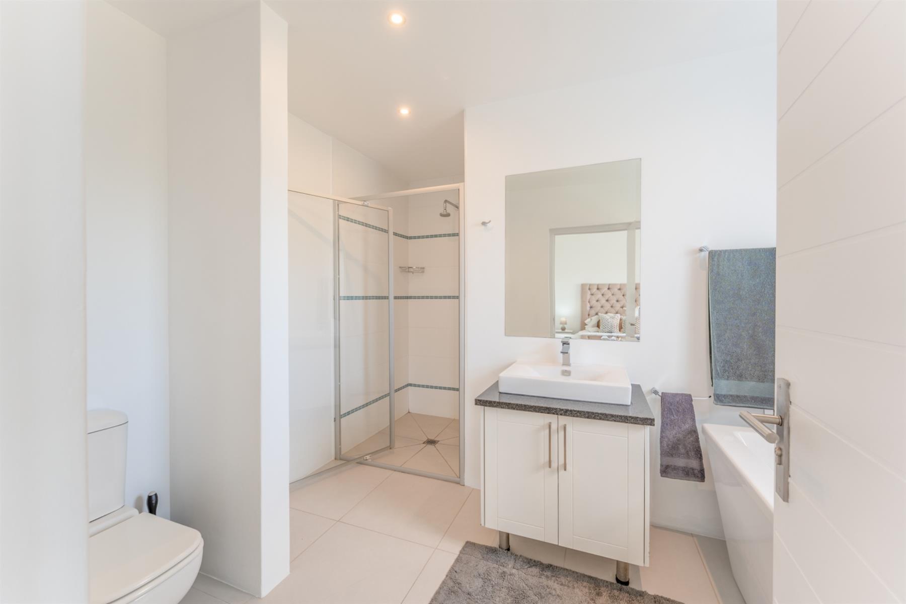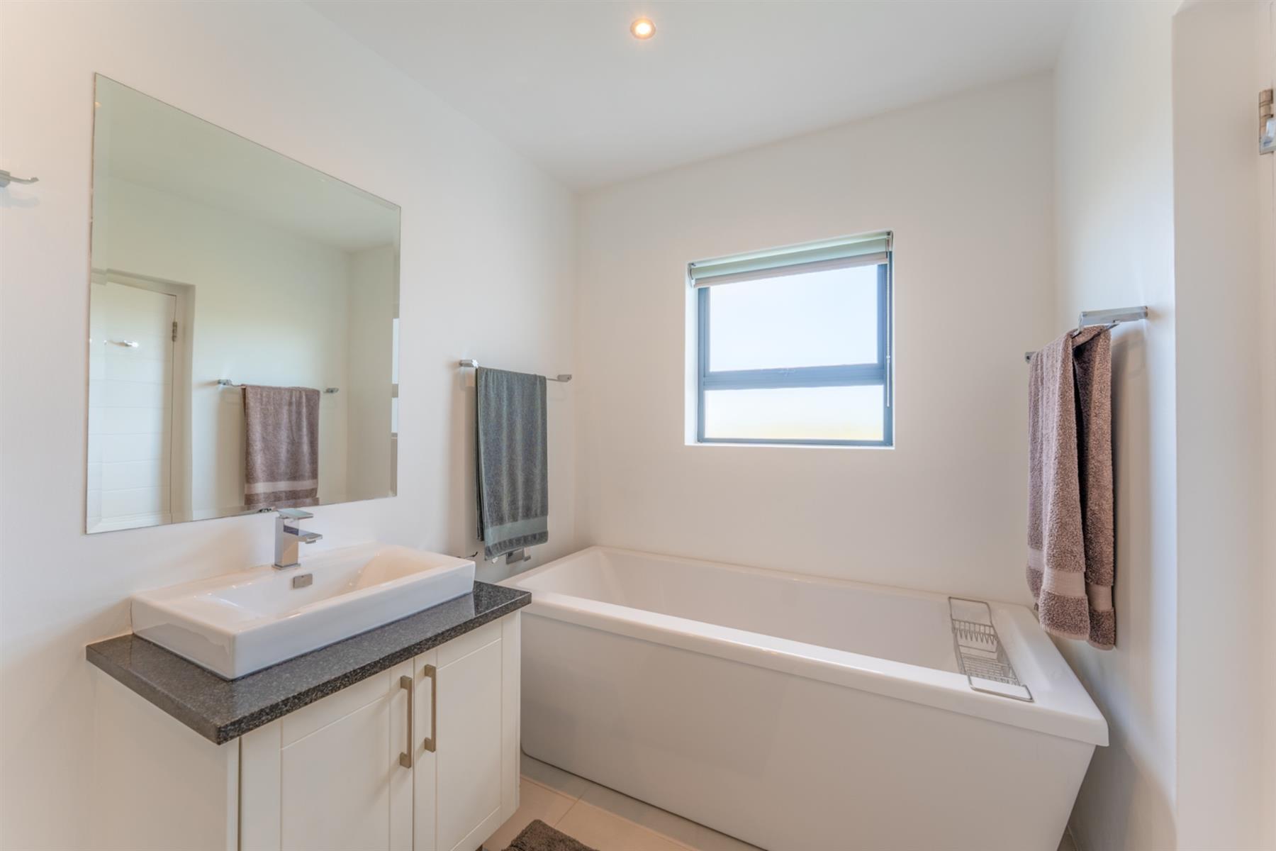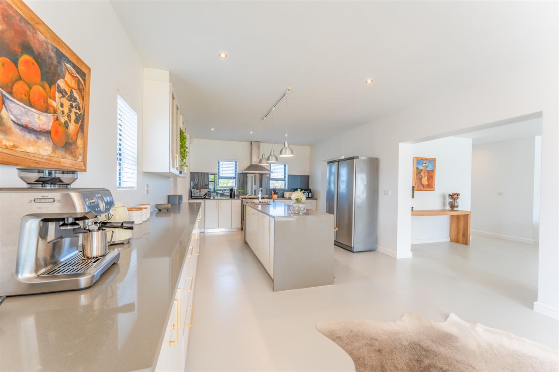 At the heart of the home is a gourmet kitchen with a scullery and breakfast nook, seamlessly blending style and functionality. Accommodation includes four generously sized bedrooms and three-and-a-half bathrooms. A ground-floor en-suite bedroom provides convenient guest quarters, while the primary suite upstairs is a true retreat, offering a walk-in dressing area with built-in cupboards, a luxurious en-suite with double vanity, walk-in shower, and a freestanding bath with uninterrupted golf course views.