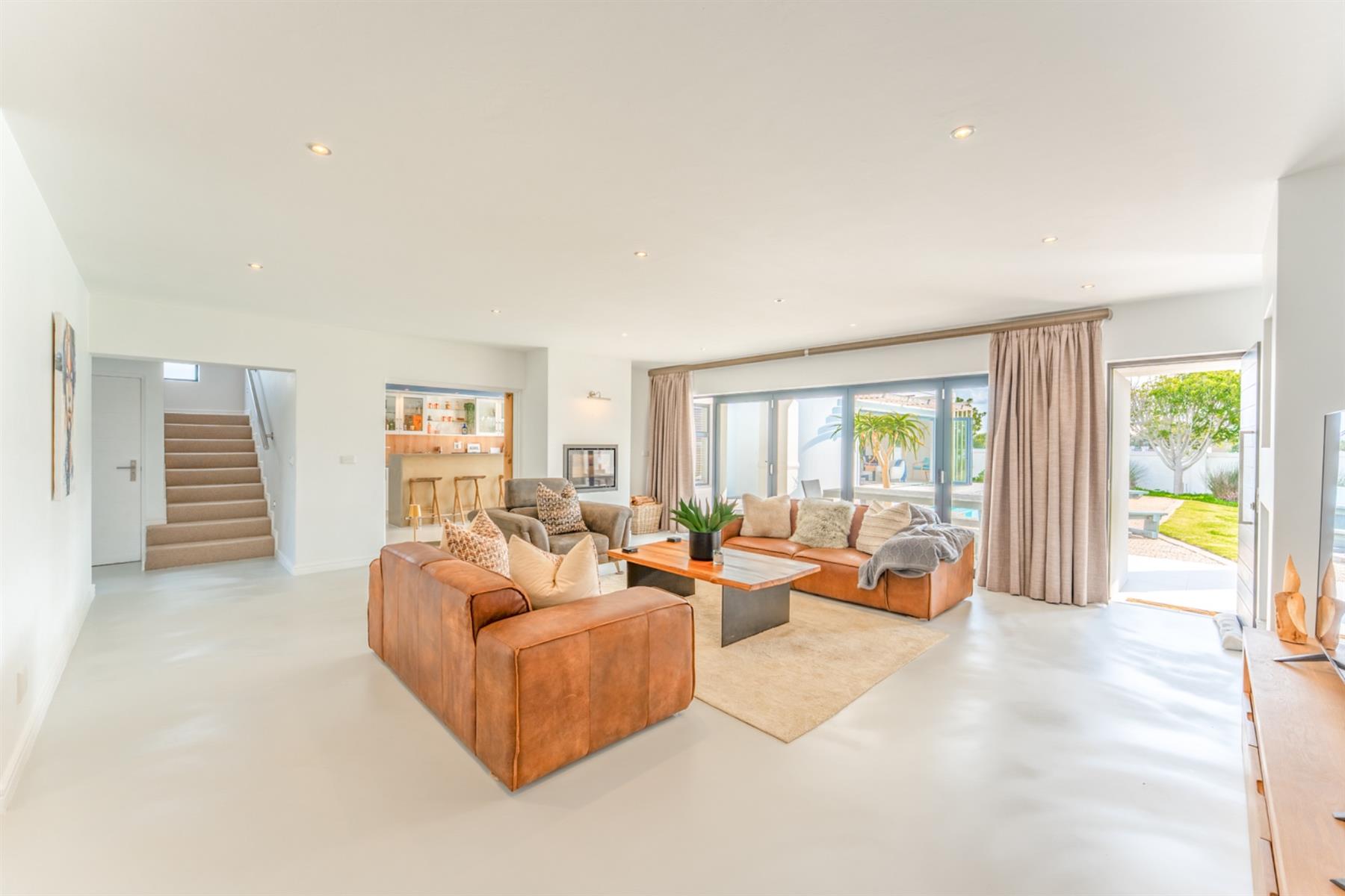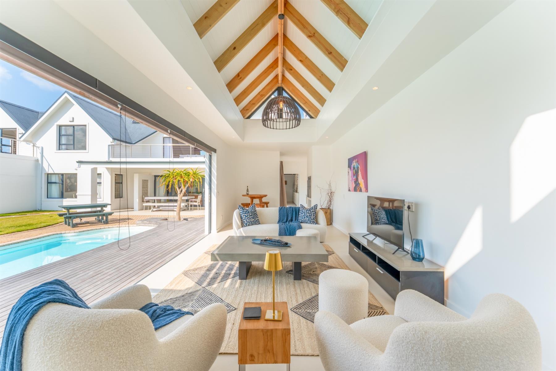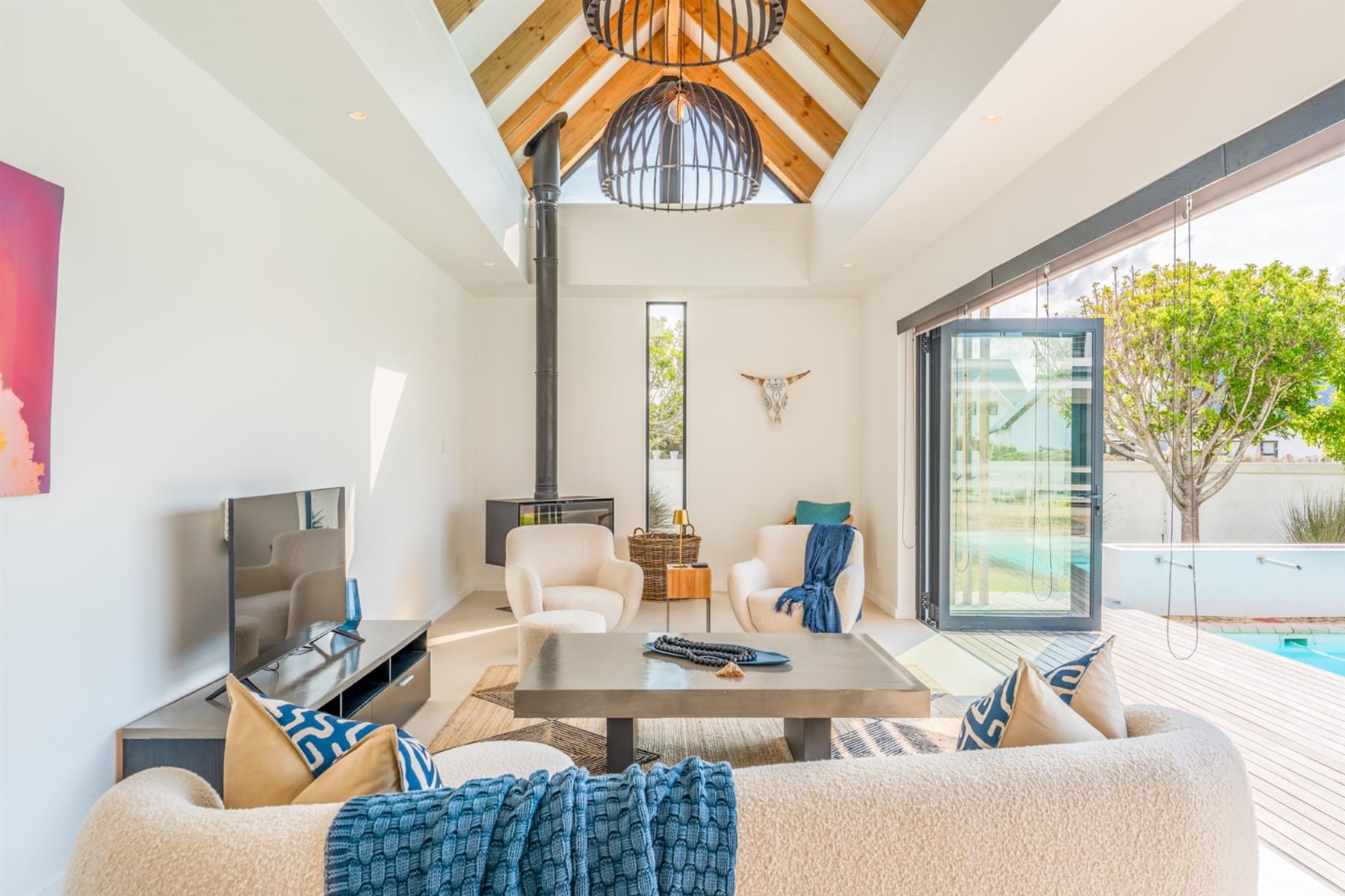 Inside, the home is designed for versatility and comfort, featuring three distinct lounge areas and a thoughtfully designed entertainment space. A sophisticated built-in bar with custom cabinetry leads to the indoor braai area, which flows into a luxurious lounge complete with a cozy fireplace. From here, stacker doors open onto a private heated pool oasis, creating the ultimate year-round entertaining space.