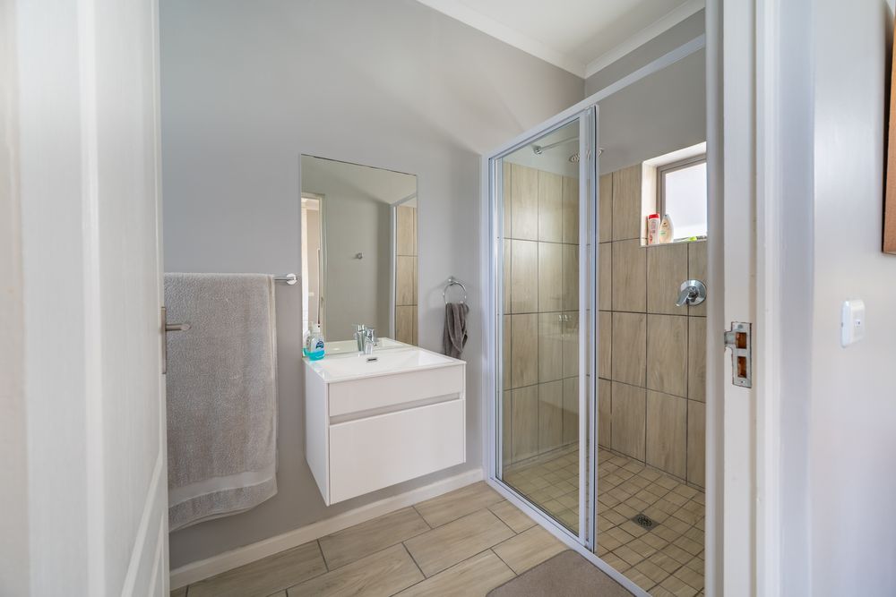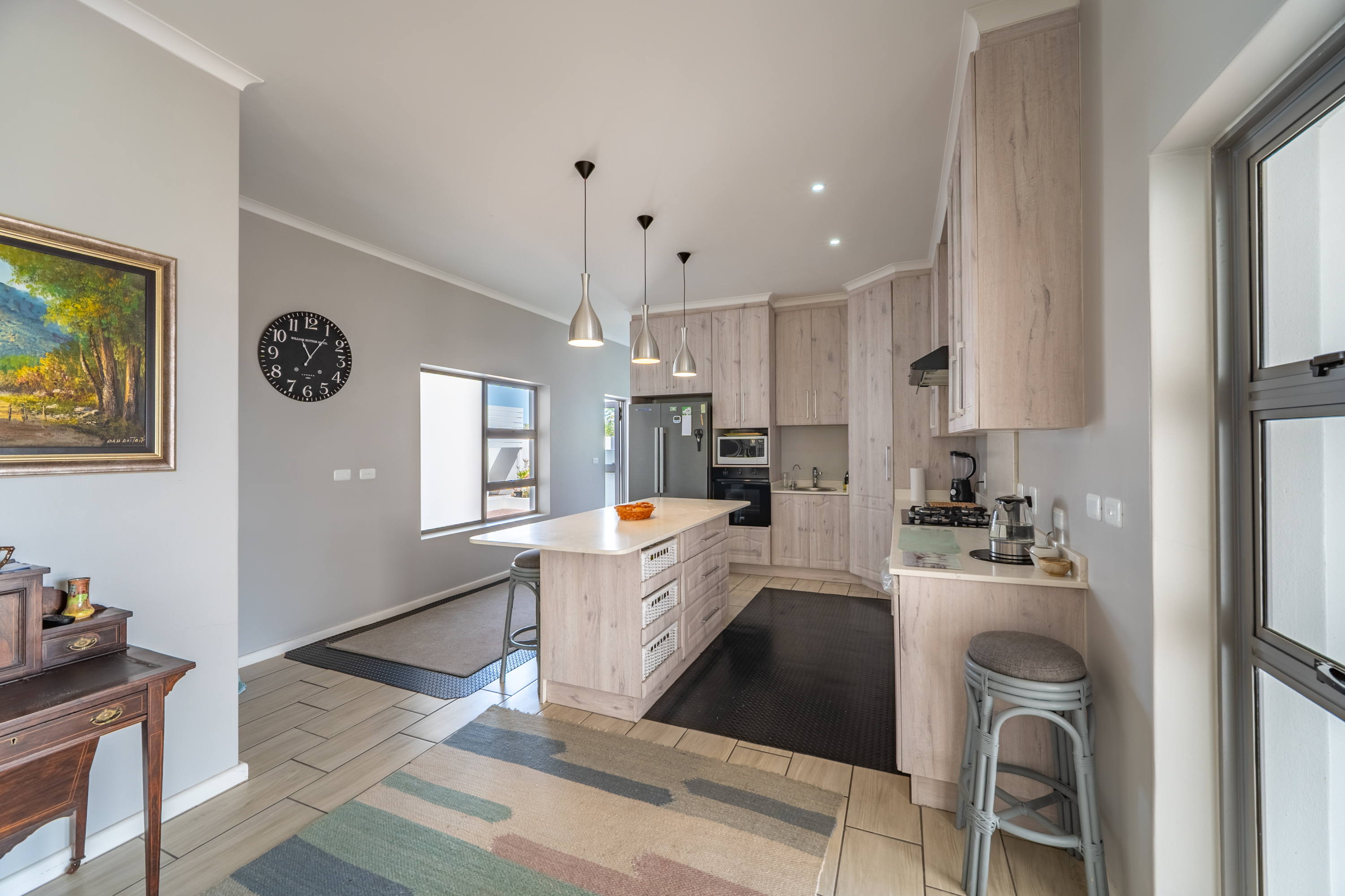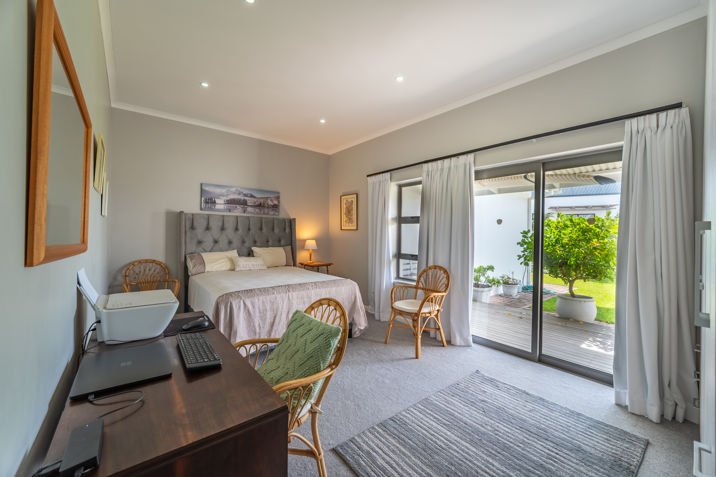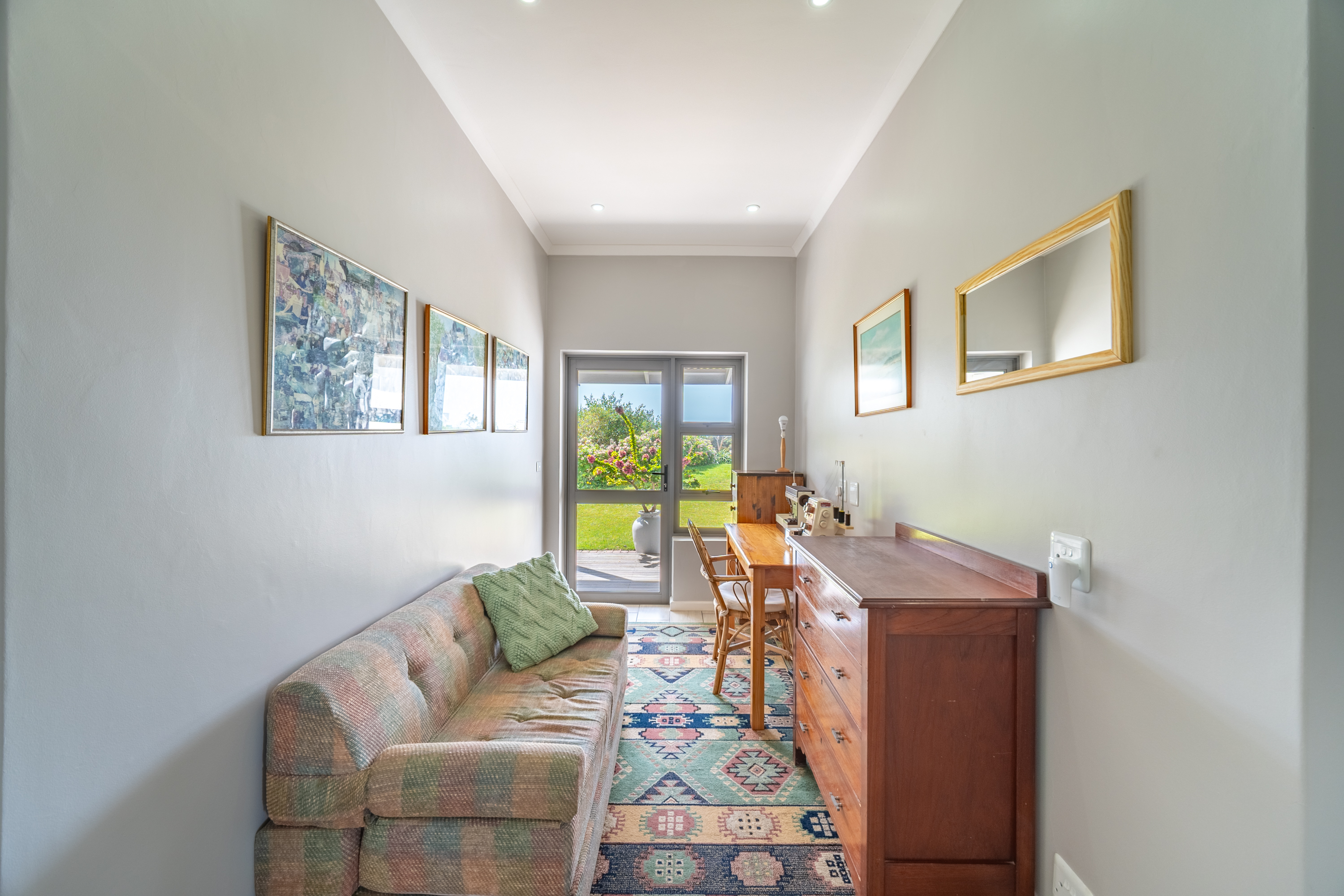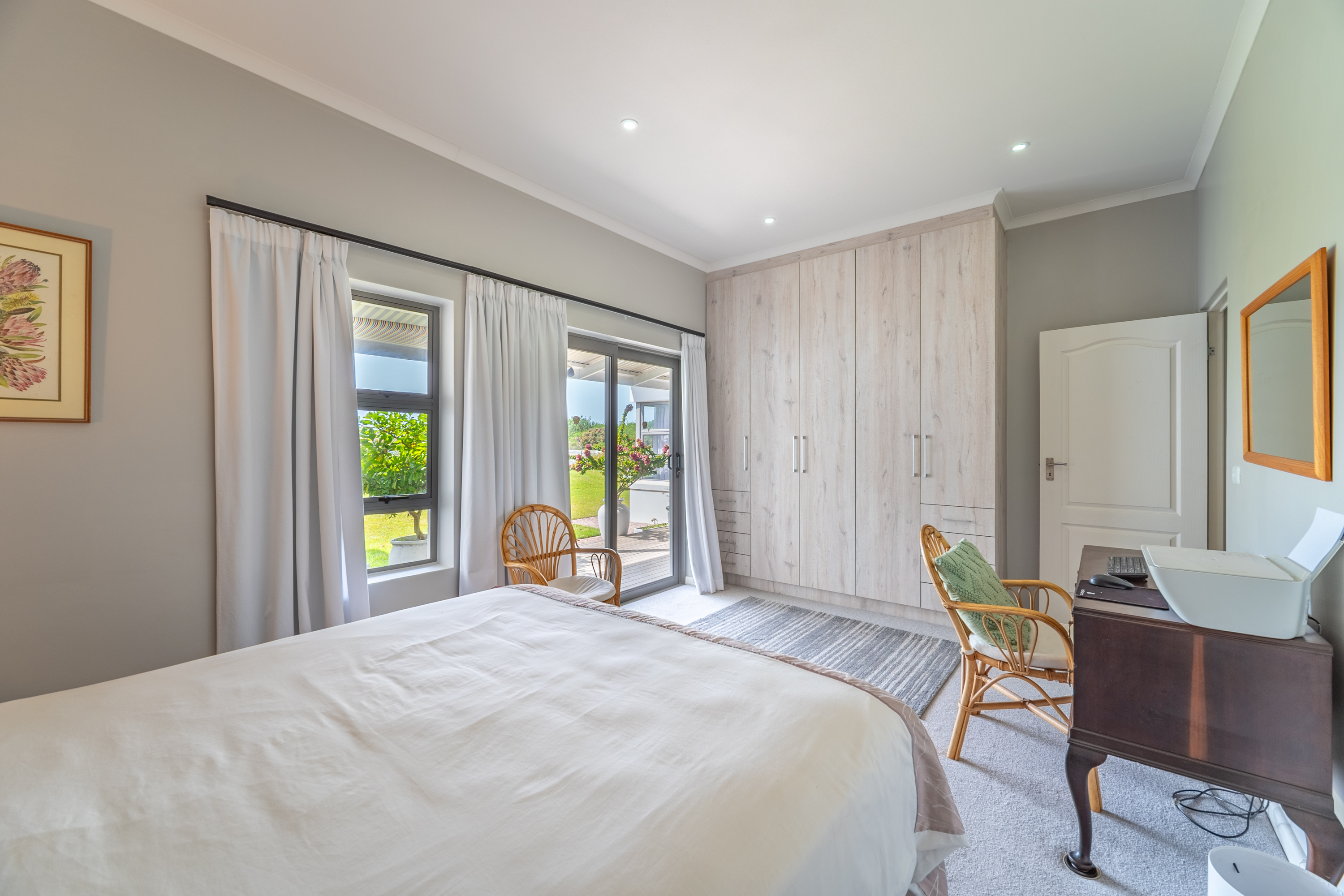 Bedrooms are thoughtfully positioned away from the main living spaces for extra privacy. The main suite enjoys its own little patio and peaceful garden outlook, while the two additional bedrooms are generous in size—one even has its own en-suite. A clever nook in the passage makes for an ideal work-from-home or study spot.