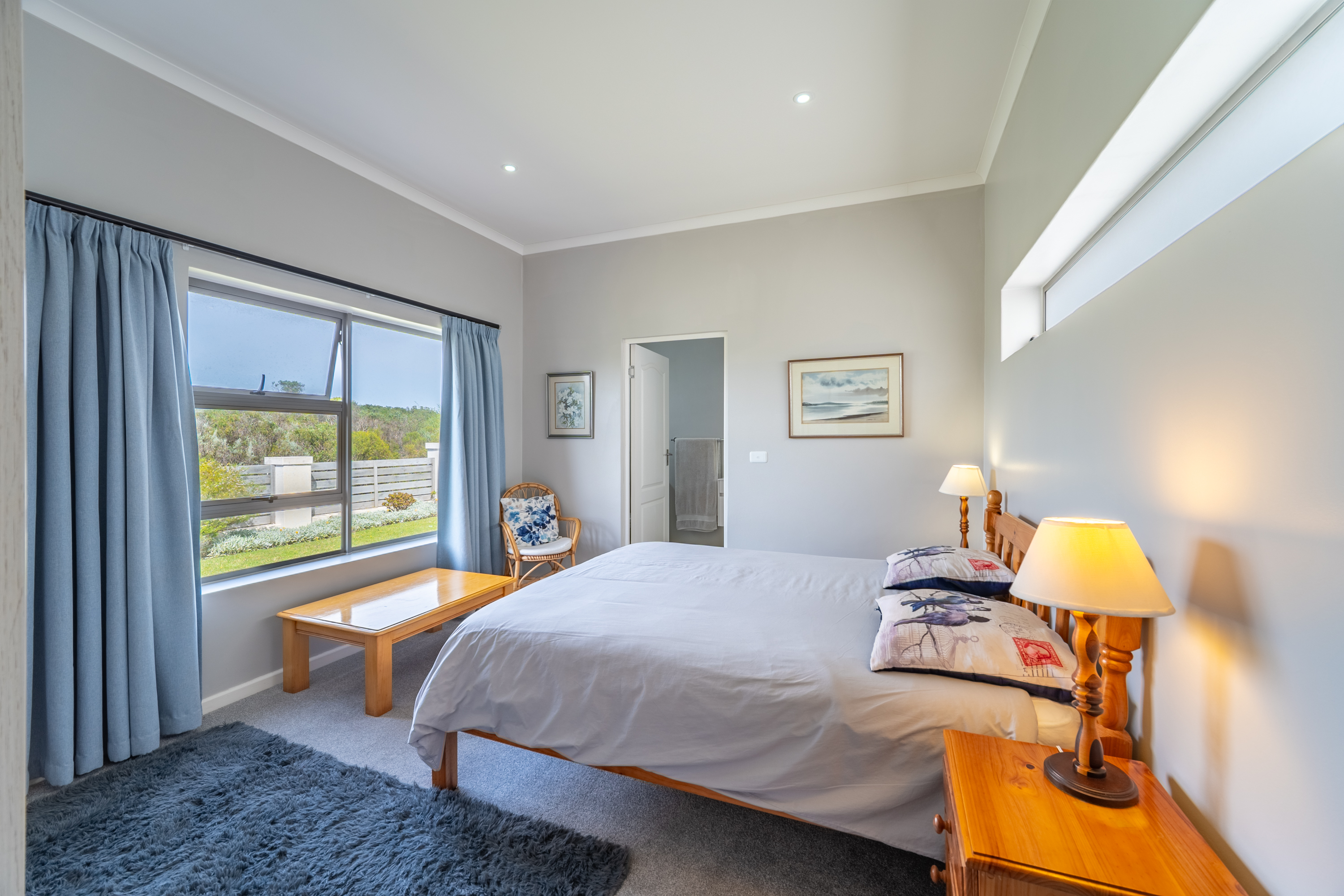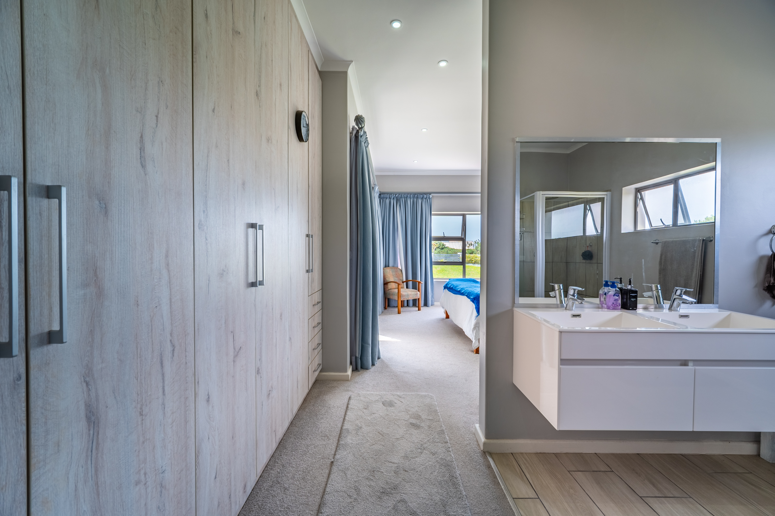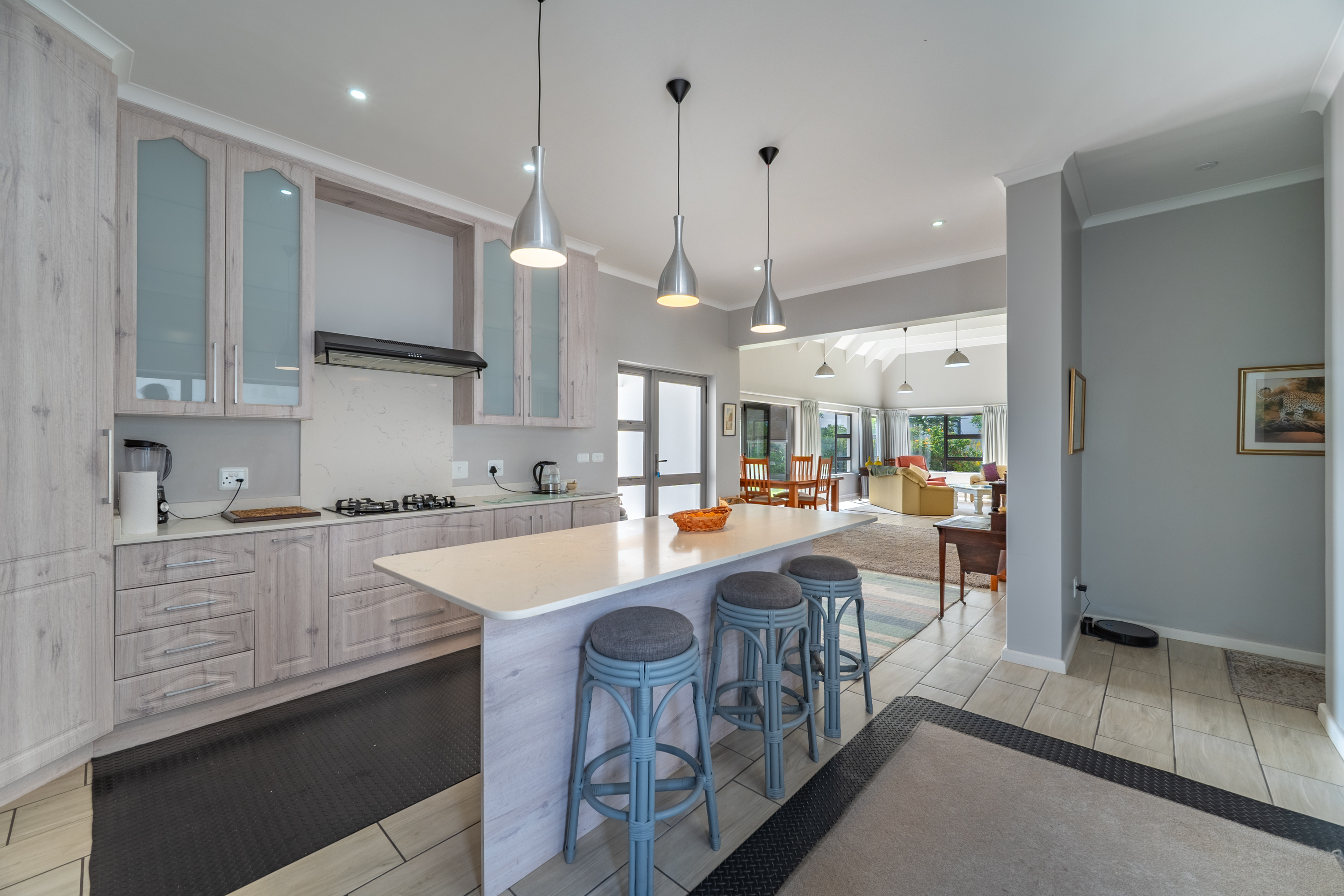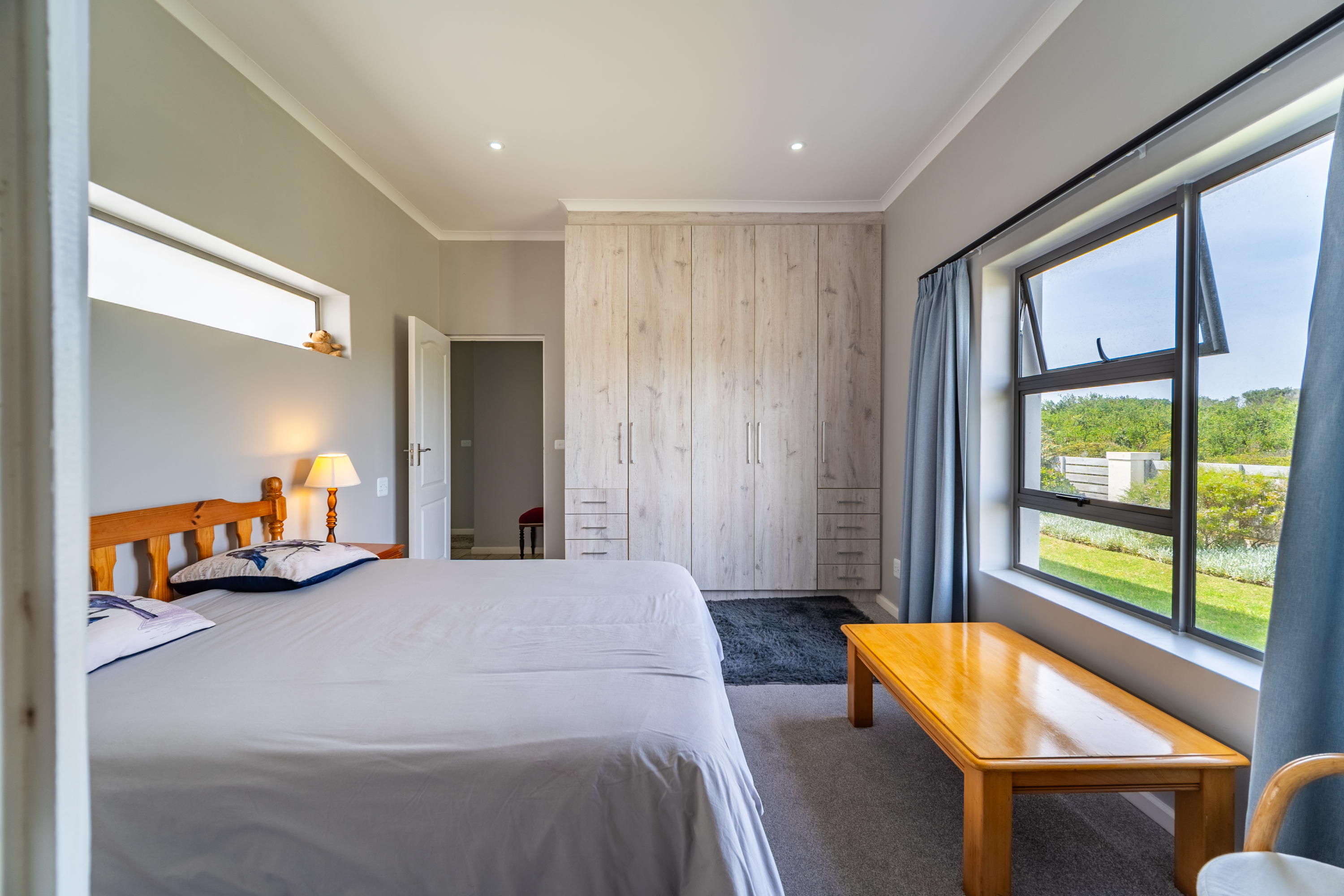 Bedrooms are thoughtfully positioned away from the main living spaces for extra privacy. The main suite enjoys its own little patio and peaceful garden outlook, while the two additional bedrooms are generous in size—one even has its own en-suite. A clever nook in the passage makes for an ideal work-from-home or study spot.