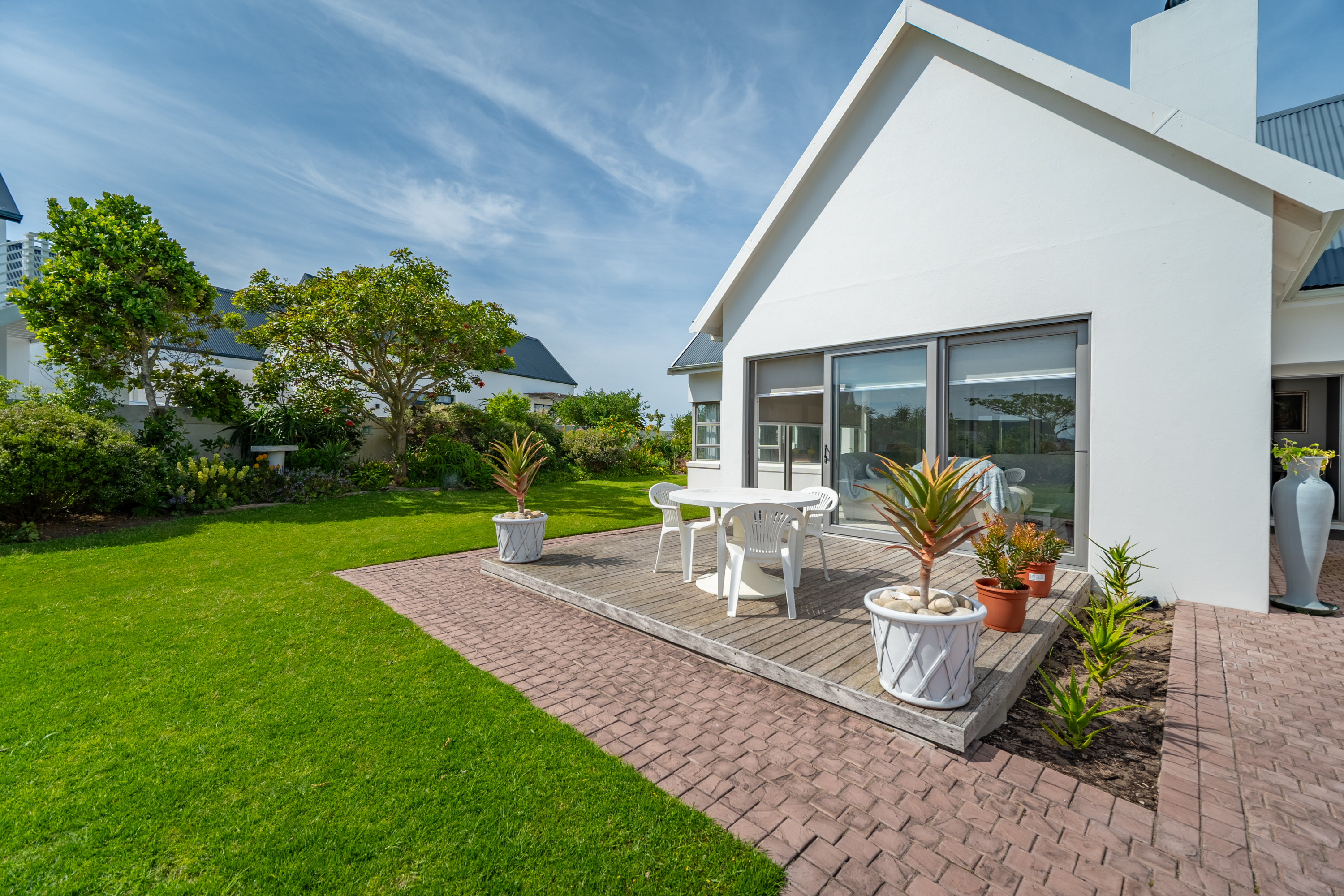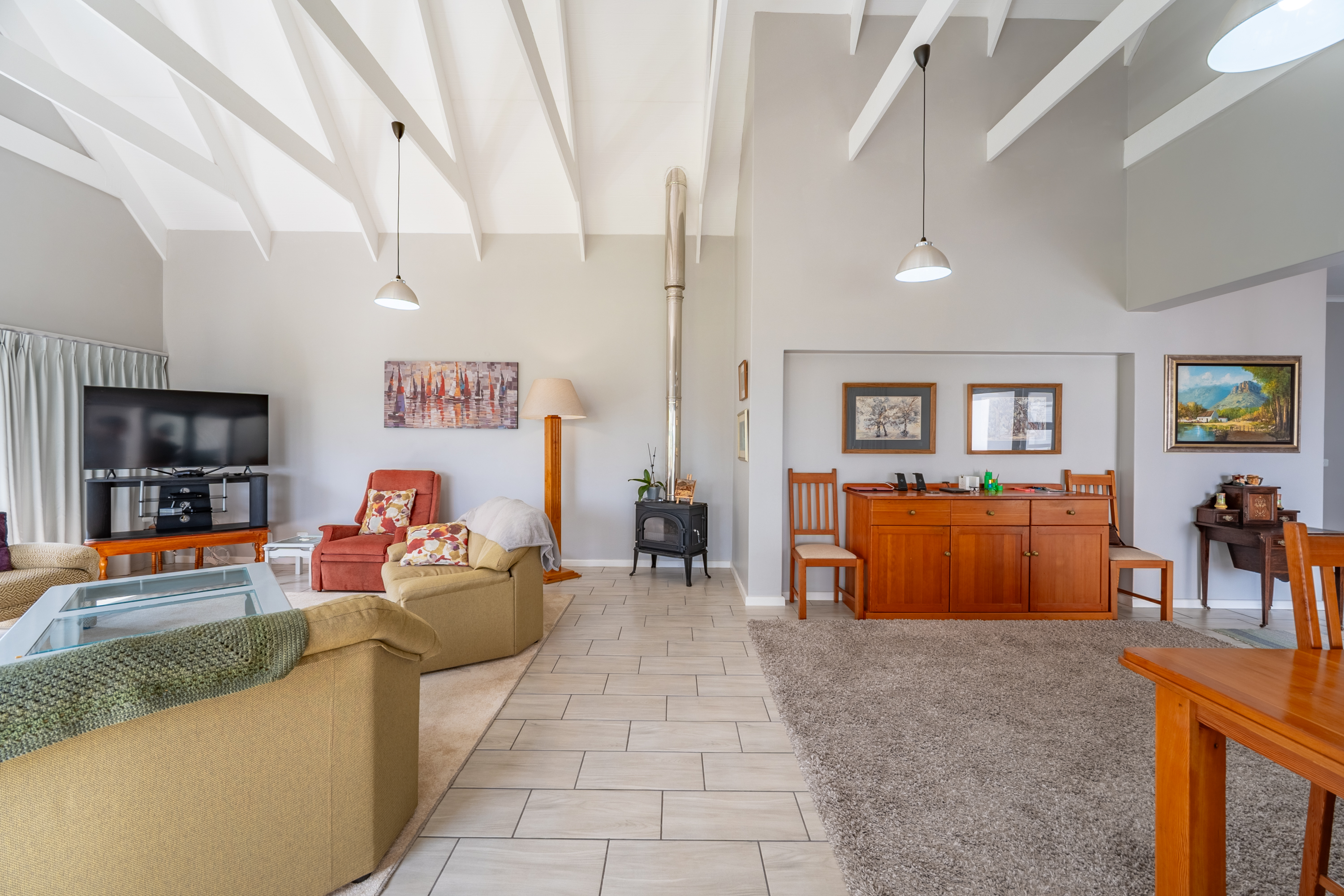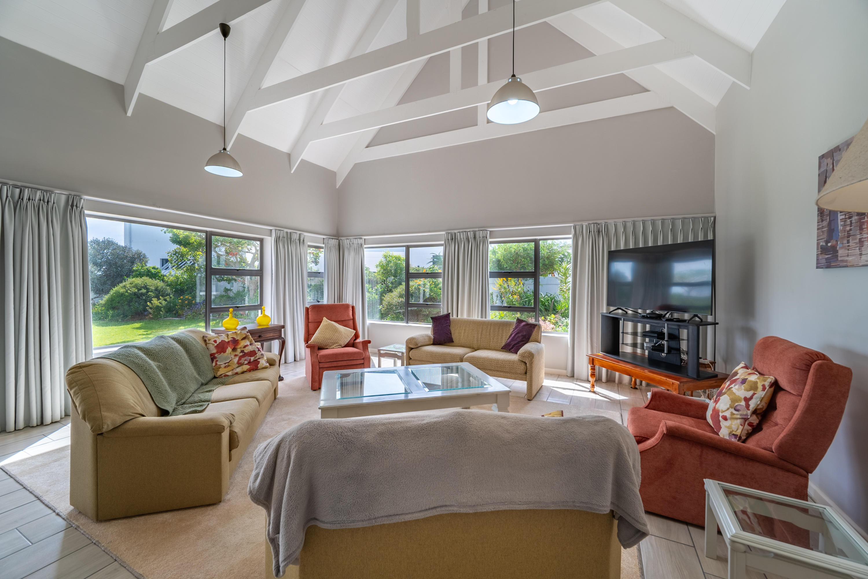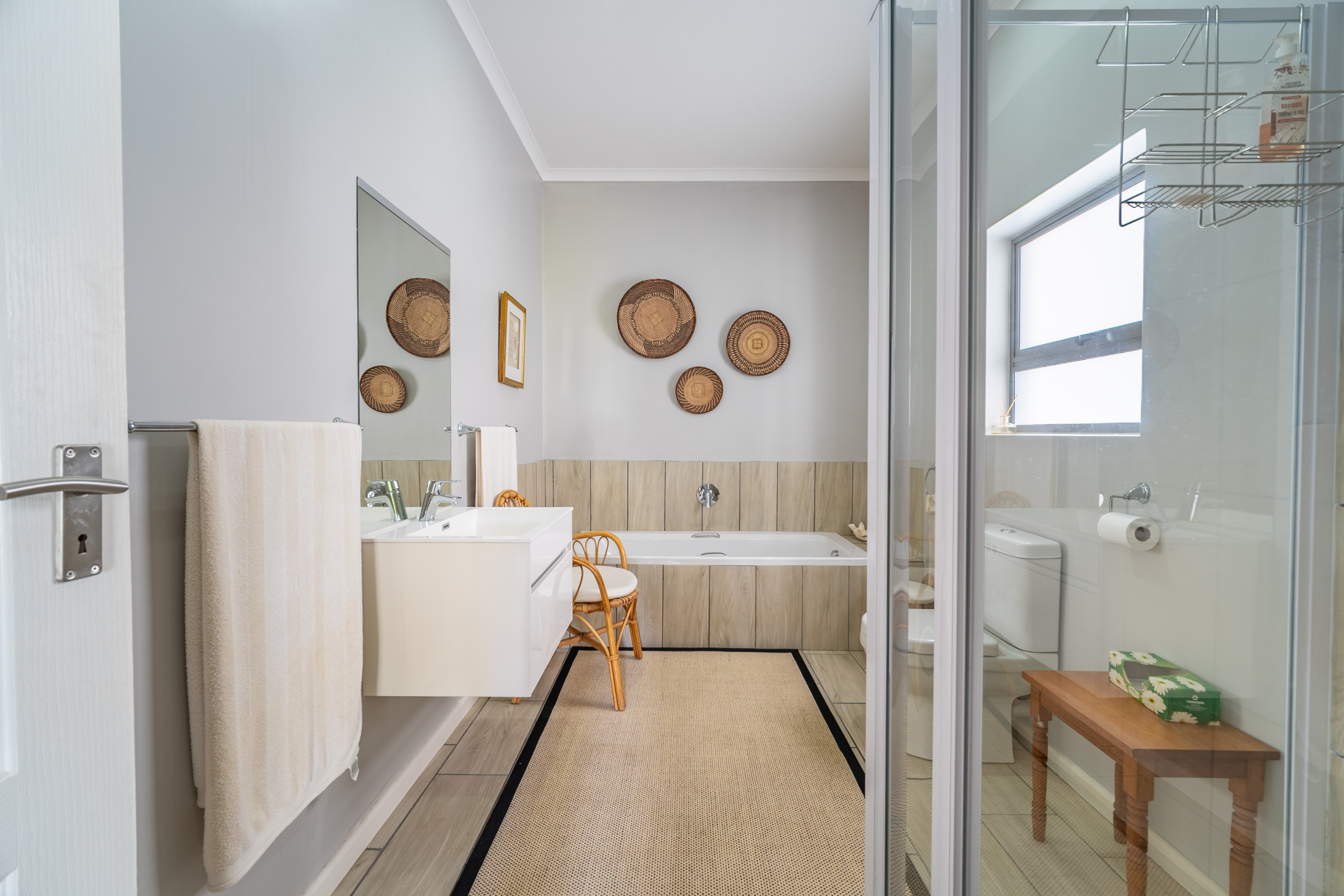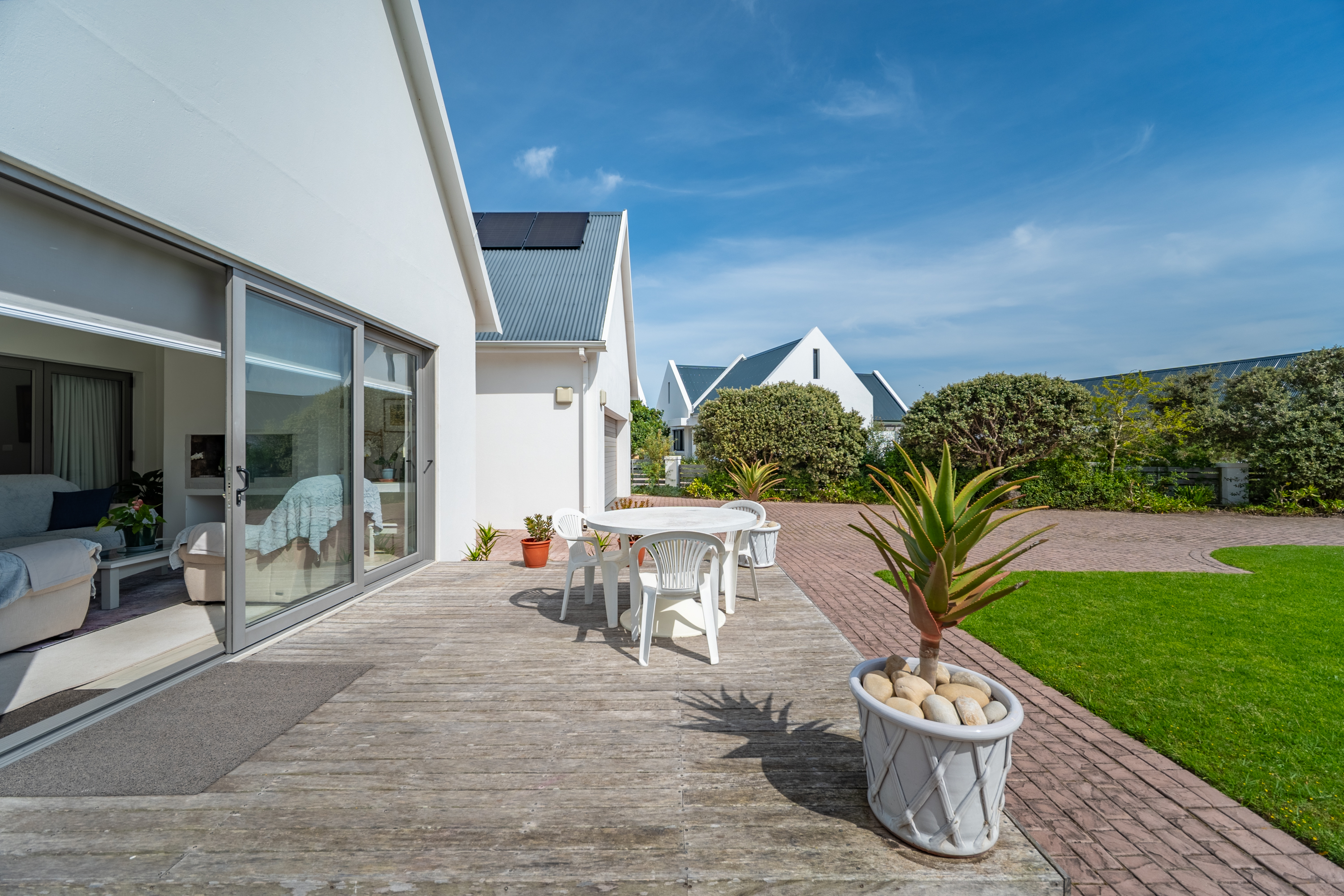 Bedrooms are thoughtfully positioned away from the main living spaces for extra privacy. The main suite enjoys its own little patio and peaceful garden outlook, while the two additional bedrooms are generous in size—one even has its own en-suite. A clever nook in the passage makes for an ideal work-from-home or study spot.