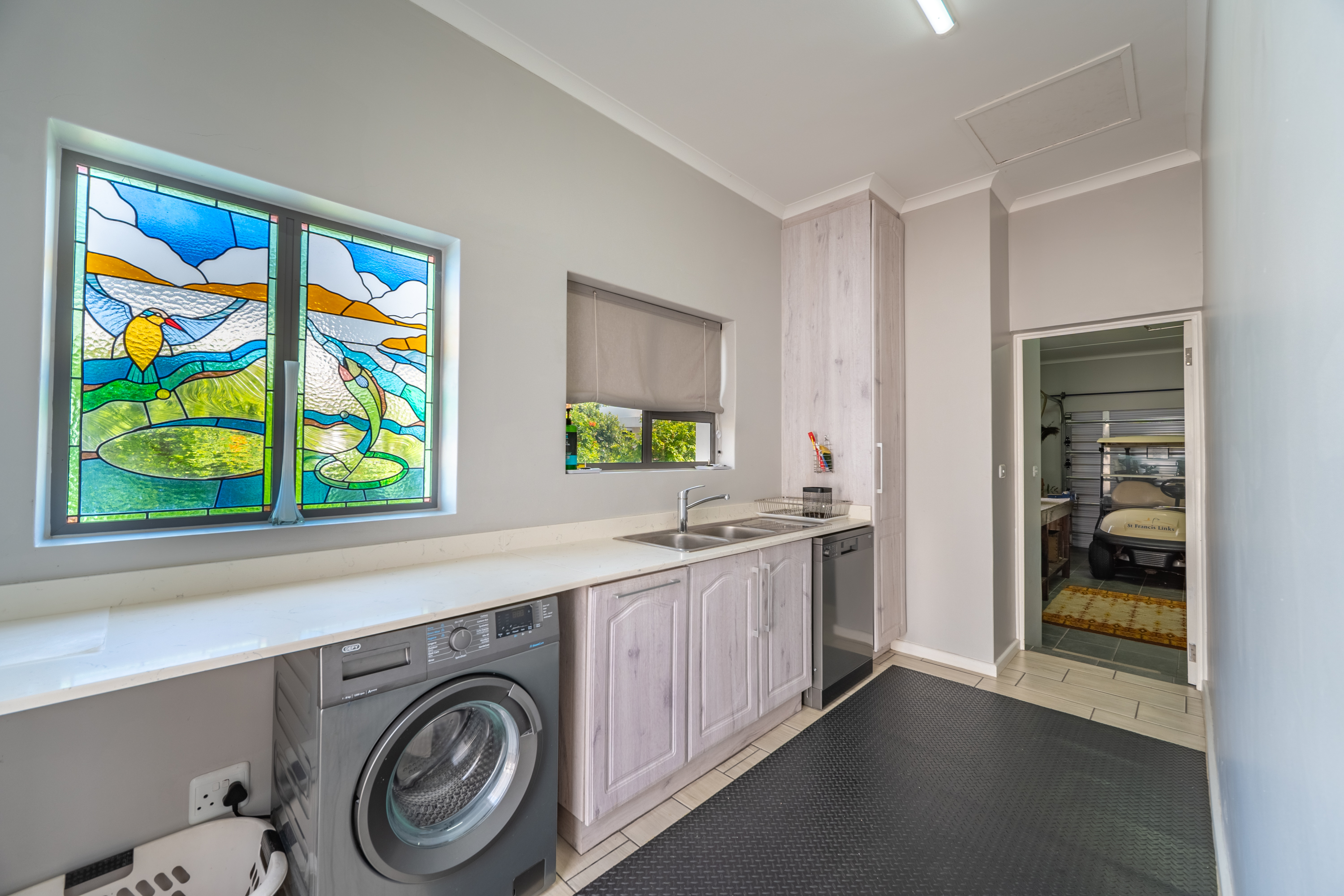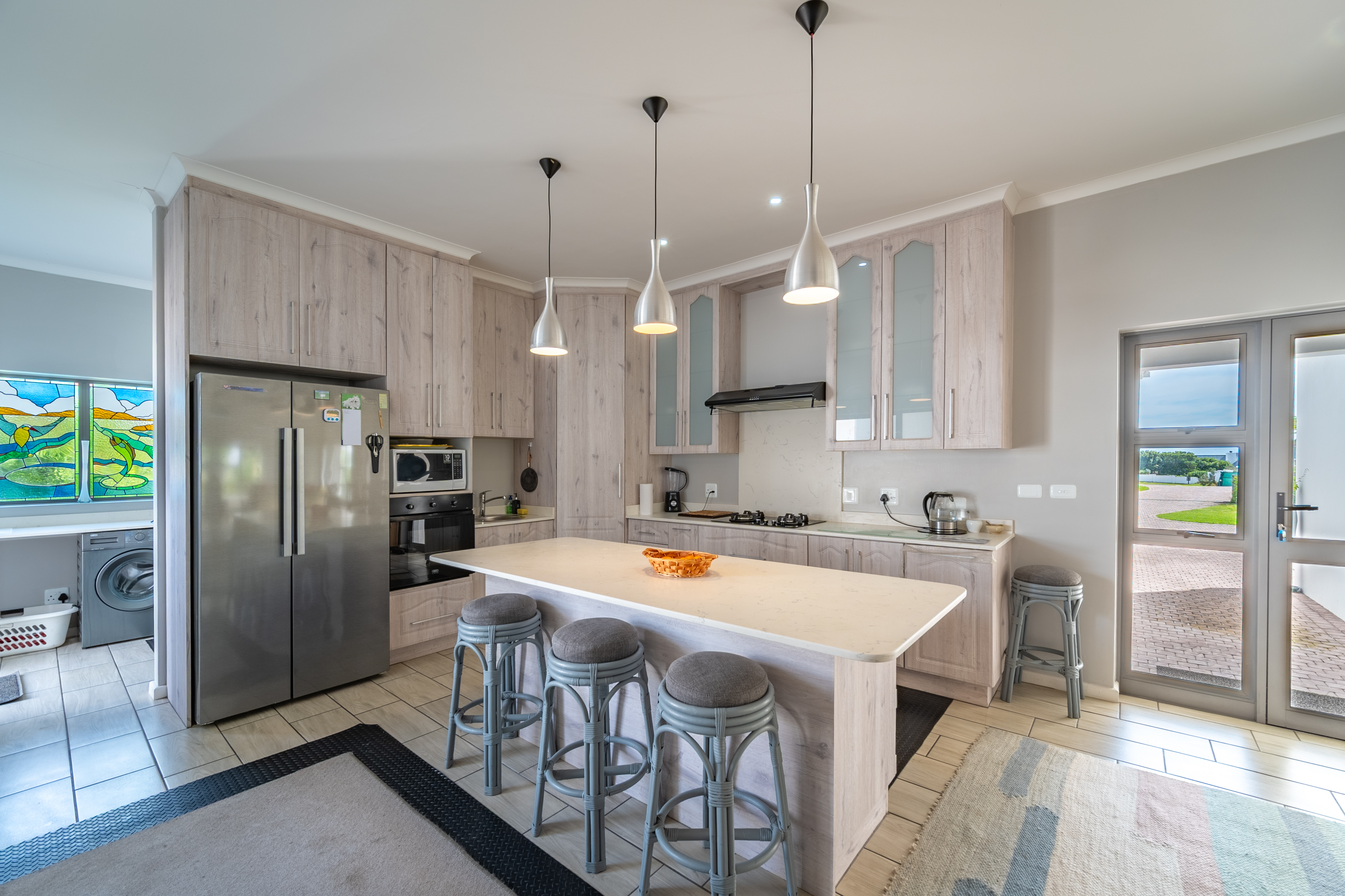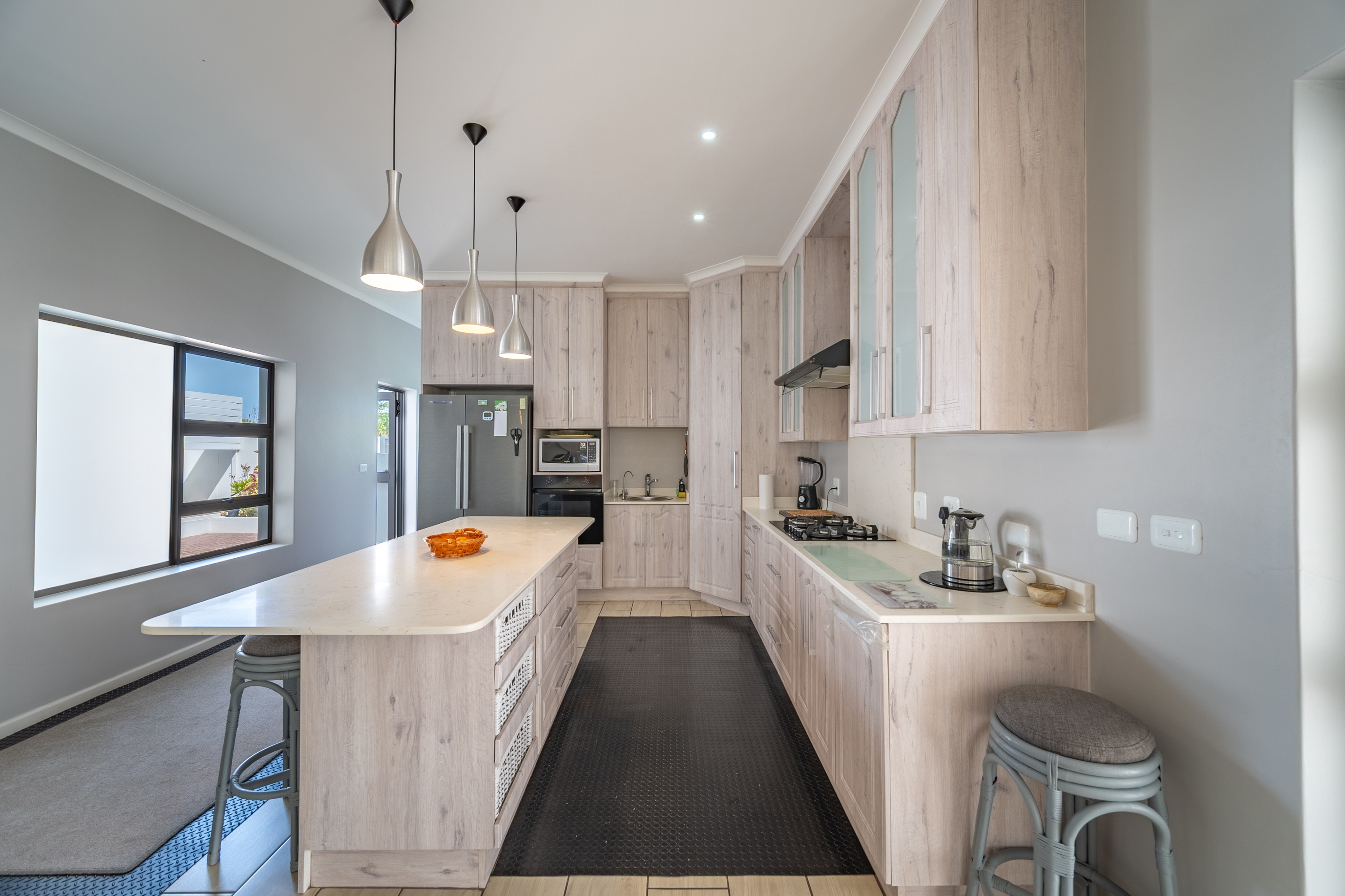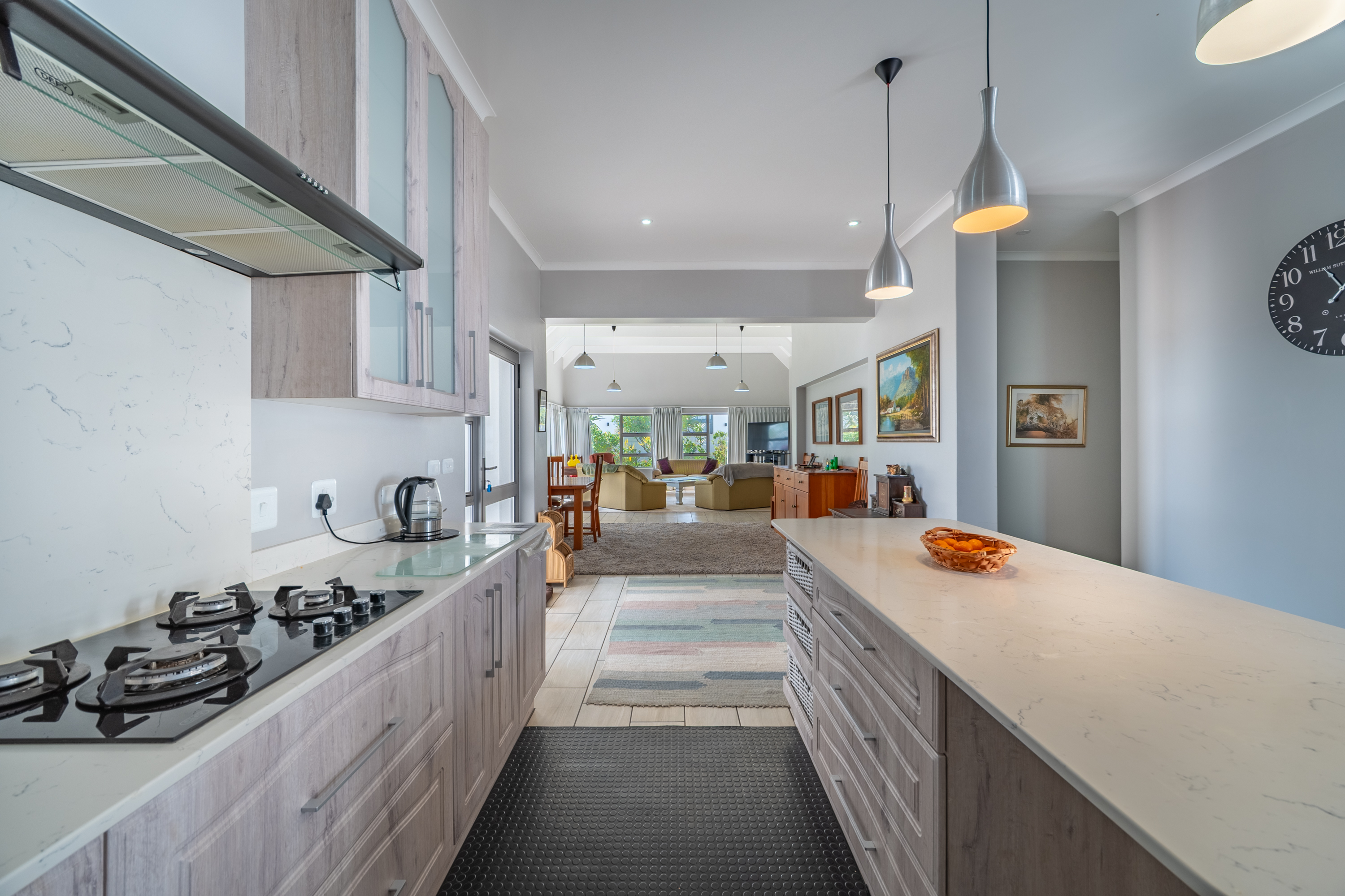 The kitchen is practical and well laid out, complete with a central island, plenty of cupboard space, and a separate scullery to keep things organised.