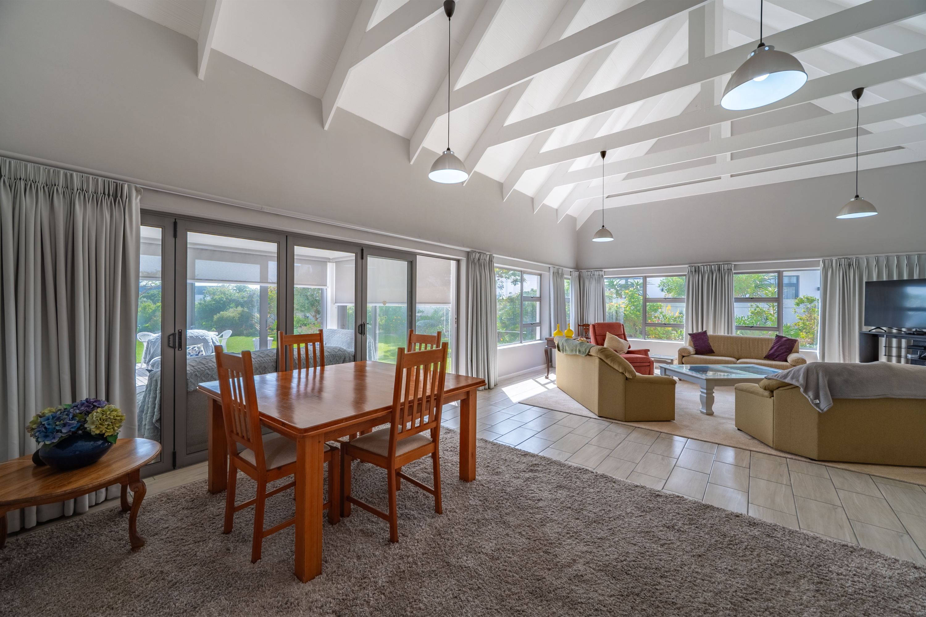 The open-plan living area is light and welcoming, with a seamless flow onto a sunny patio and enclosed braai room—perfect for entertaining or just soaking up the garden views. The neutral finishes give you the freedom to style the space however you like.