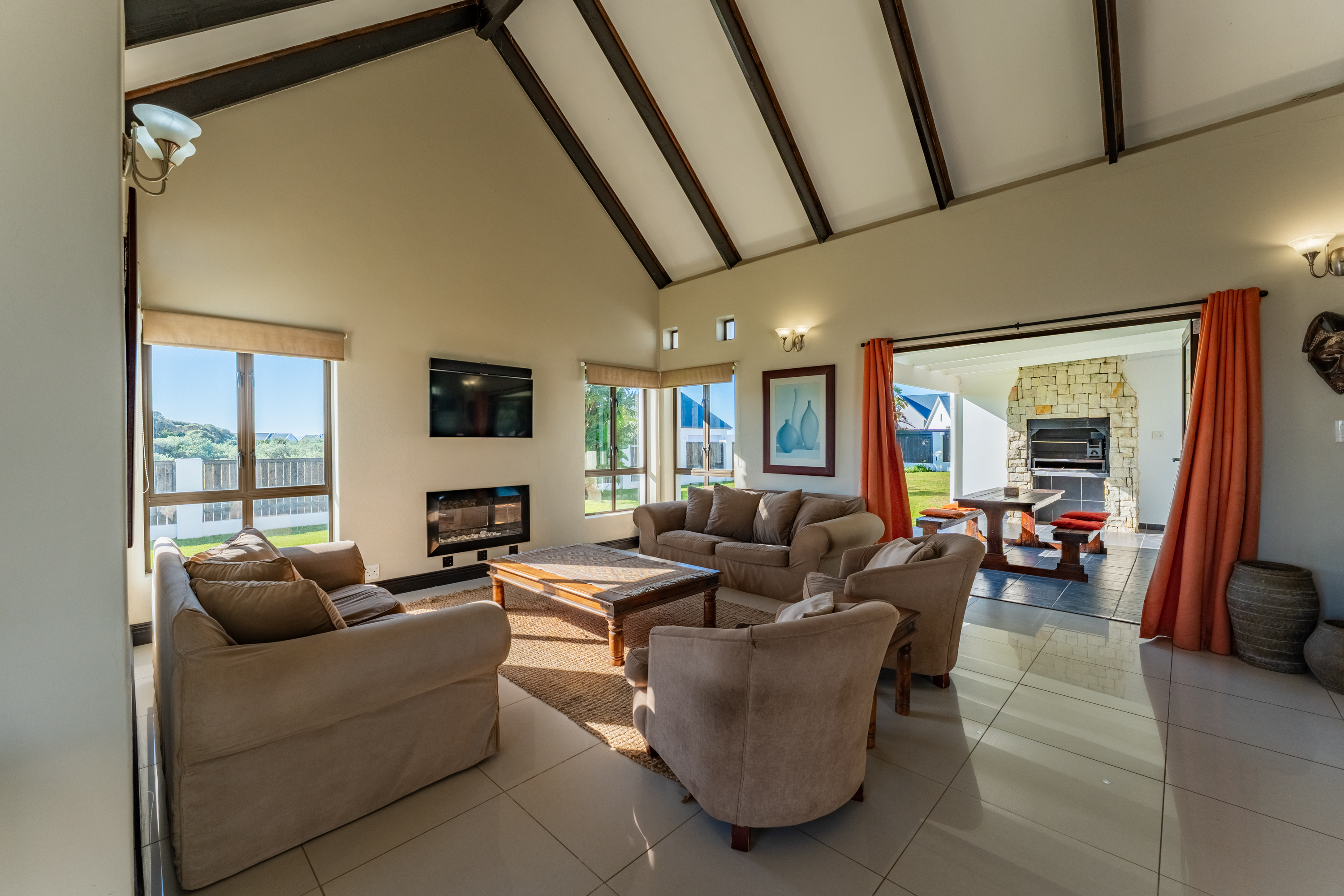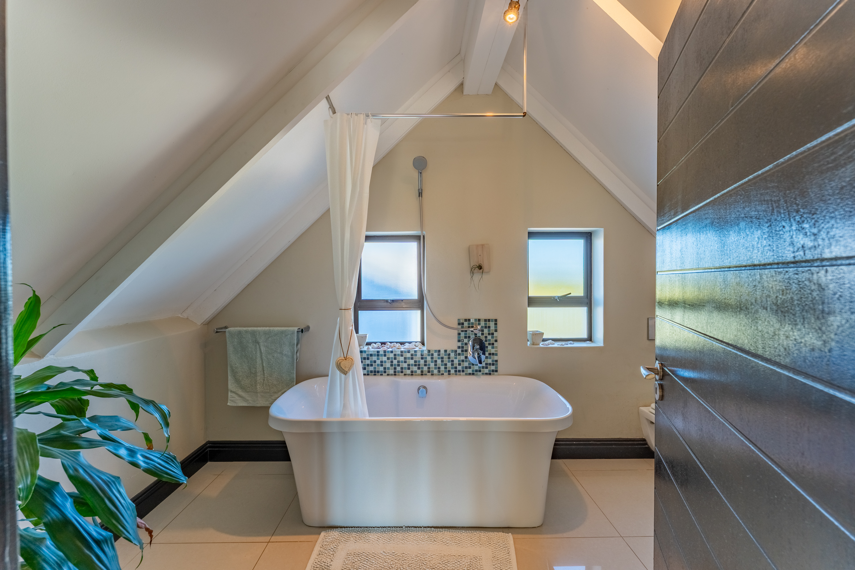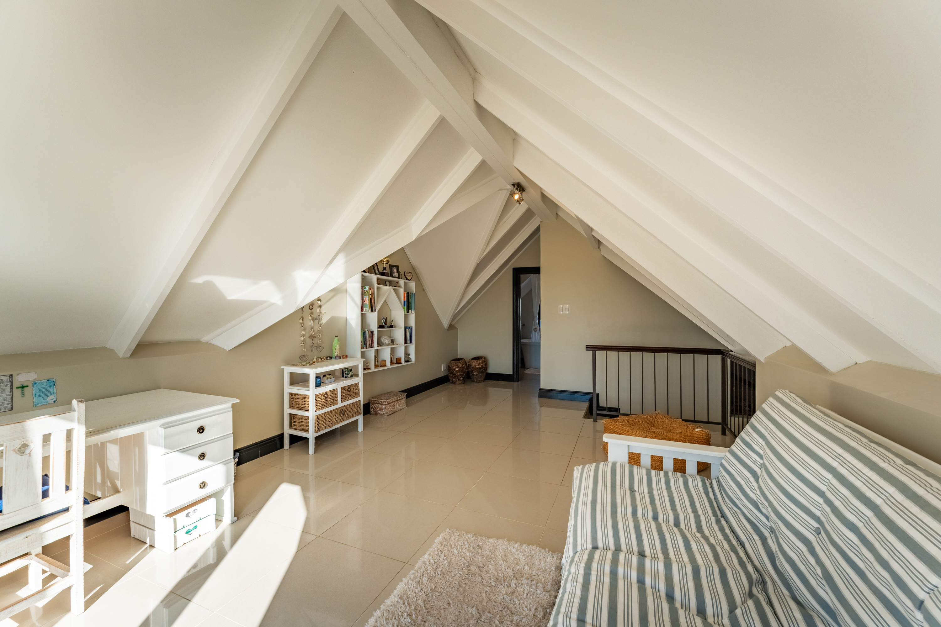 Upstairs, a spacious loft with beautiful mountain views provides a versatile extra living area. With its own bathroom (with bath), this space works well as a second lounge, guest suite, or studio.