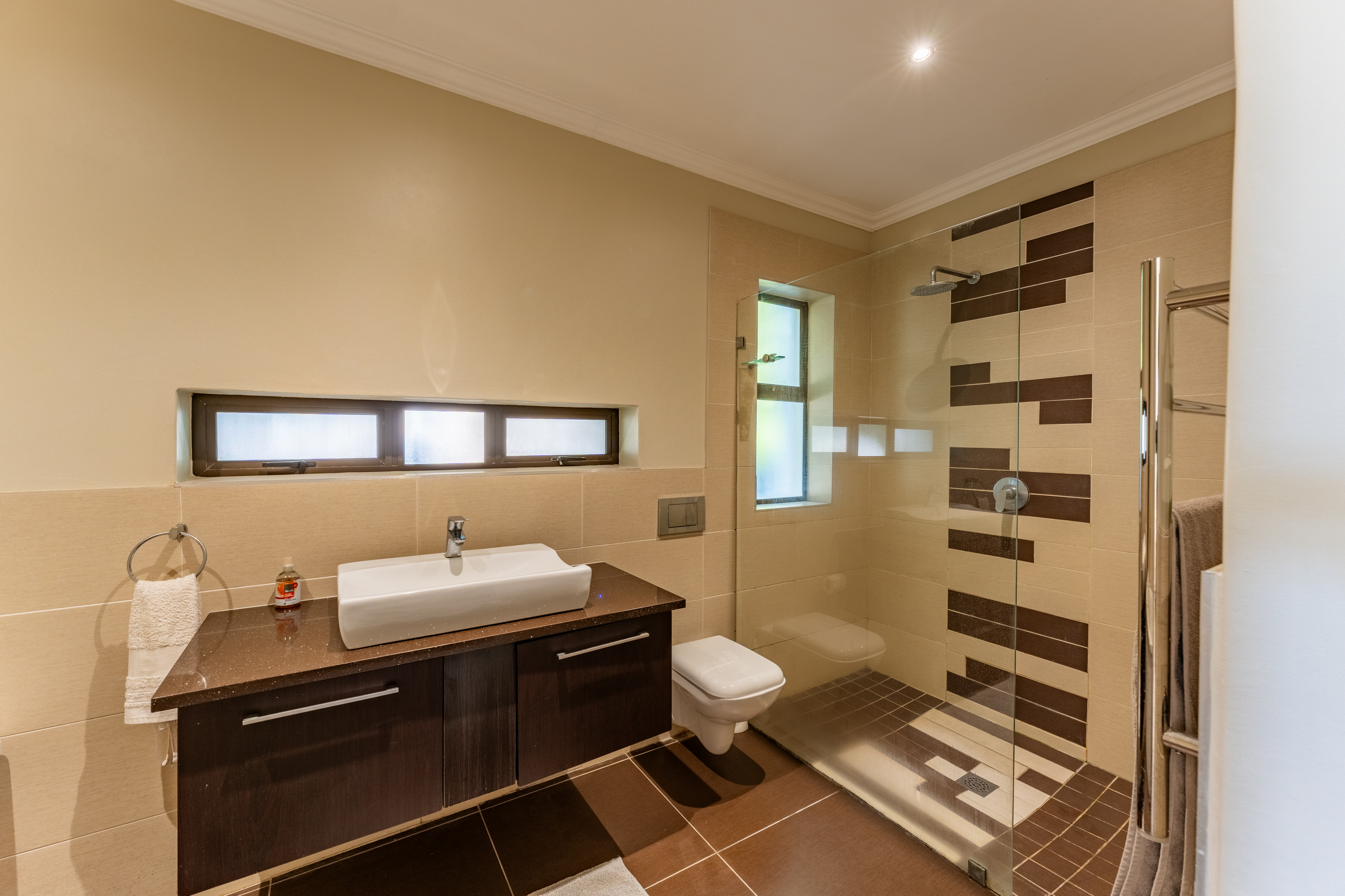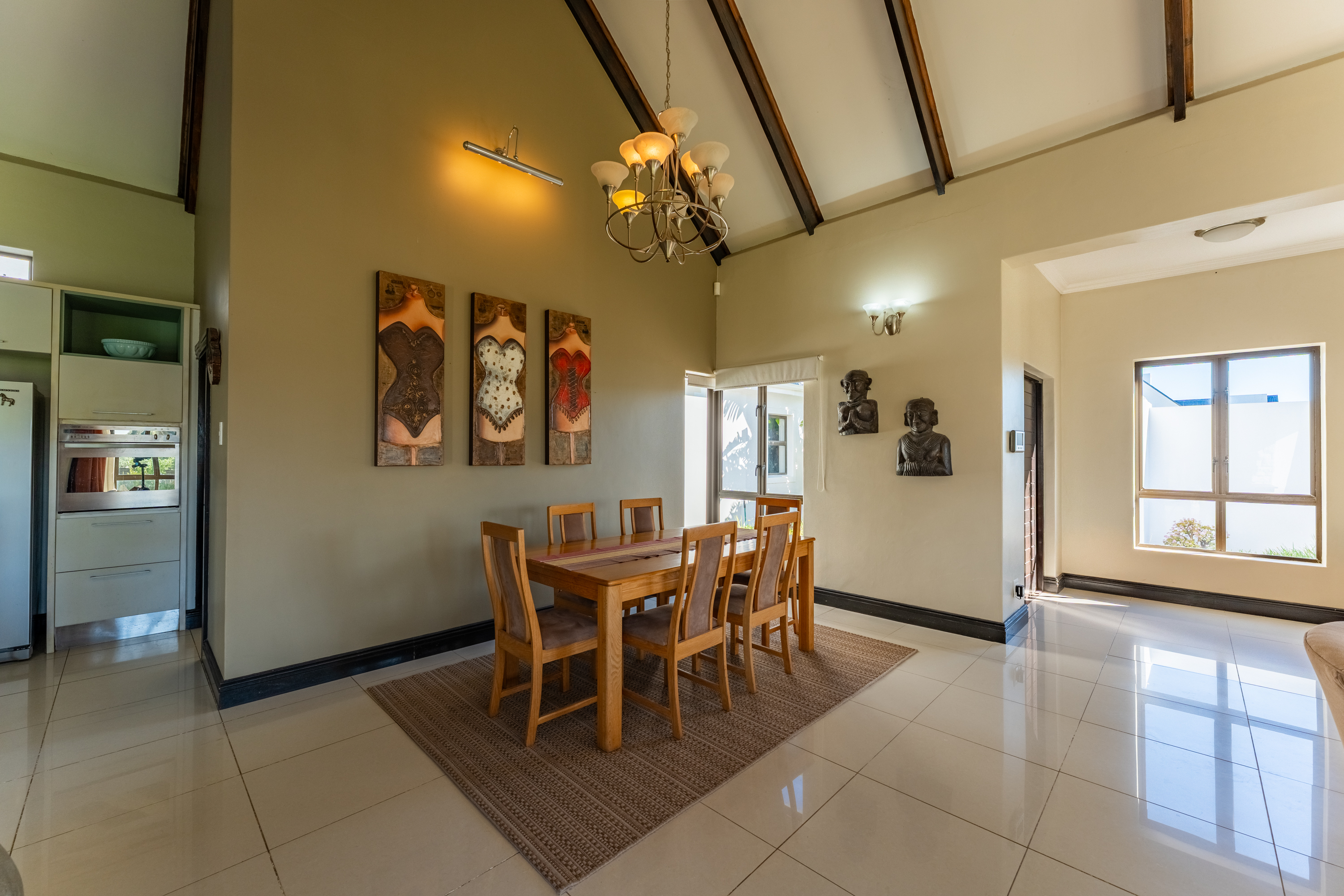 Down the passage are three well-proportioned bedrooms. The main bedroom is north-facing and opens onto the garden, with a walk-through dressing area and a modern en-suite bathroom (shower only). The second bedroom is sunny and welcoming, while the third offers privacy with high ceilings and a cooler orientation—ideal for guests or teenagers. These bedrooms share a stylish full family bathroom.