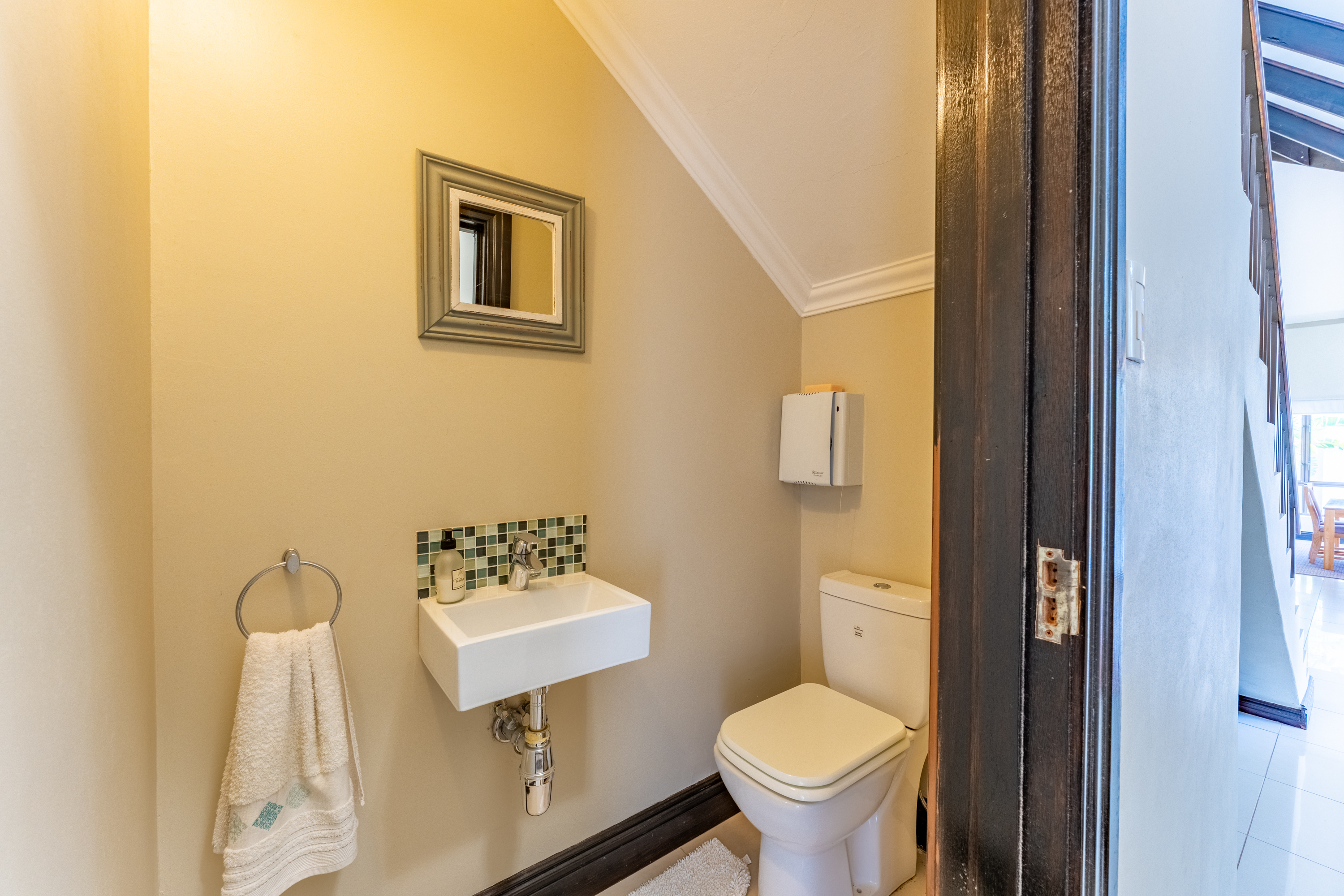 Outside the scullery is a private courtyard, perfect for a small herb or veggie garden. From here, there is access to an additional room above the garage—ideal for a gym, studio, or quiet retreat. A bathroom with a shower is located below for convenience.