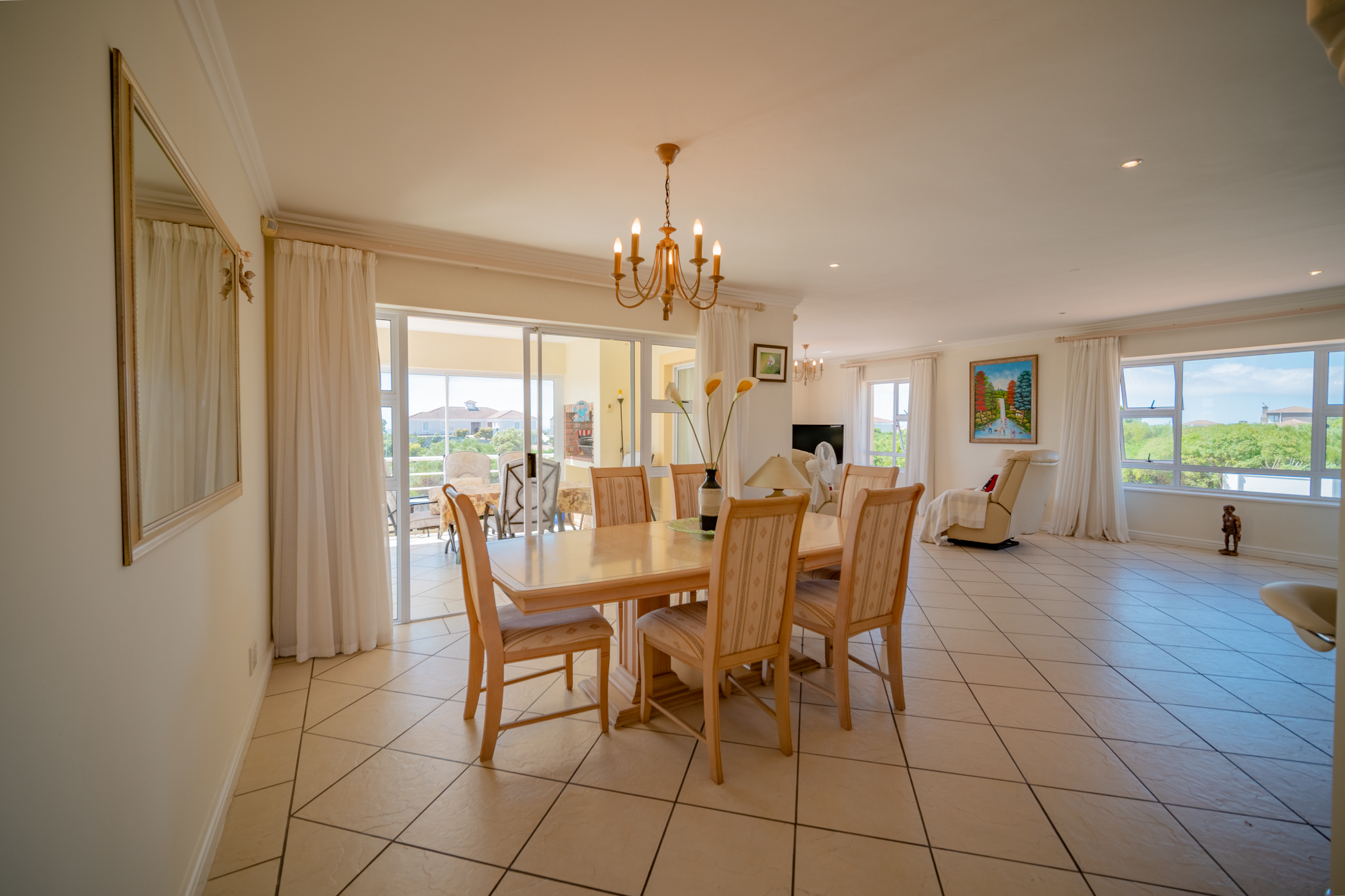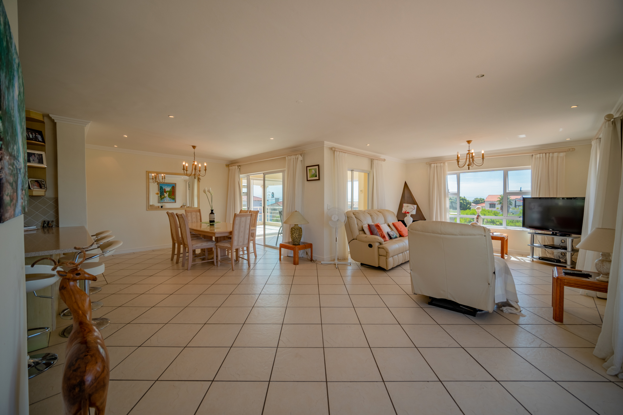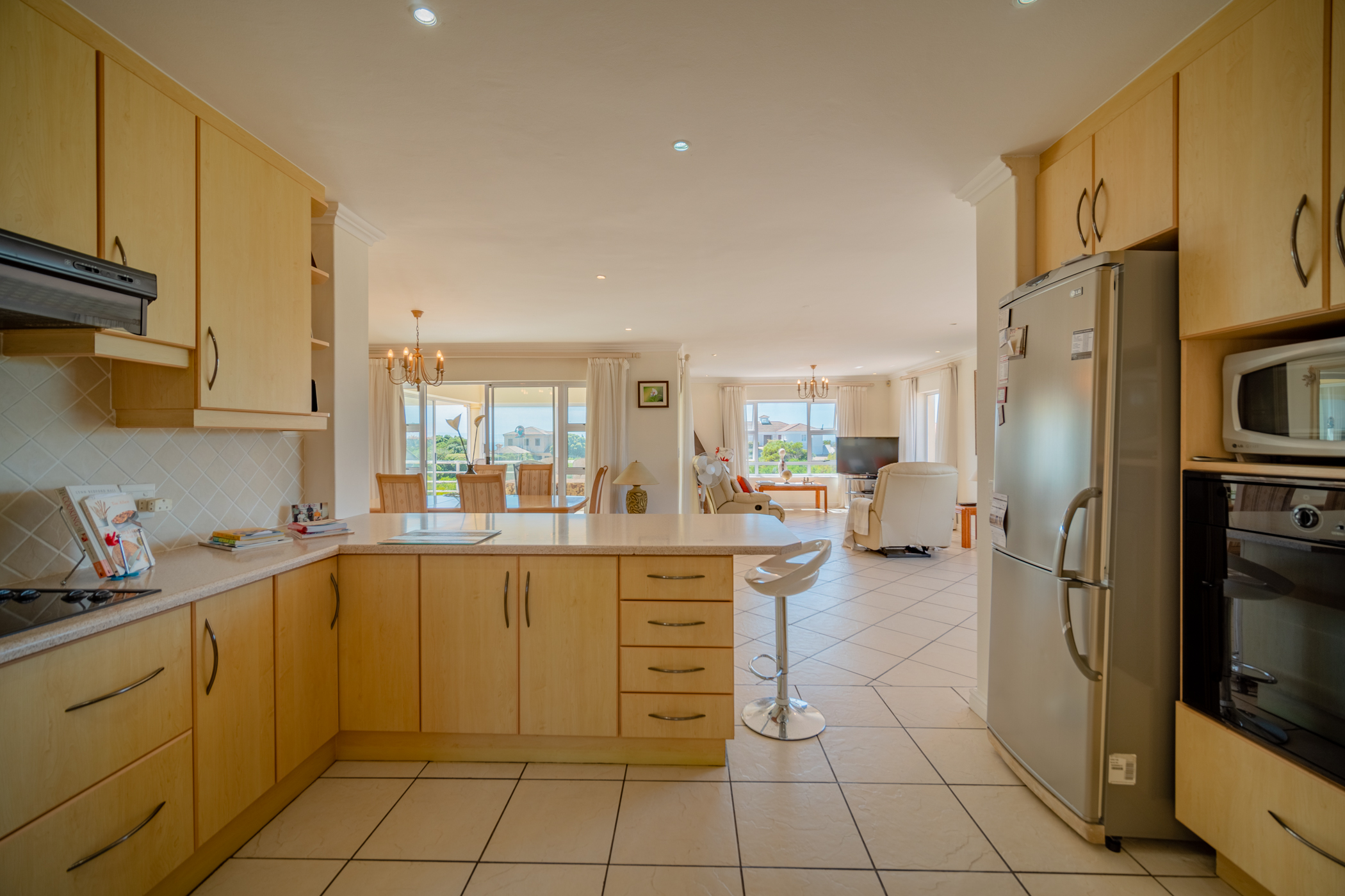 Large entrance hall flow over into the open plan kitchen with laundry and scullery, dining room and large lounge with fireplace, sliding doors to enclosed balcony with braai area. North facing sea views. Guest loo and guest bedroom en-suite with open balcony.