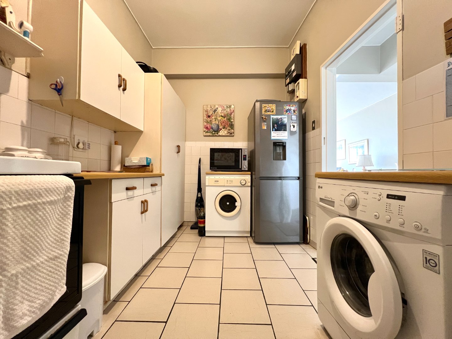 A neat kitchen large enough to accommodate a double door fridge, washing machine, tumble dryer and ample cupboard space.