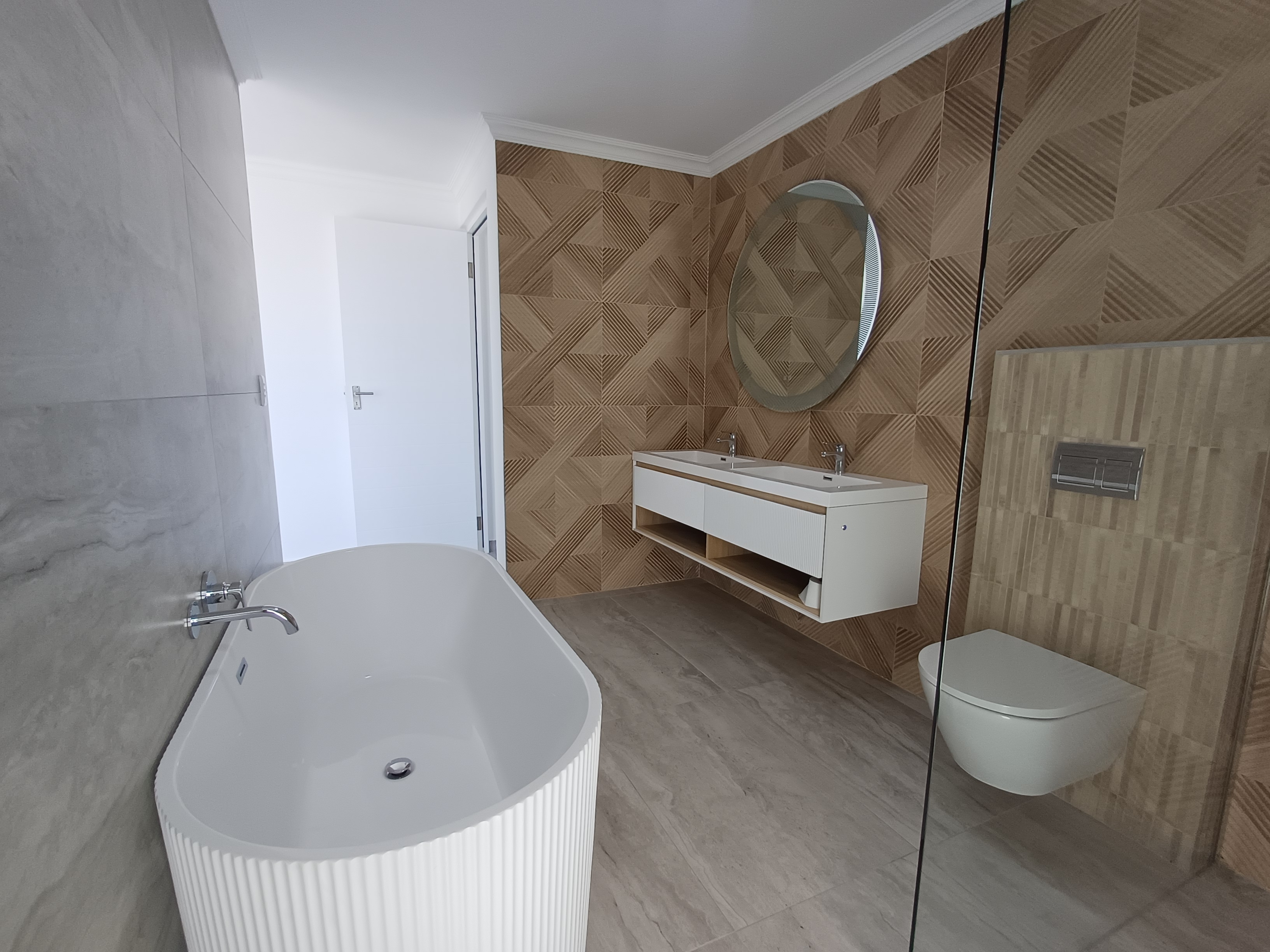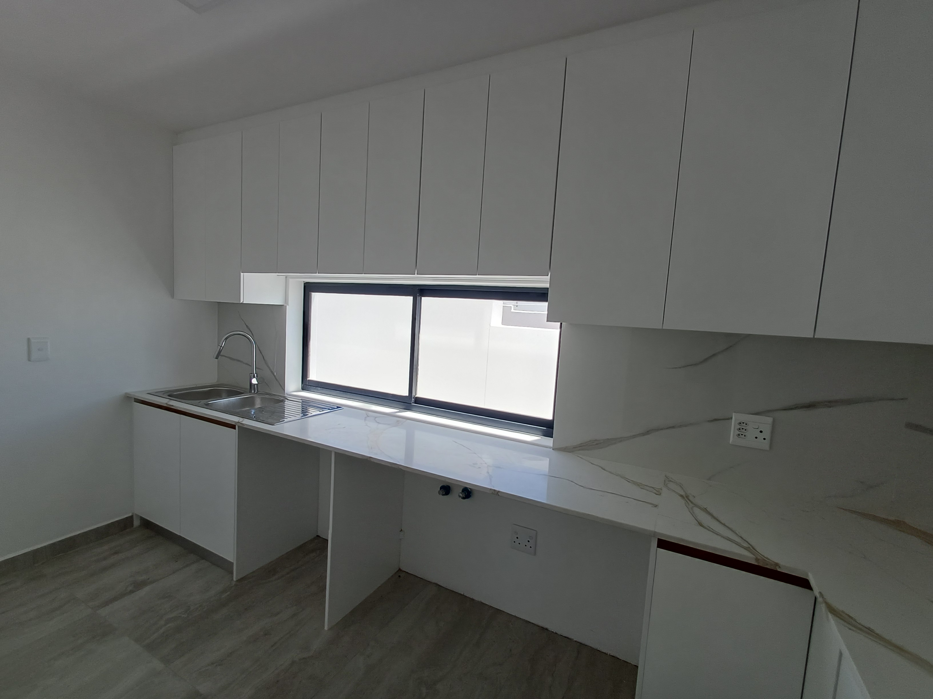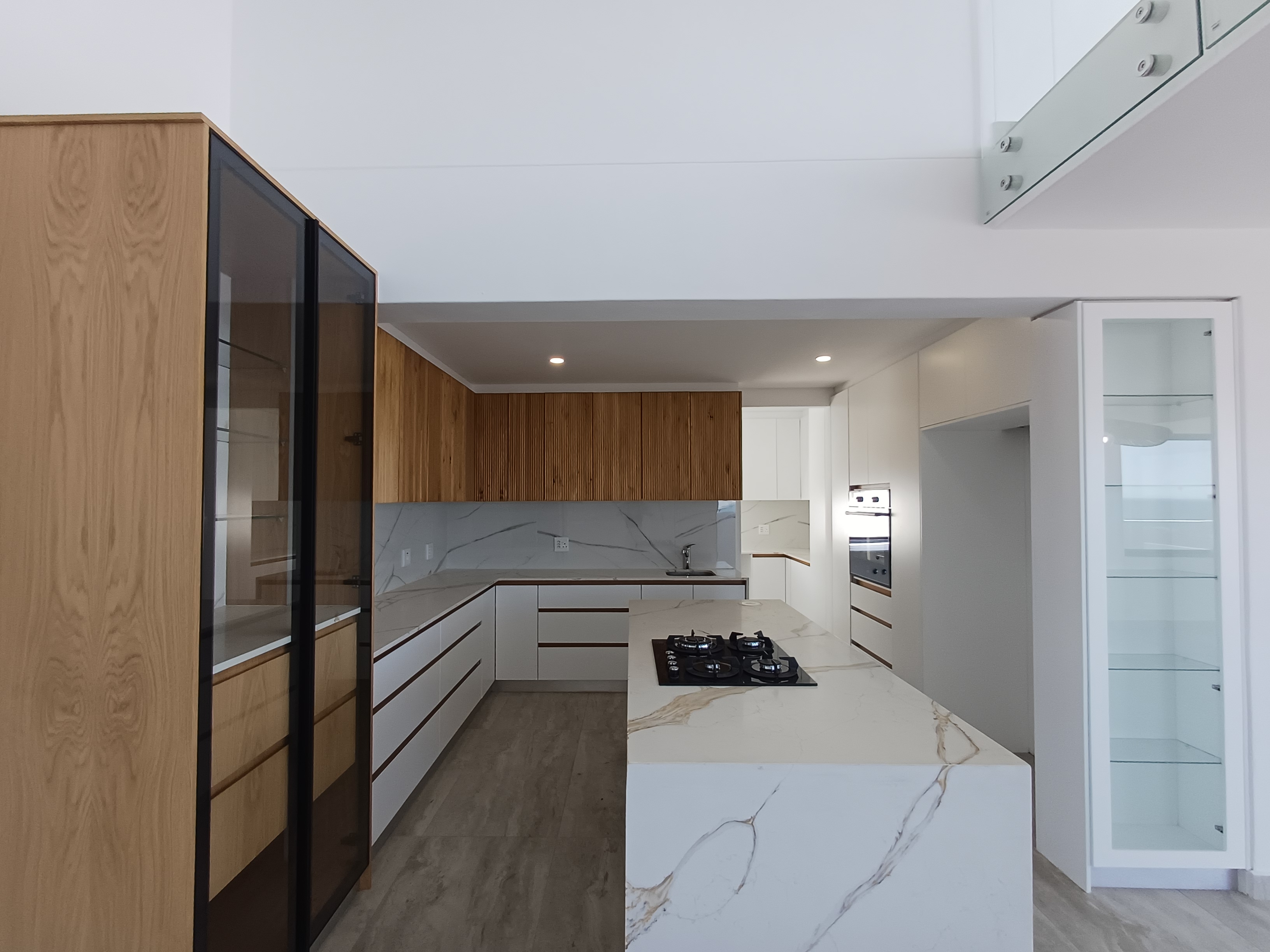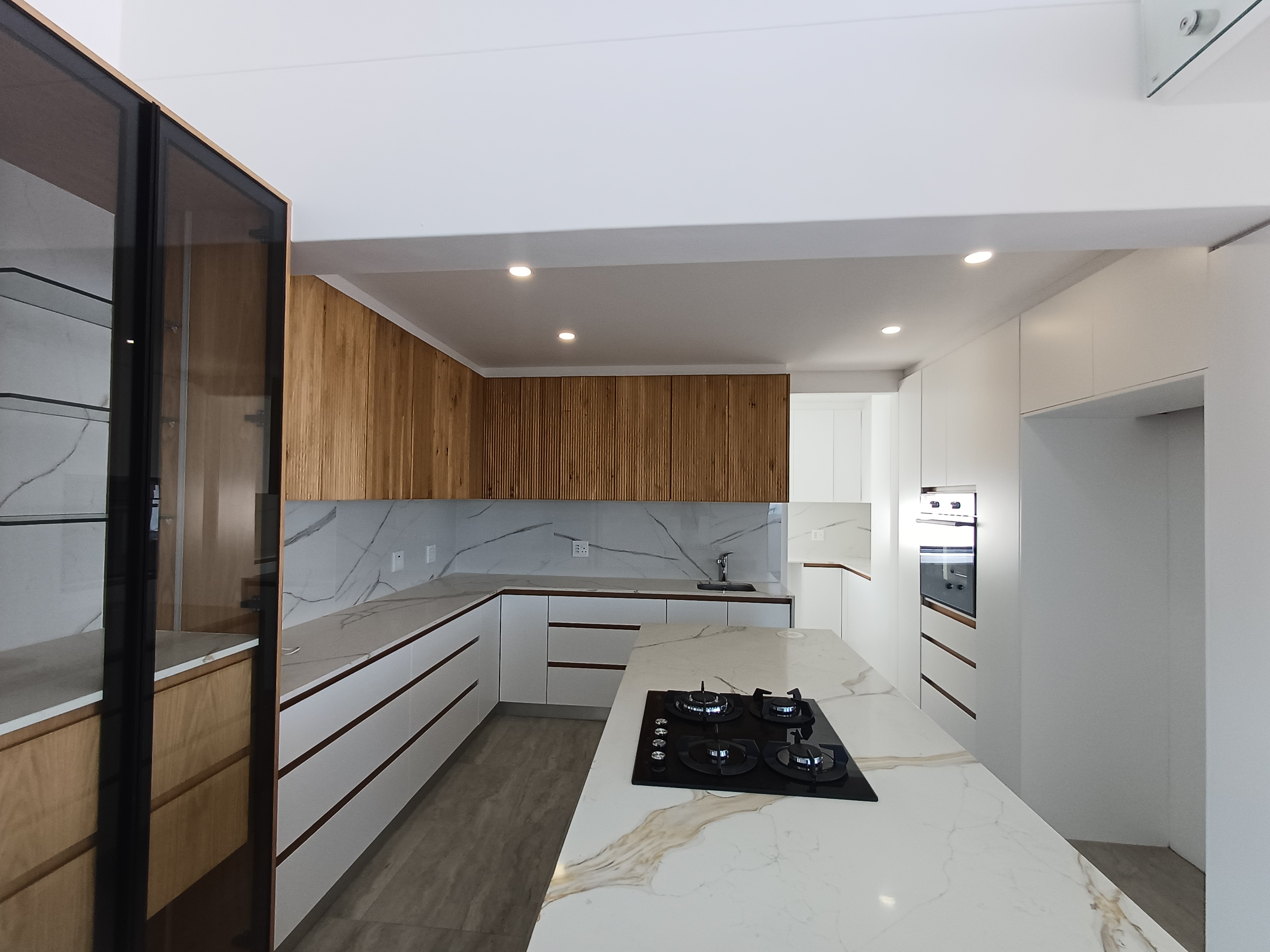 Sleek, modern kitchen with high-end finishes, complemented by a separate scullery/gallery space accommodating appliances and additional storage for discreet functionality.