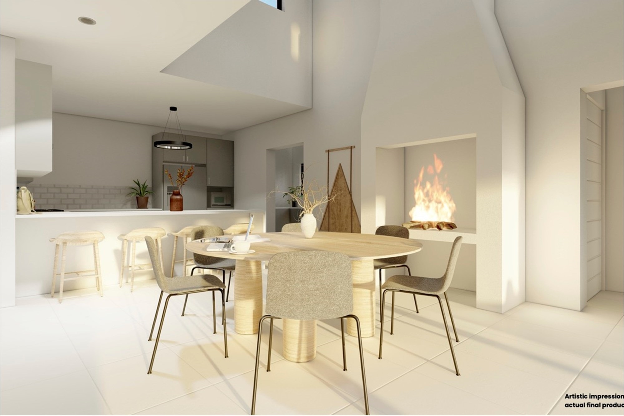 Open-plan living, dining, and kitchen area with a built-in fireplace/braai.