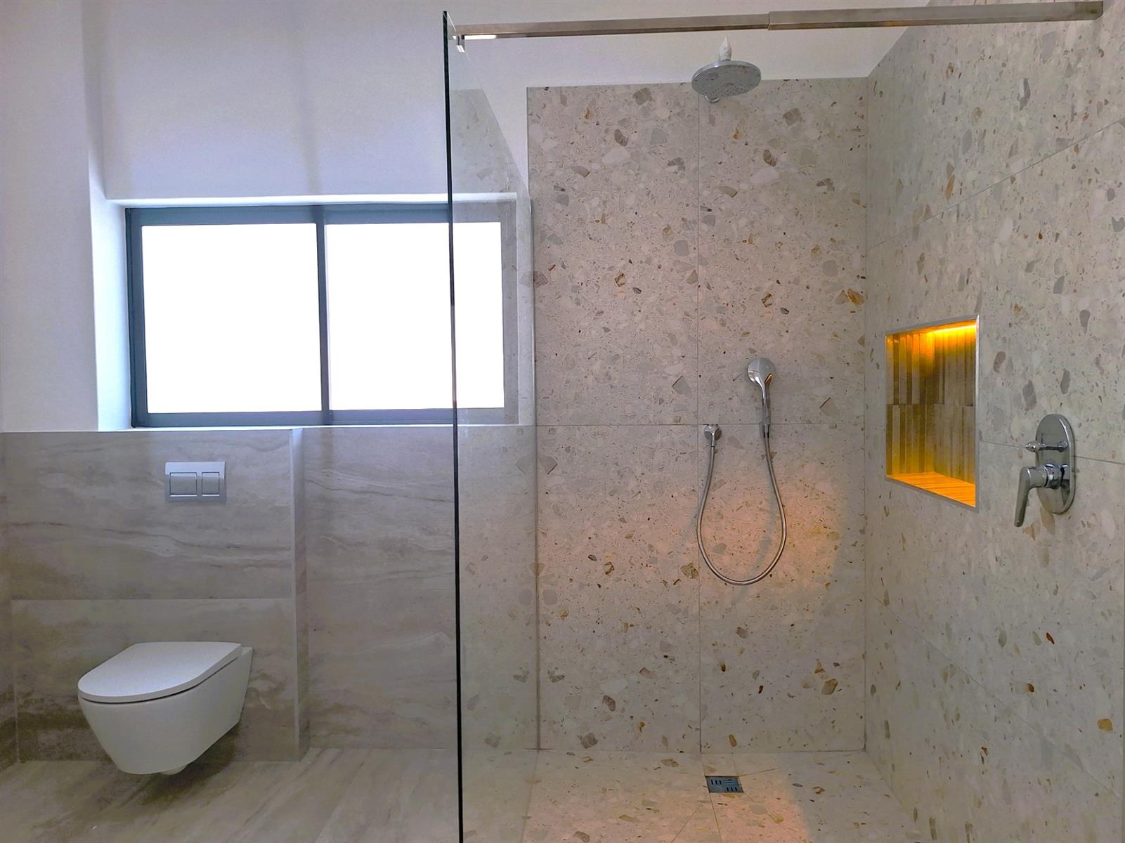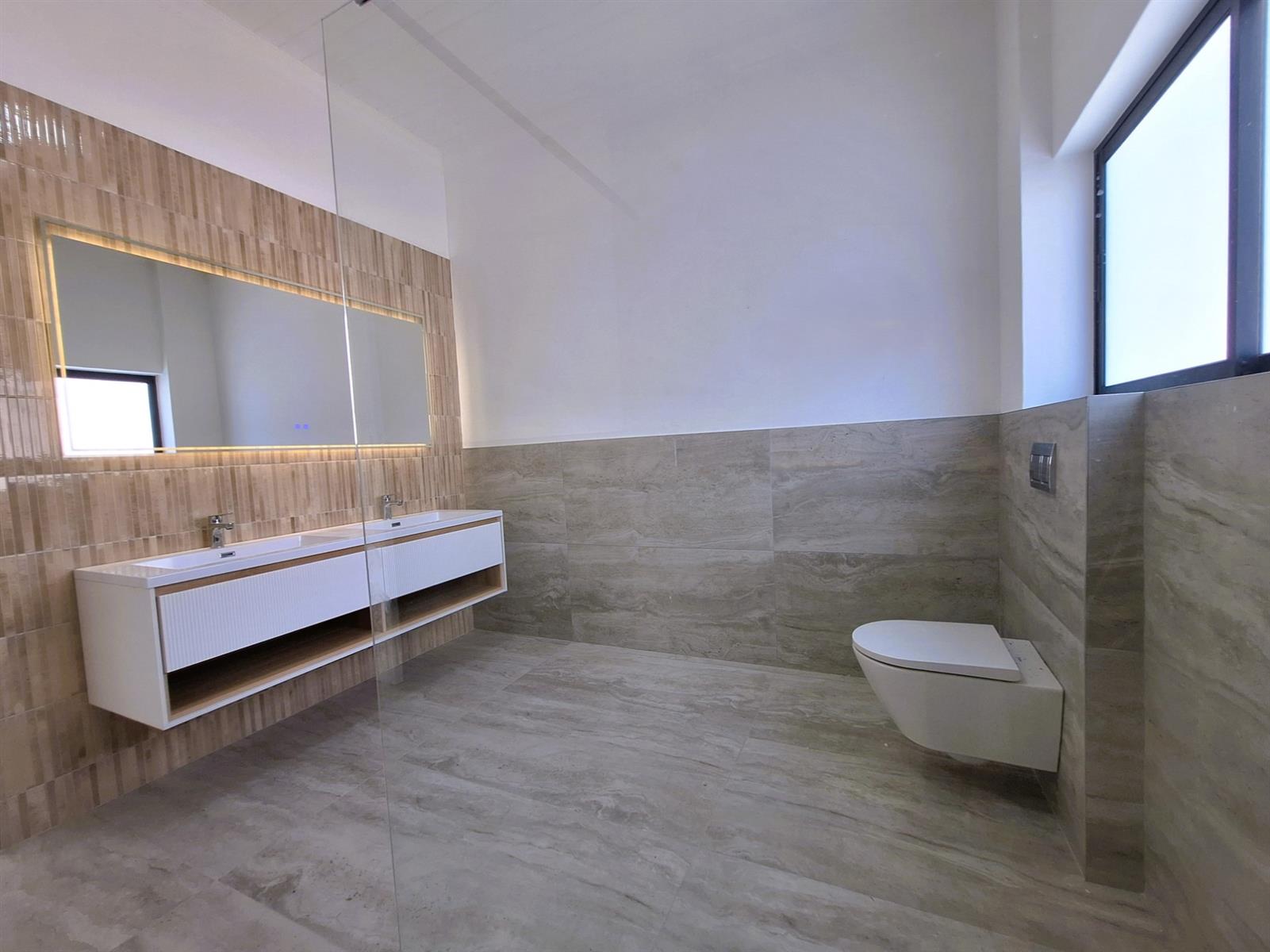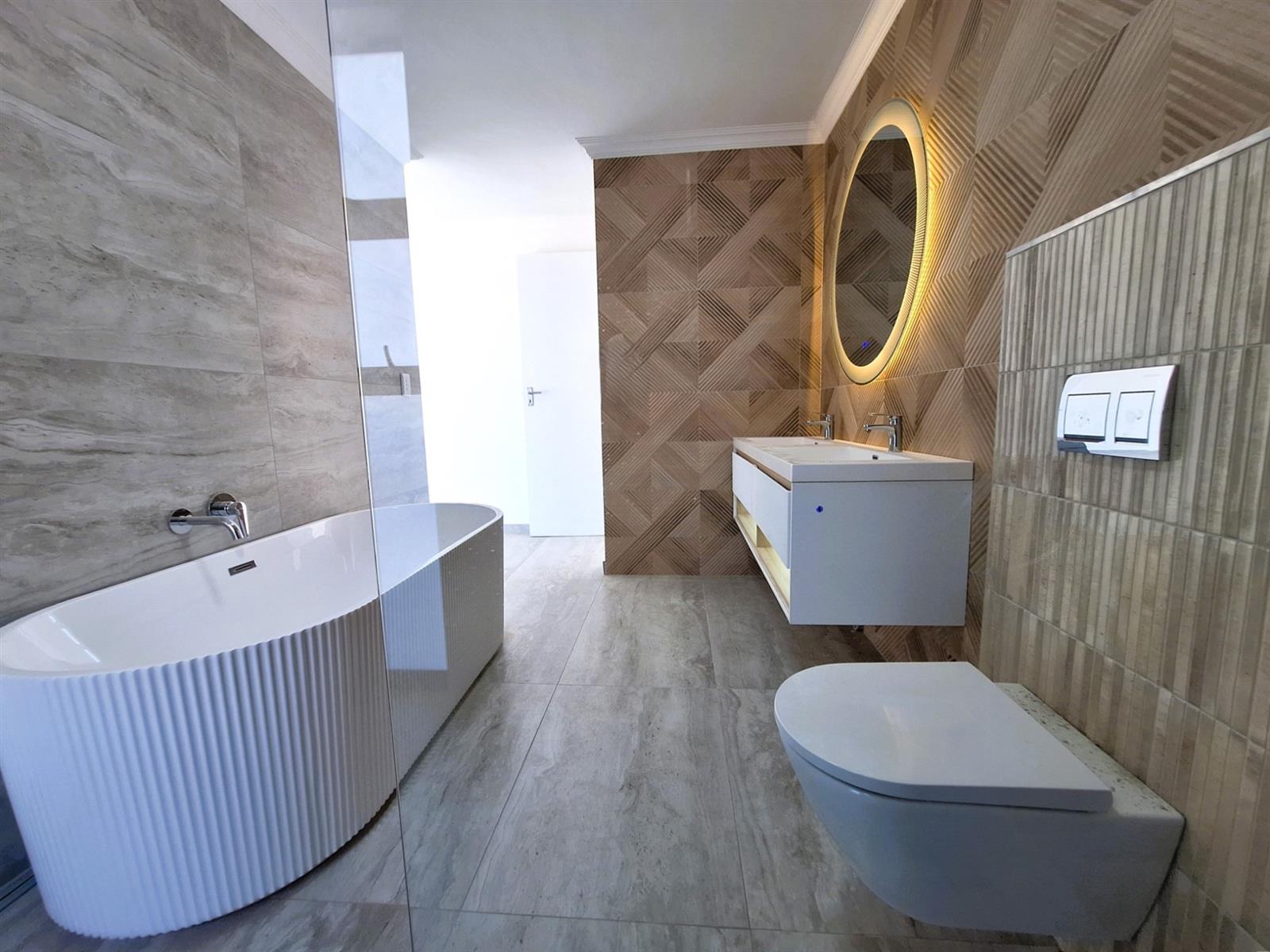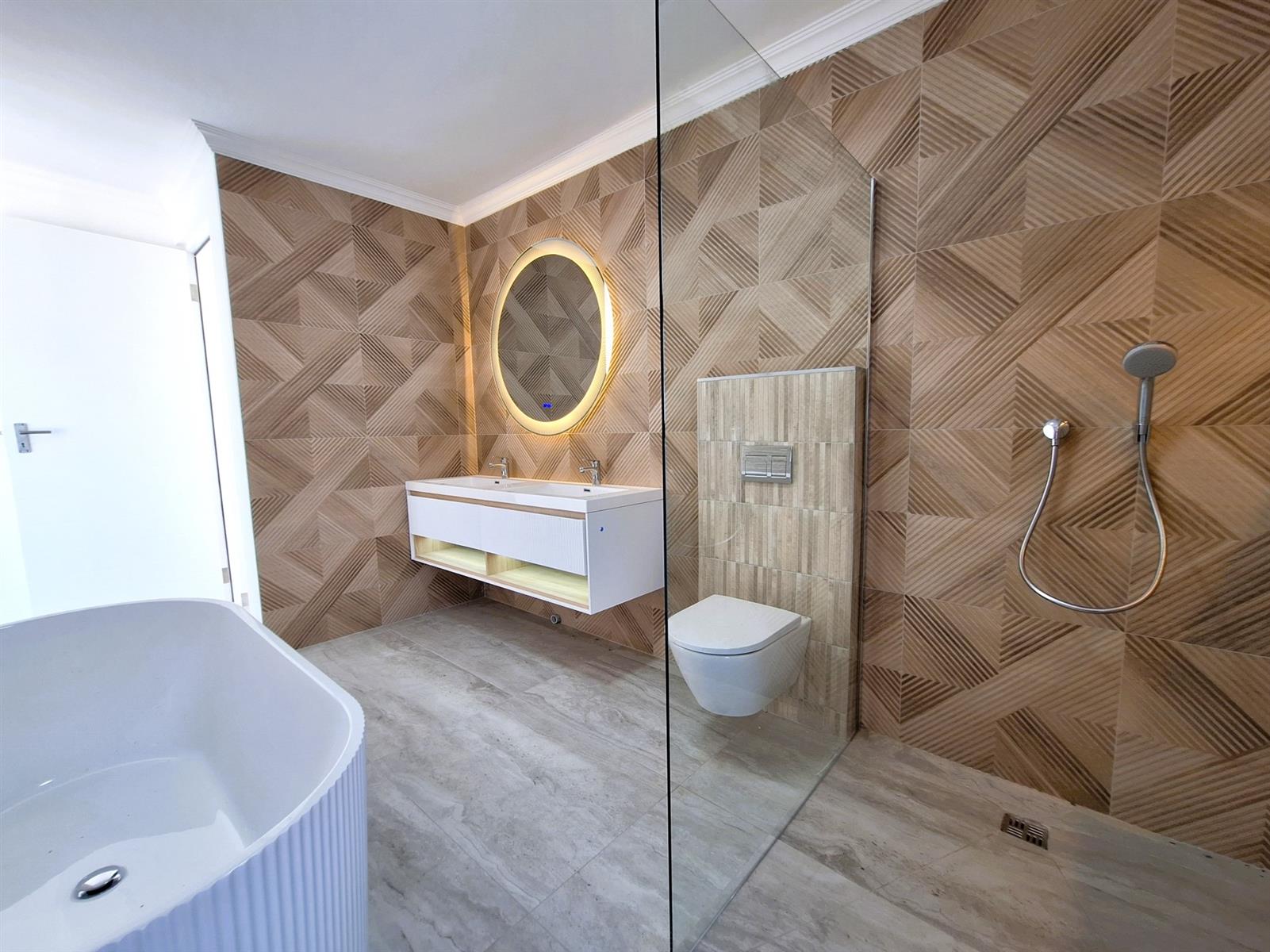 This sophisticated residence offers three spacious bedrooms with built-in cupboards and two stylish bathrooms. The downstairs bedroom has a lavish main en-suite full bathroom with a separate toilet, both with state-of-the-art finishes.