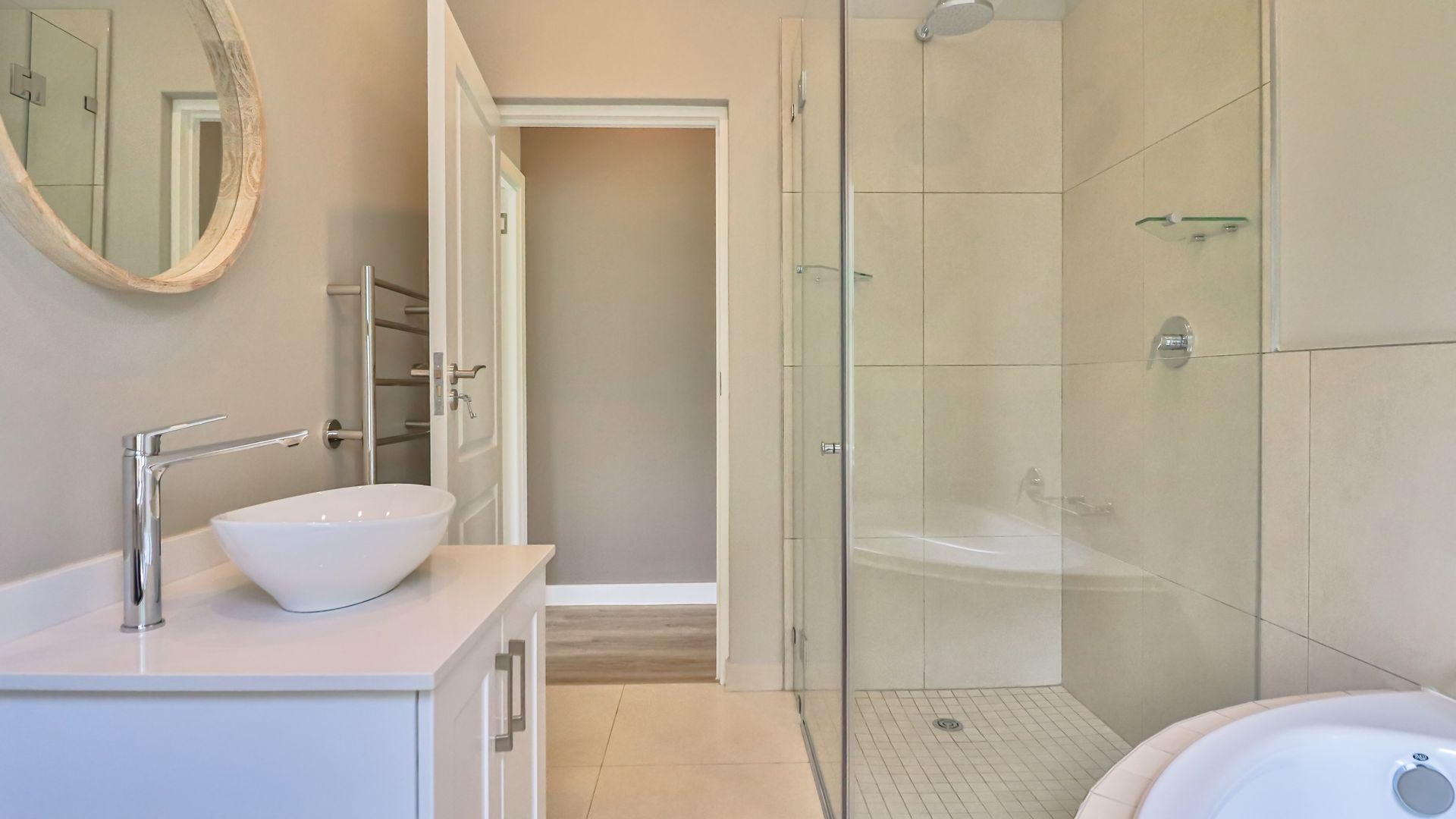Three spacious bedrooms are served with 2 full bathrooms, the one being en-suite to the main bedroom.
