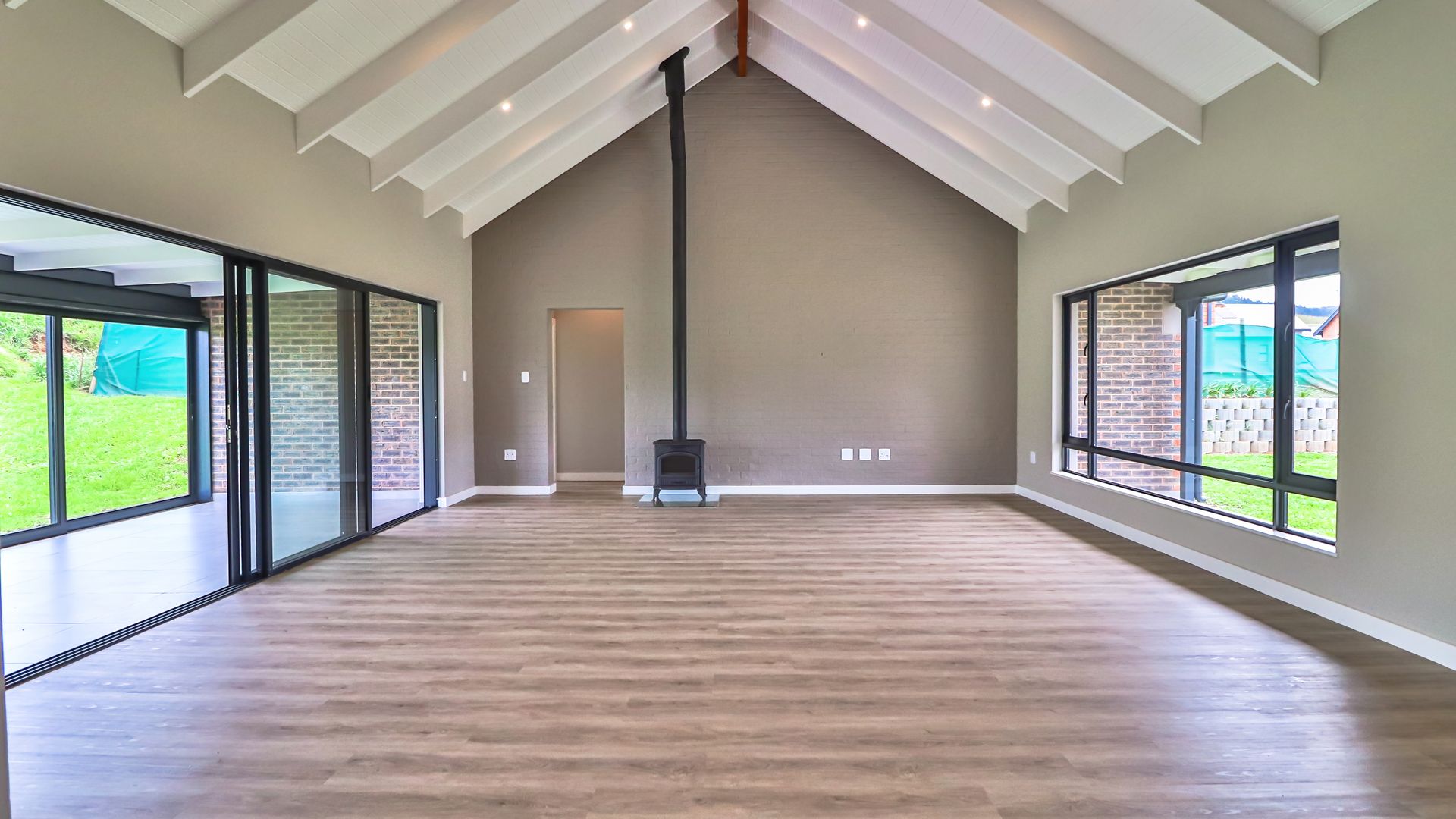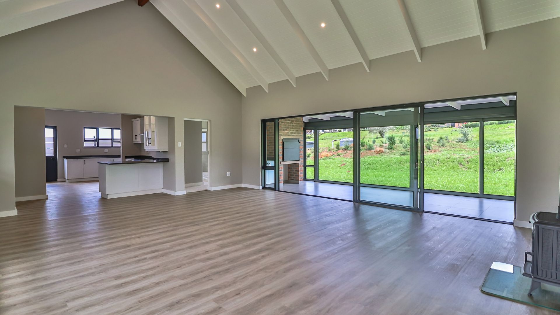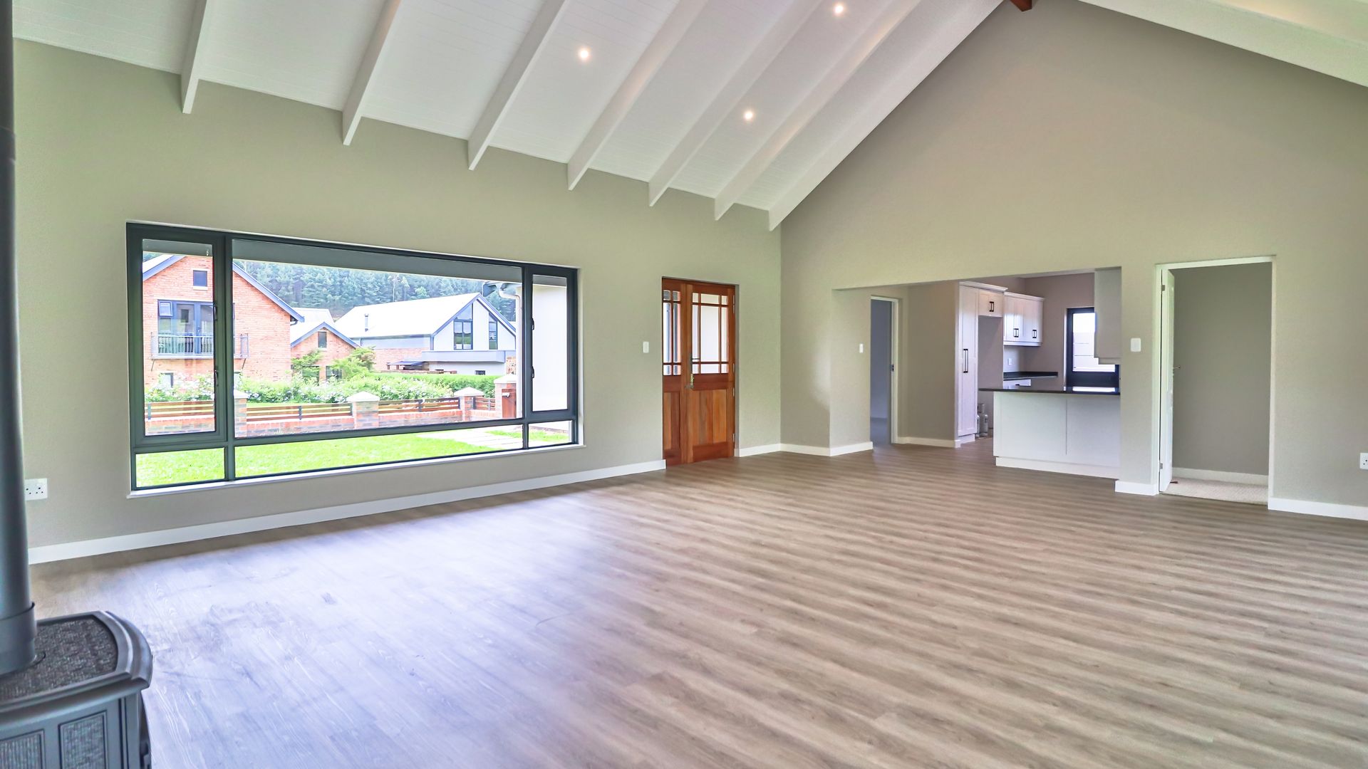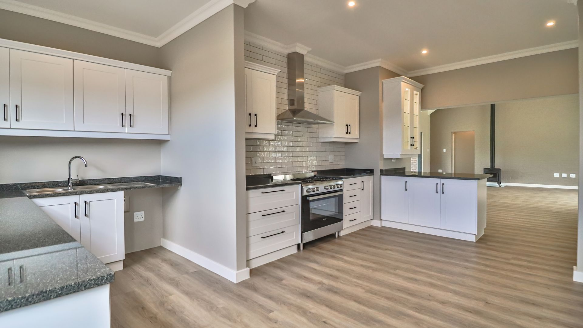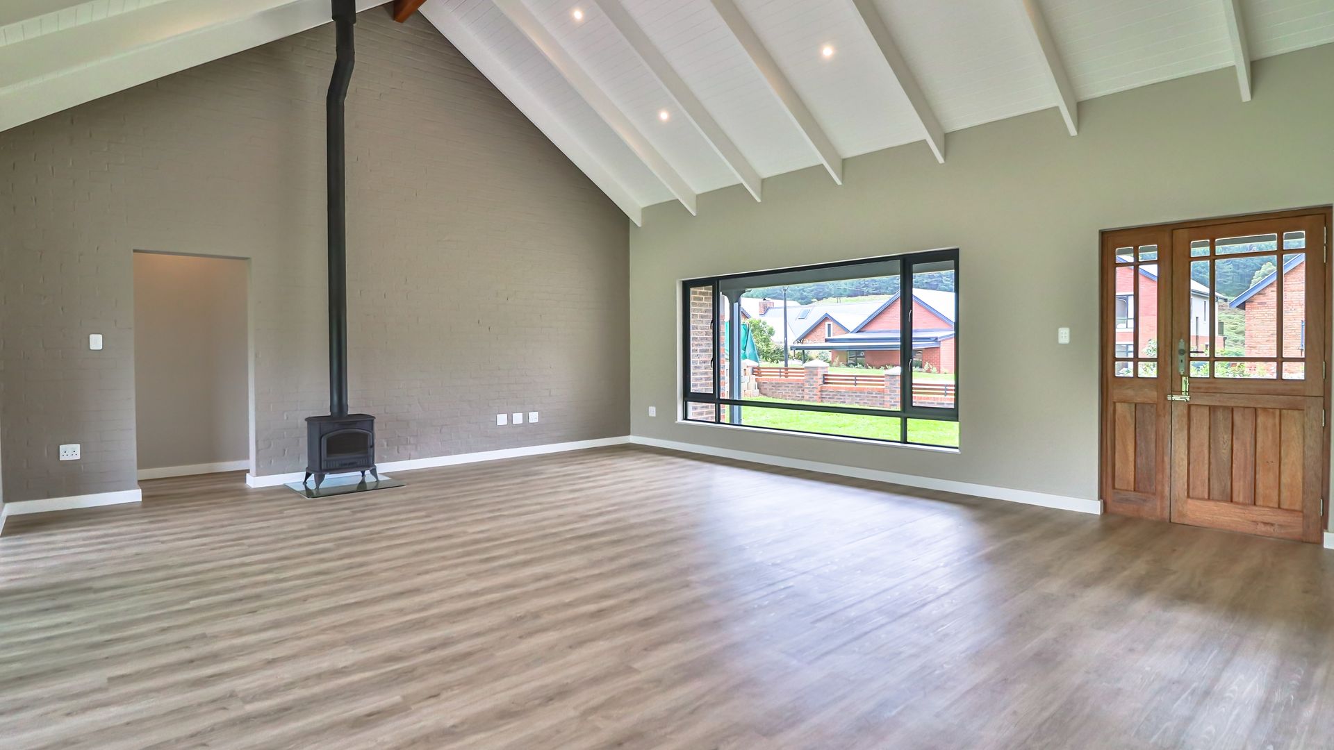 The brick and contrasting plaster home is sunny and light with 2 spacious verandahs, one enclosed with stack doors and boasting an indoor braai, for those cold windy days and the other open for the fresh breezes of summer. The lounge/dining room feel extra spacious with the vaulted ceiling for added character. A wood burning fireplace is situated in this area giving ultimate warmth to both rooms. The open plan kitchen, tastefully designed with a gas hob, electric oven and extractor fan includes a separate scullery.