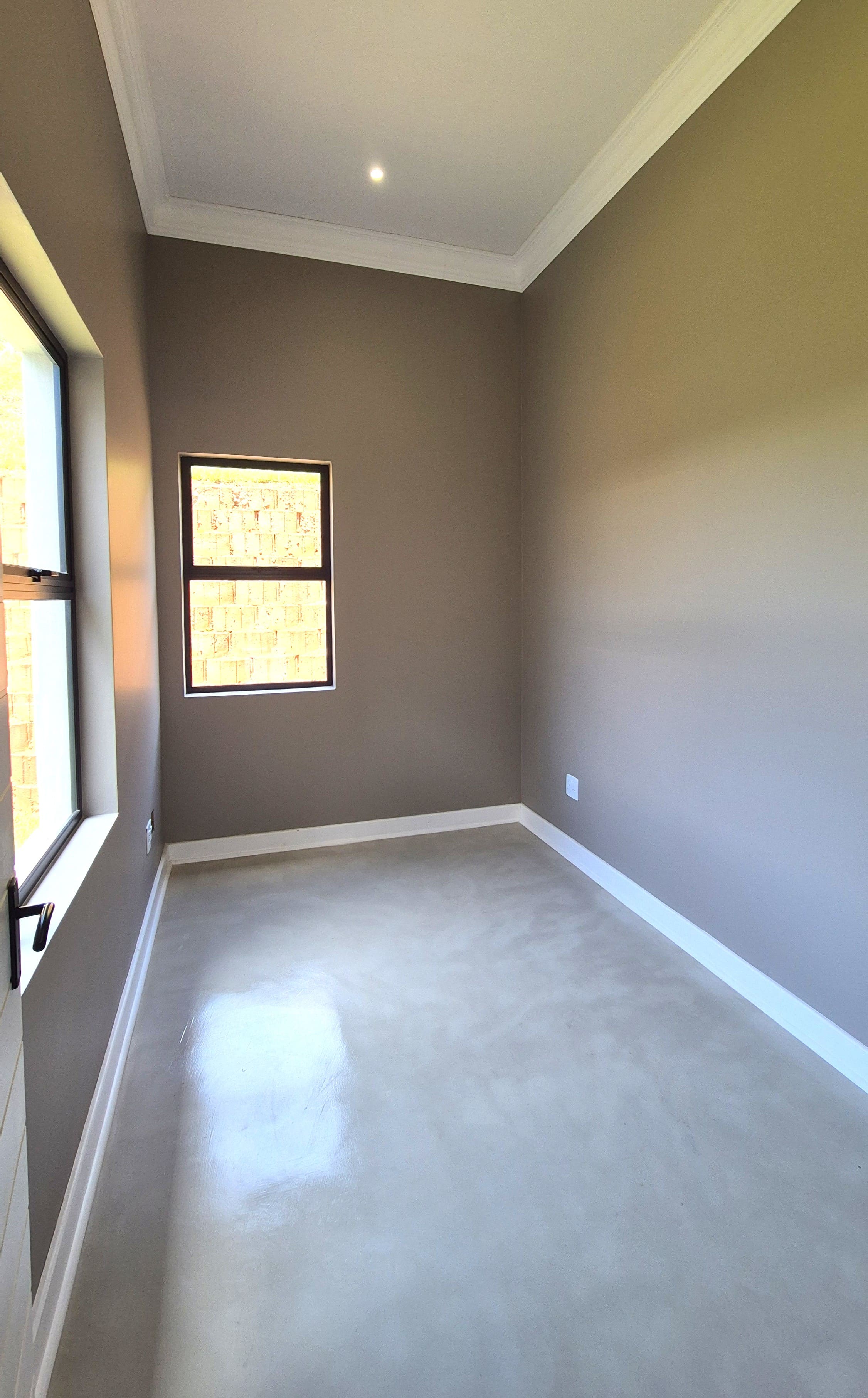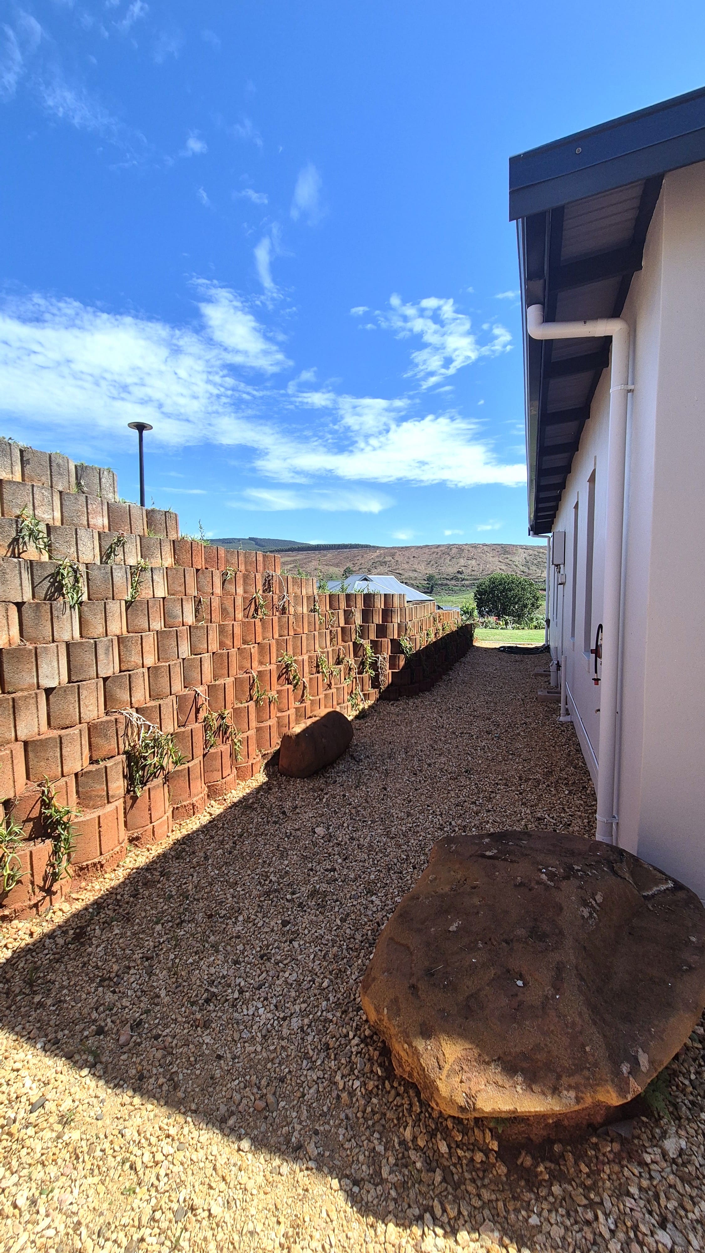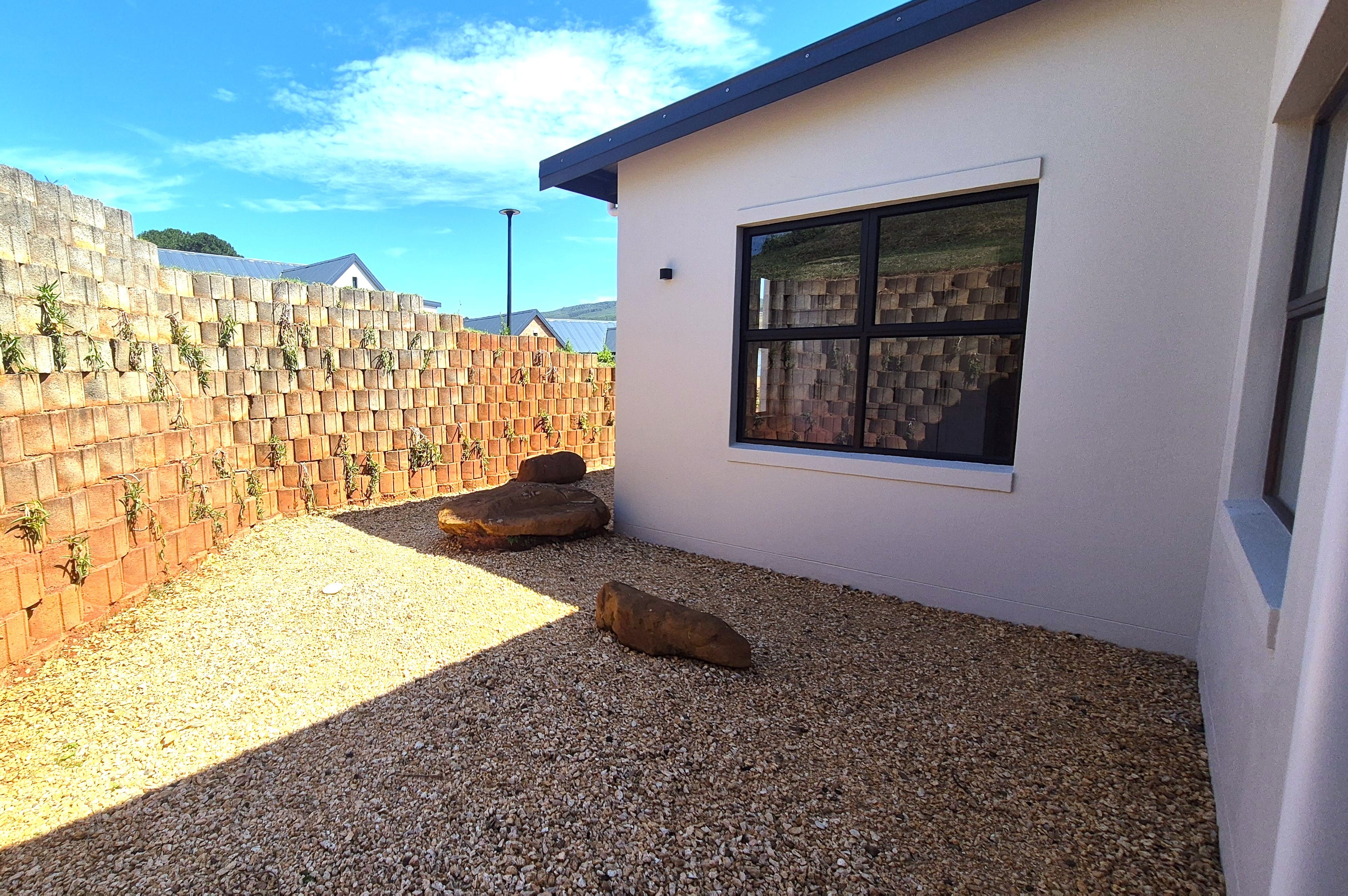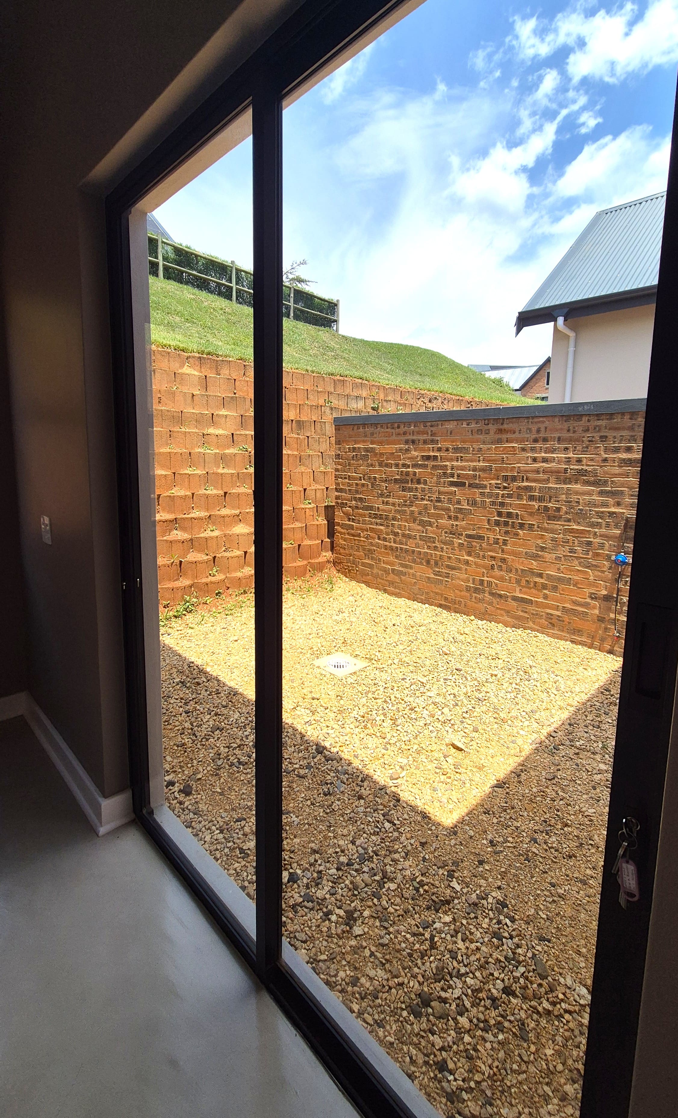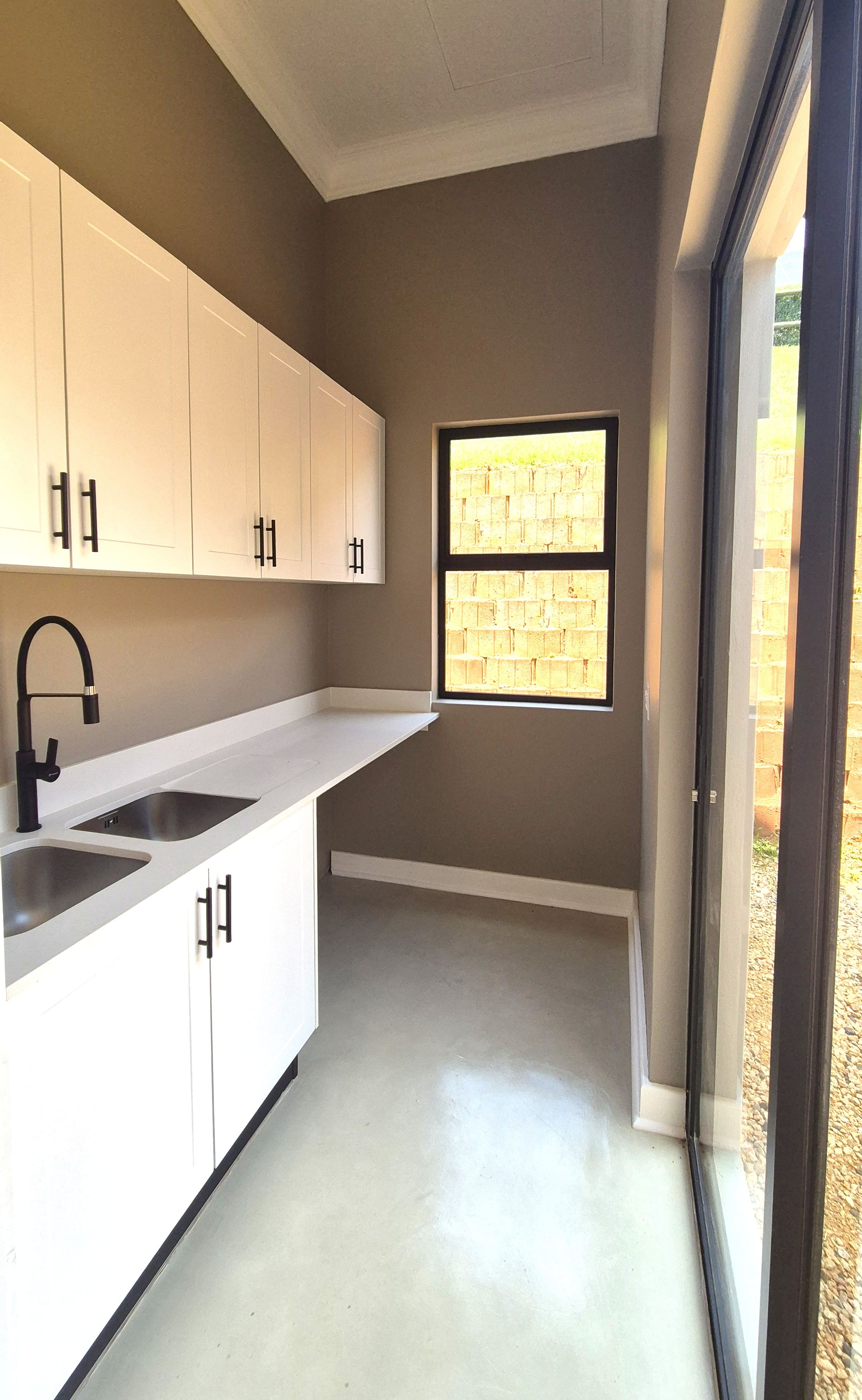 The kitchen is practical and modern, finished with Caesarstone countertops and fitted with a five-plate gas hob, oven and extractor fan. A gas geyser services the home. There is a separate scullery that leads out to a private courtyard, ideal for laundry and day-to-day utility use. A retaining wall at the back of the property creates an opportunity for a living wall or additional planting.