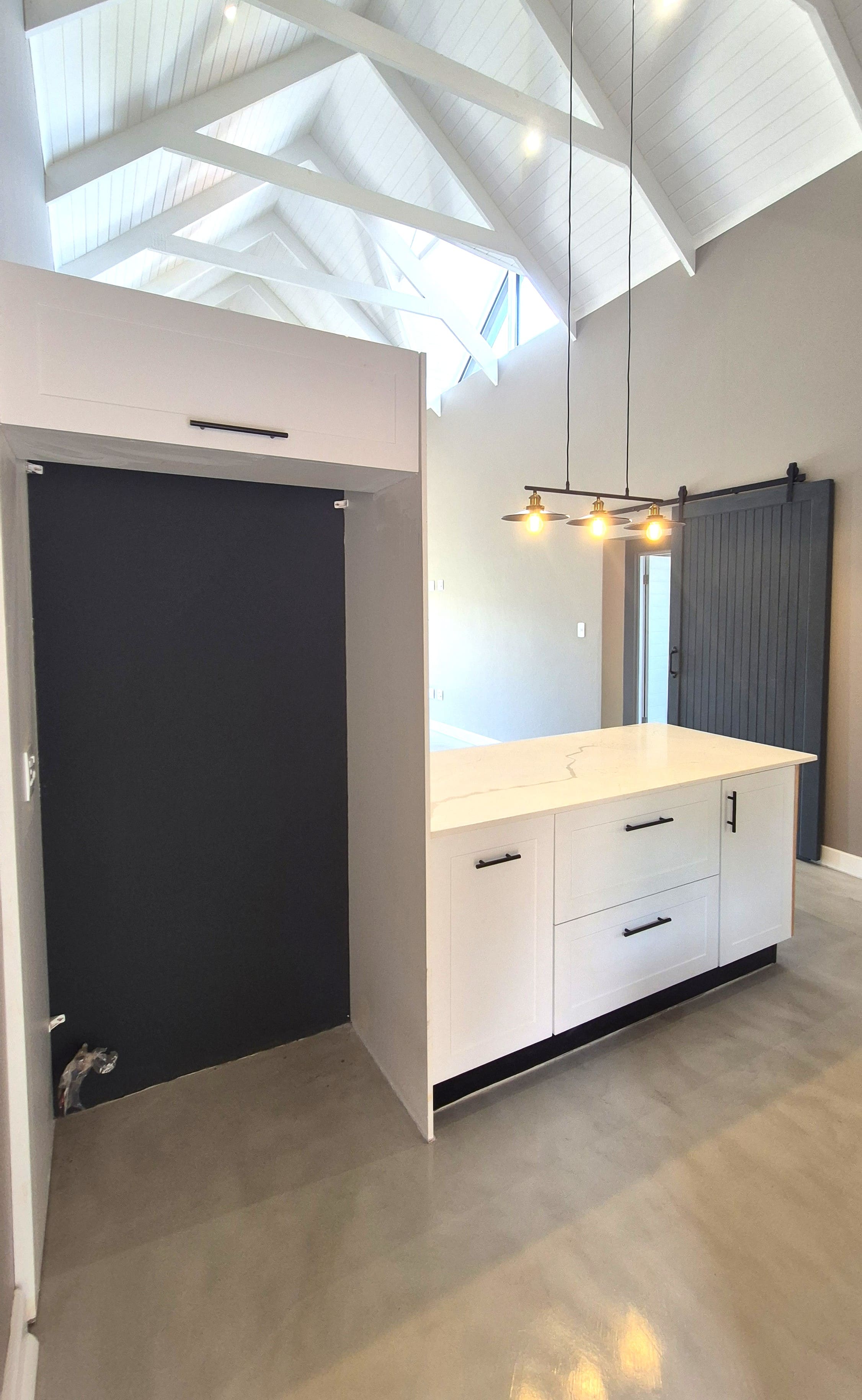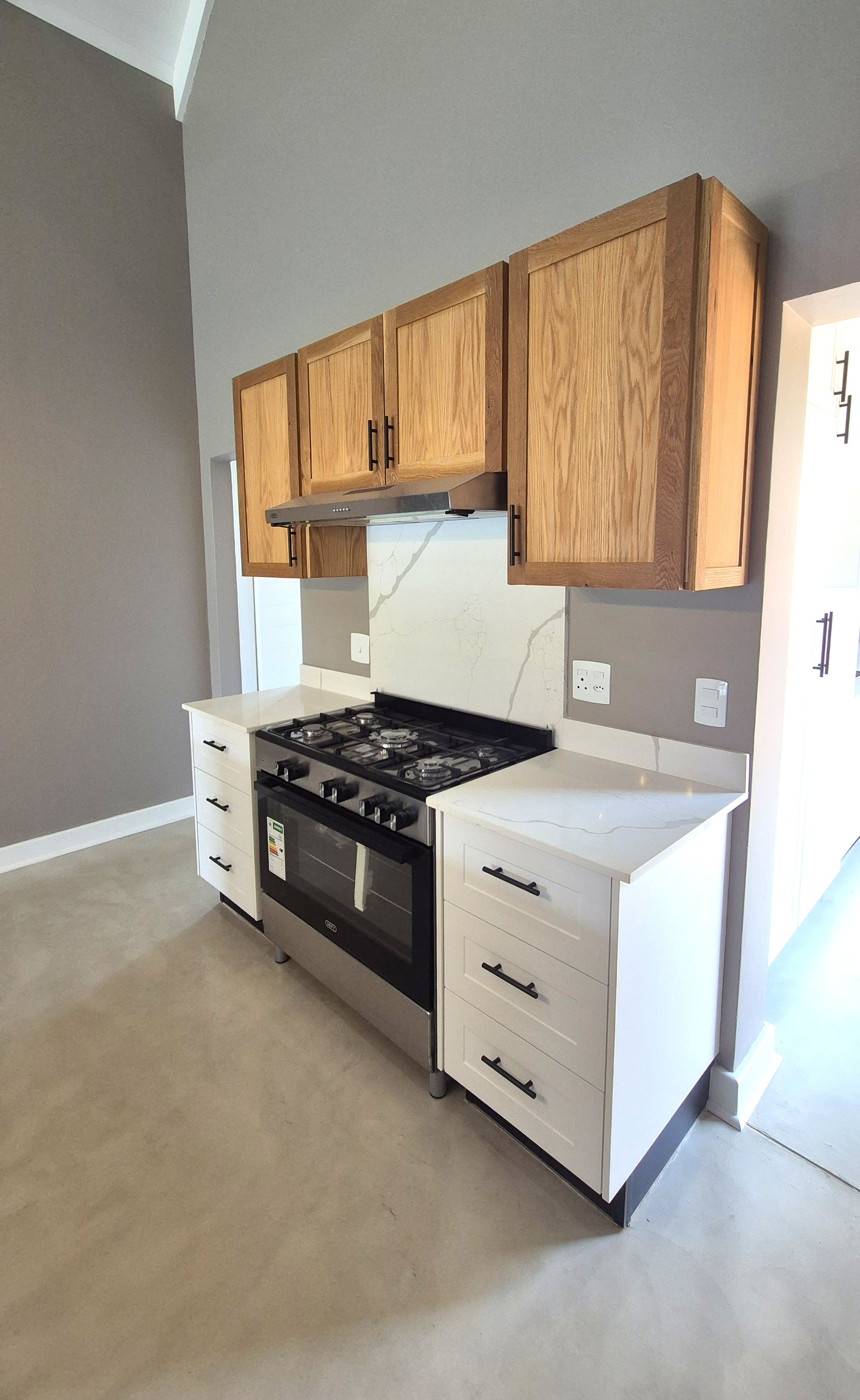 Kitchen with gas hob, oven, extractor fan and Caesarstone countertops
