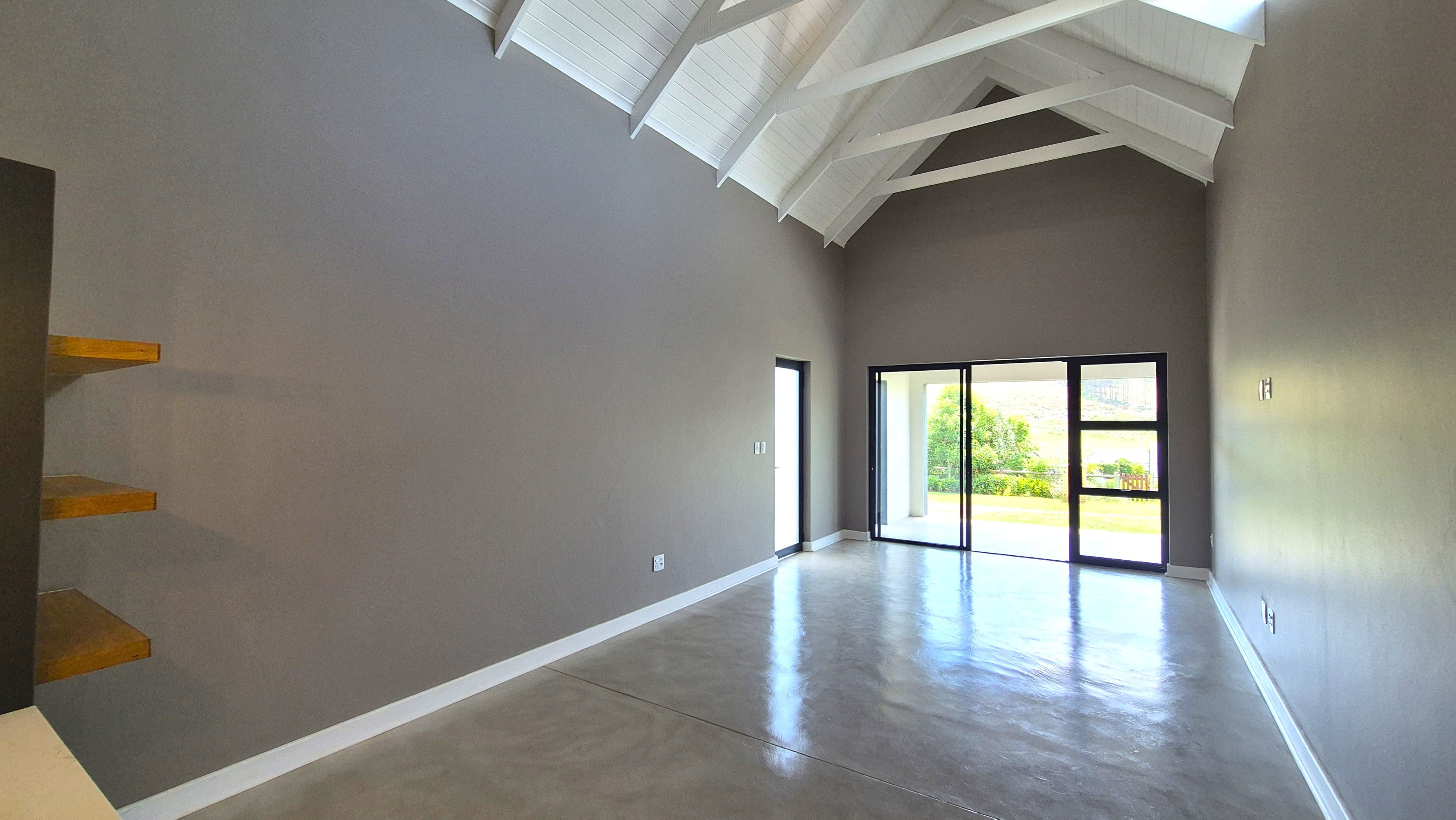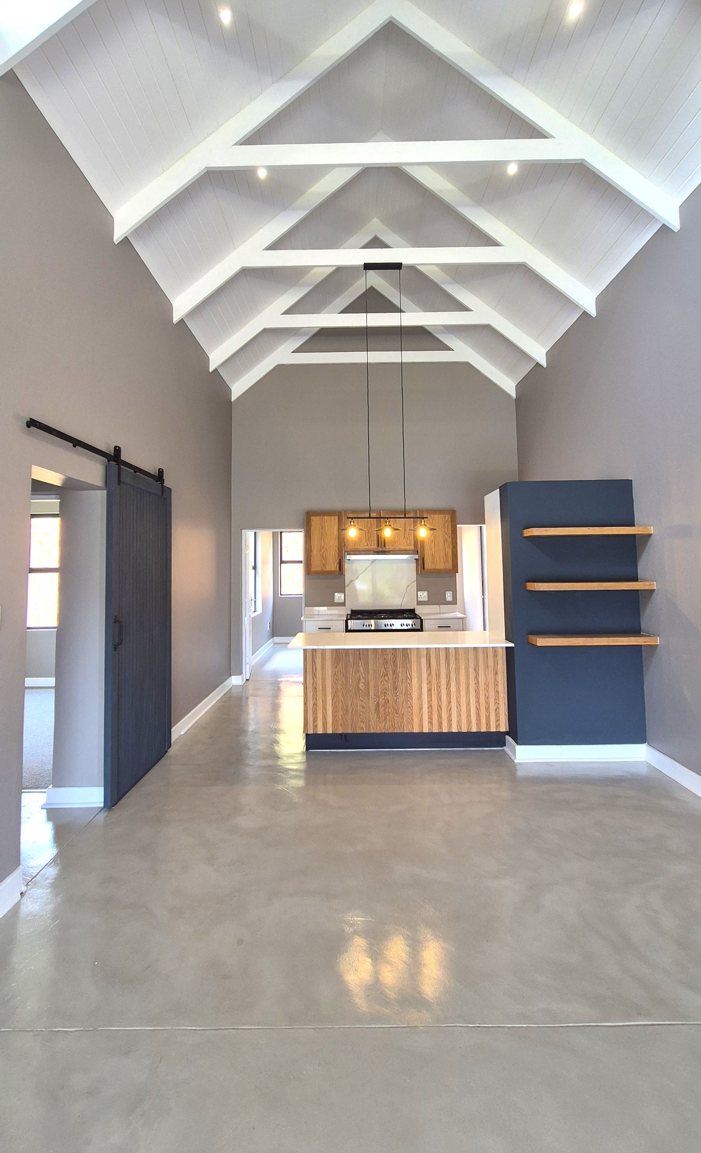 The lounge and dining area are open plan, with high ceilings and exposed beams, giving the space a sense of light and volume. Screeded floors run through the living areas, keeping the look clean and low maintenance. A sliding door opens onto a covered patio, which could be enclosed if more living space is needed in the future. The garden is neat and established, creating a pleasant outlook from the home.