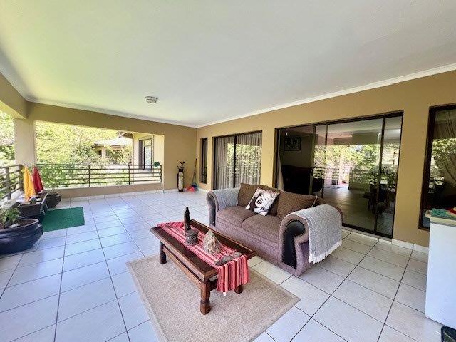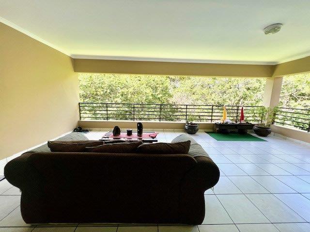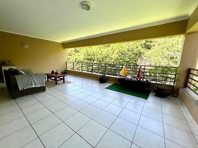 The open living area leads out onto a over sized covered balcony with beautiful garden views.