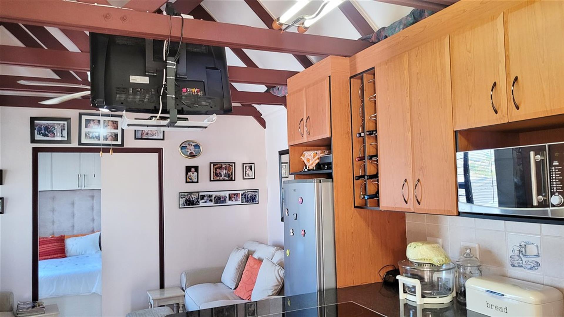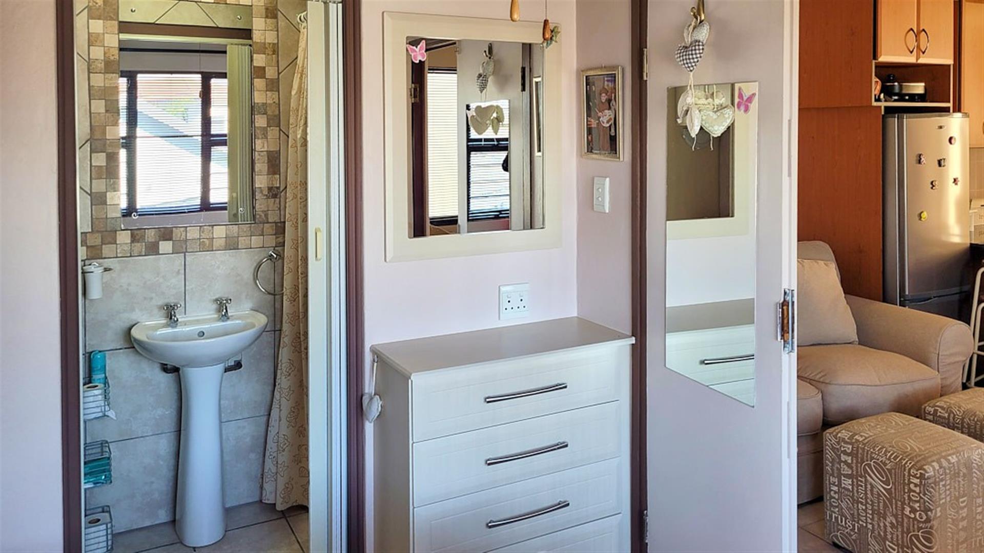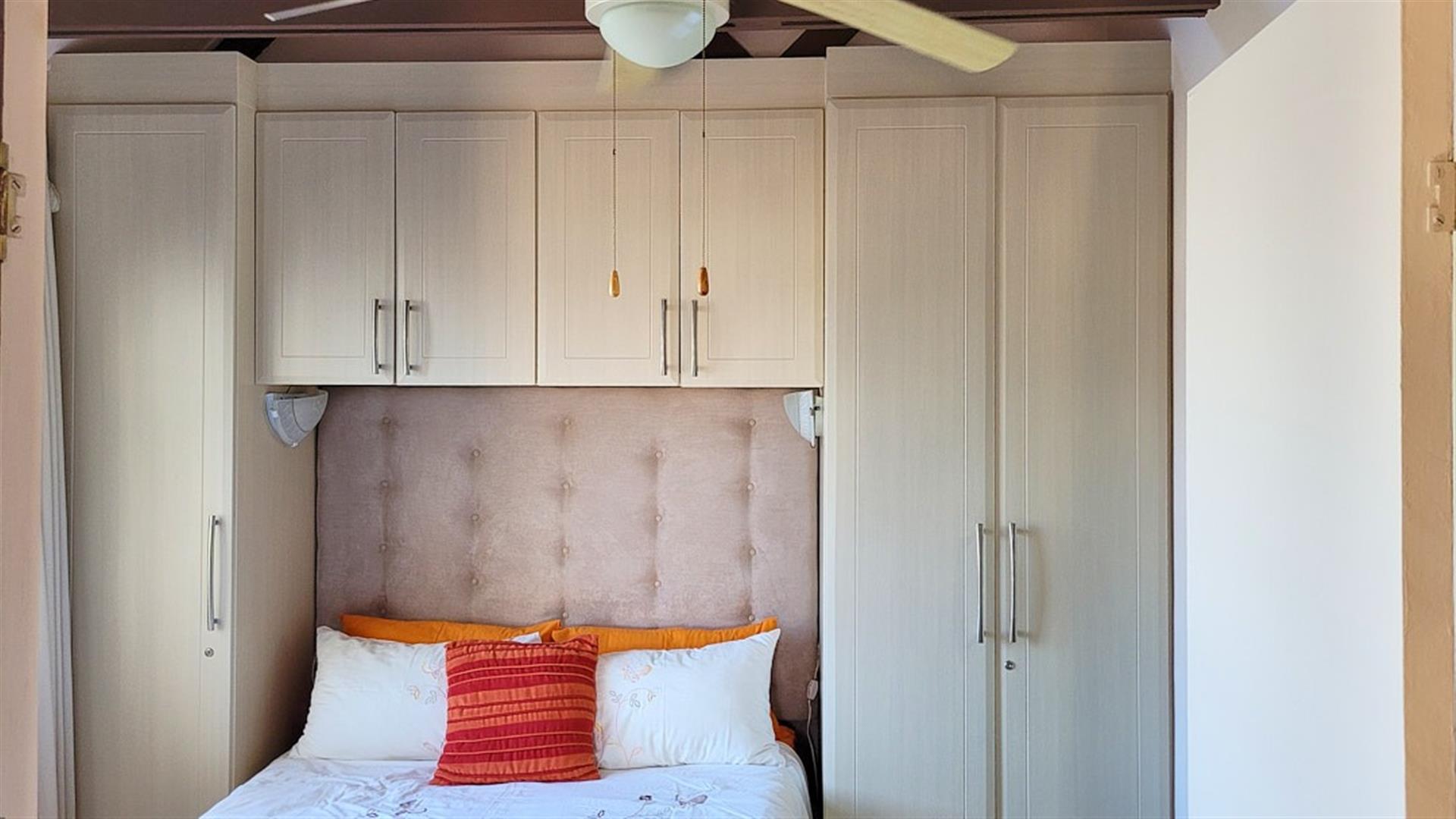 The lounge area is tastefully furnished with 2 sophisticated CoriCraft couches, and is enchanting with high ceilings and a ceiling fan that enhances the breezy ocean vibe. A unique feature of the lounge is that the TV, ingeniously mounted on one of the ceiling / roof beams. The bedroom has a exceptionally spacious, glamorous feel to it with brand new built in cupboards: again adding that extra touch of class. A top tier double bed with a CLOUD 9 matrass, ensures the utmost comfort and luxury. There is a velvet built-in headboard with a built in chest of drawers. A ceiling fan in the bedroom contributes to the comfortable atmosphere. The bedroom is en-suite to a bathroom with a shower.