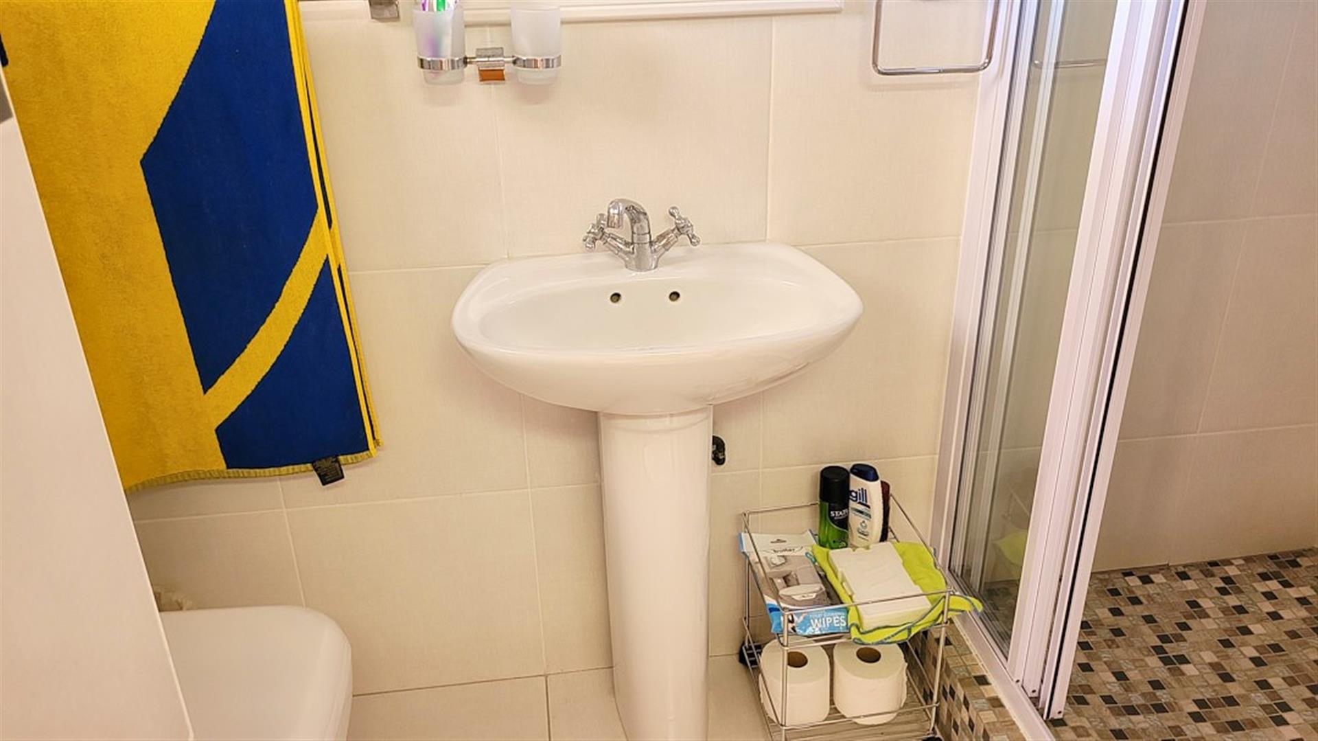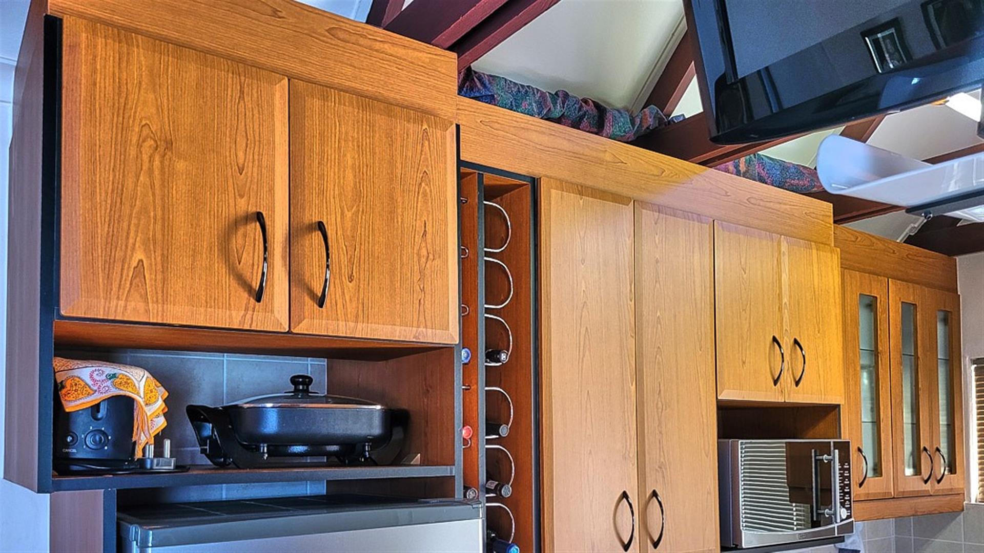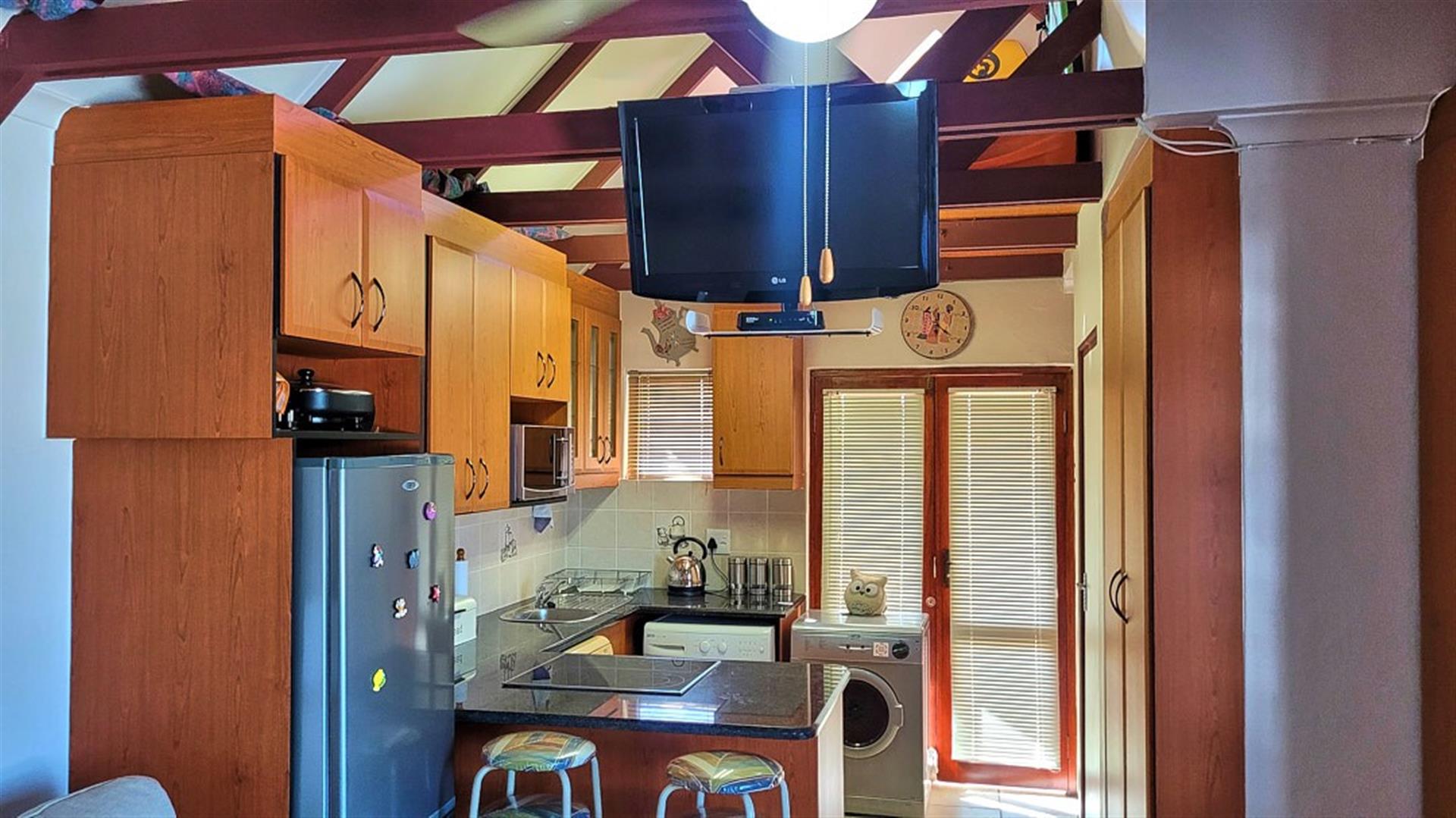 The lounge area is tastefully furnished with 2 sophisticated CoriCraft couches, and is enchanting with high ceilings and a ceiling fan that enhances the breezy ocean vibe. A unique feature of the lounge is that the TV, ingeniously mounted on one of the ceiling / roof beams. The bedroom has a exceptionally spacious, glamorous feel to it with brand new built in cupboards: again adding that extra touch of class. A top tier double bed with a CLOUD 9 matrass, ensures the utmost comfort and luxury. There is a velvet built-in headboard with a built in chest of drawers. A ceiling fan in the bedroom contributes to the comfortable atmosphere. The bedroom is en-suite to a bathroom with a shower.
