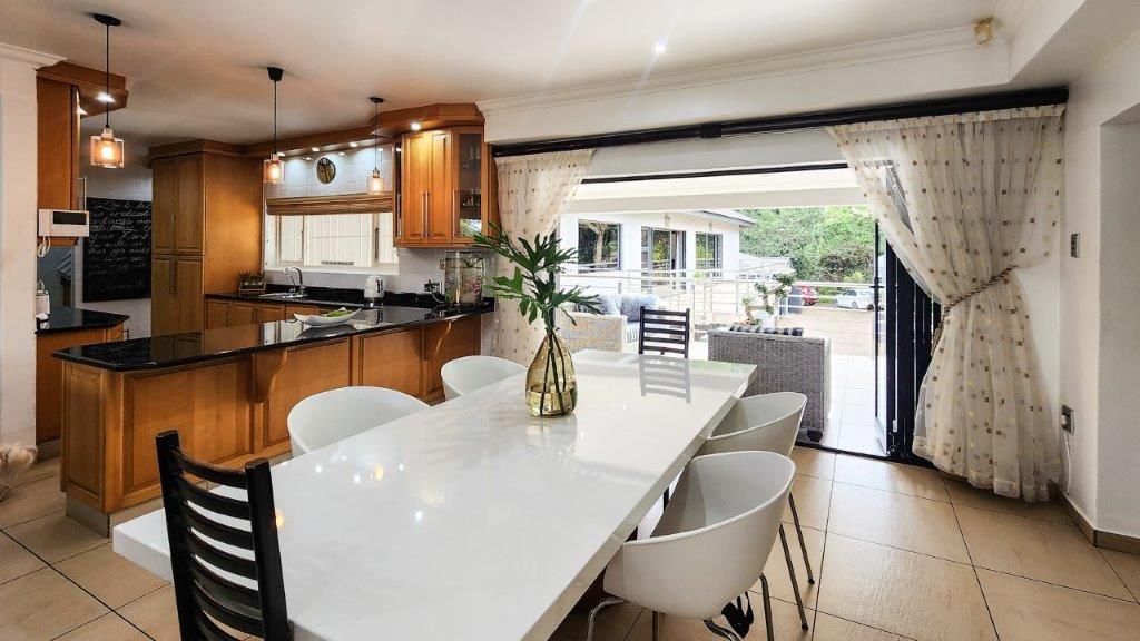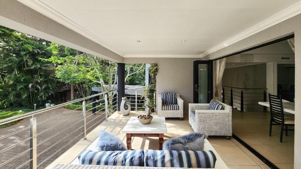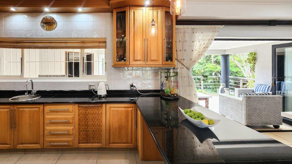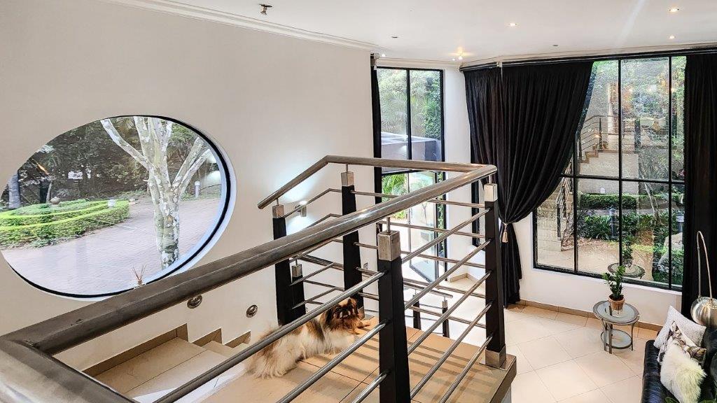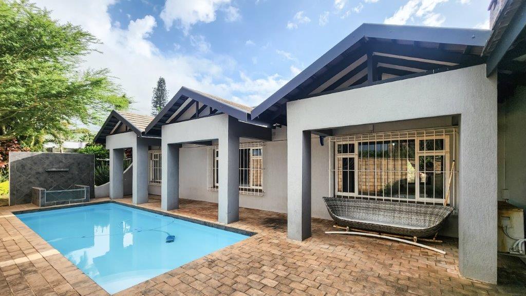 Walk through the main door and you are greeted by a double volume entrance hall with a sweeping staircase. This level is large enough to house a lounge suite and boast huge windows to add to the feel. Up the staircase we have a large open plan living area which is very modern and has lots of natural light. The lounge leads to an entertainment patio via stack doors with a built-in braai, private swimming pool with a water feature. This is the ideal setting for functions with family and friends or an intimate after work sundowner, as well as the lovely sea-views. The living area also leads to a balcony. The kitchen well-appointed and very eye appealing. It has a breakfast nook, granite tops, gas hob and eye level oven. There is also a scullery and a large laundry room.
