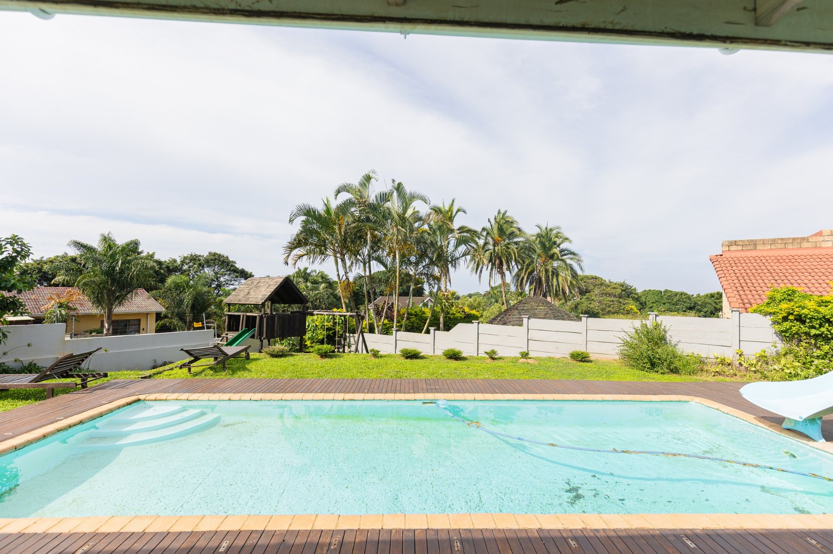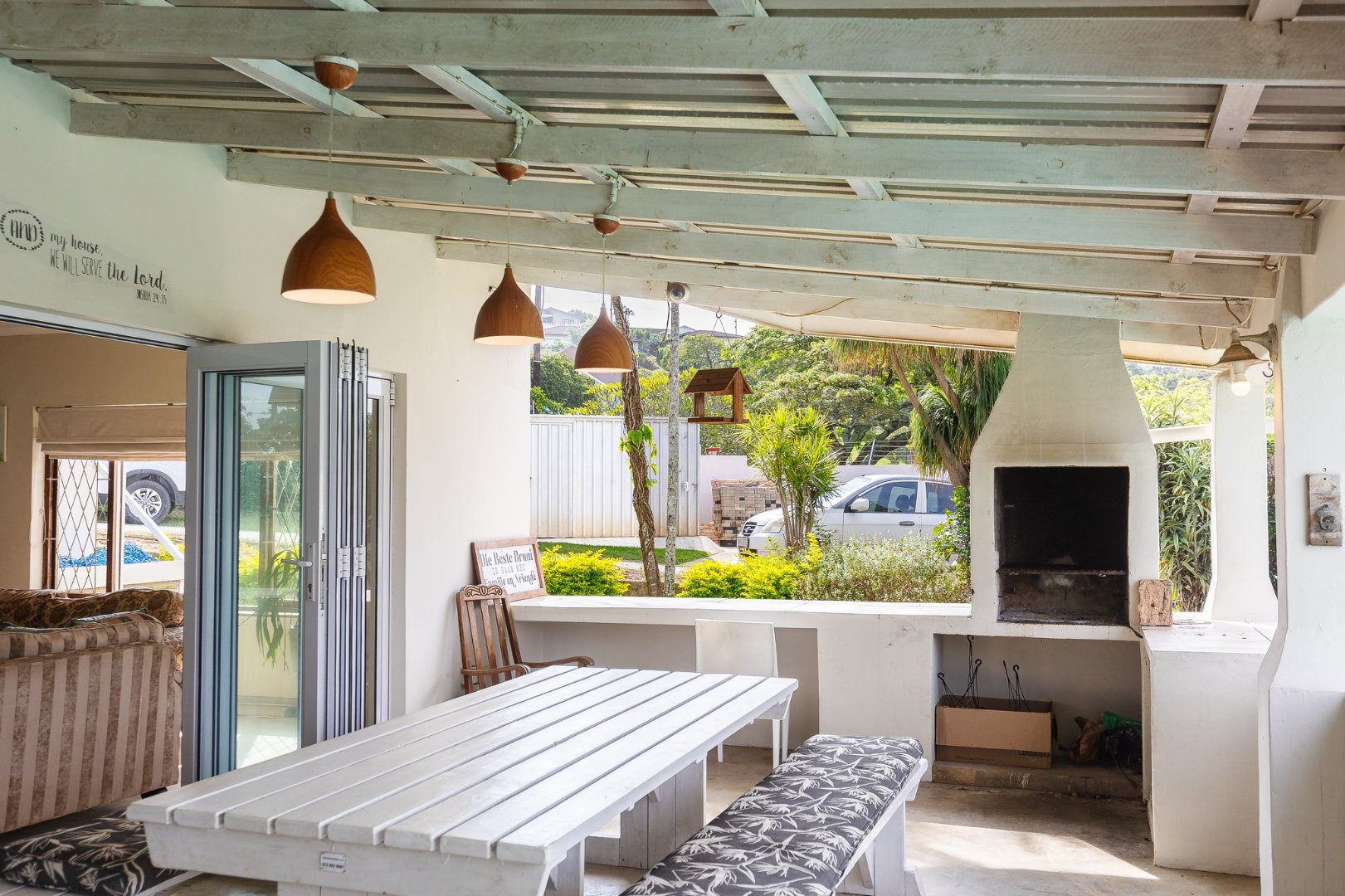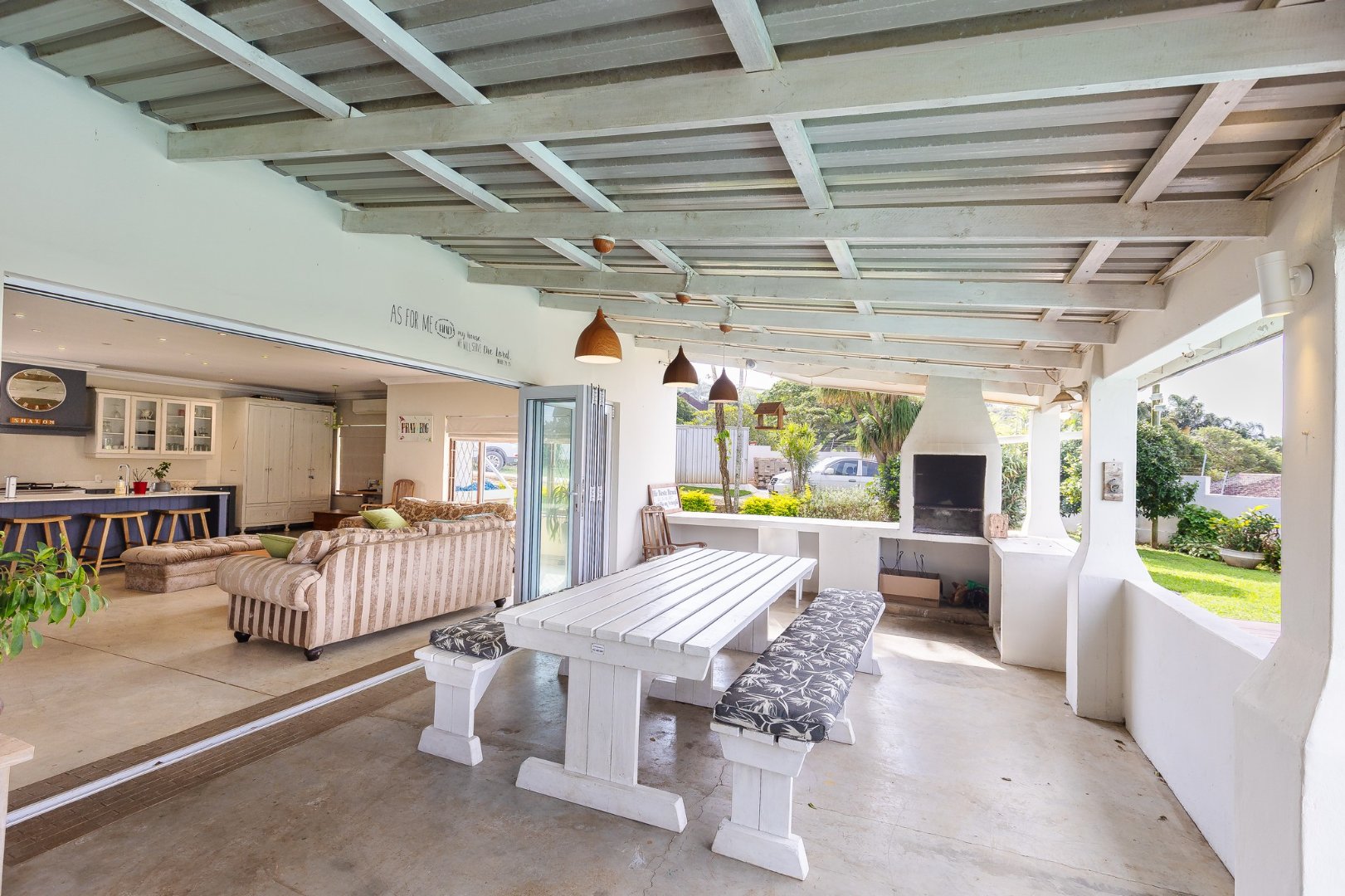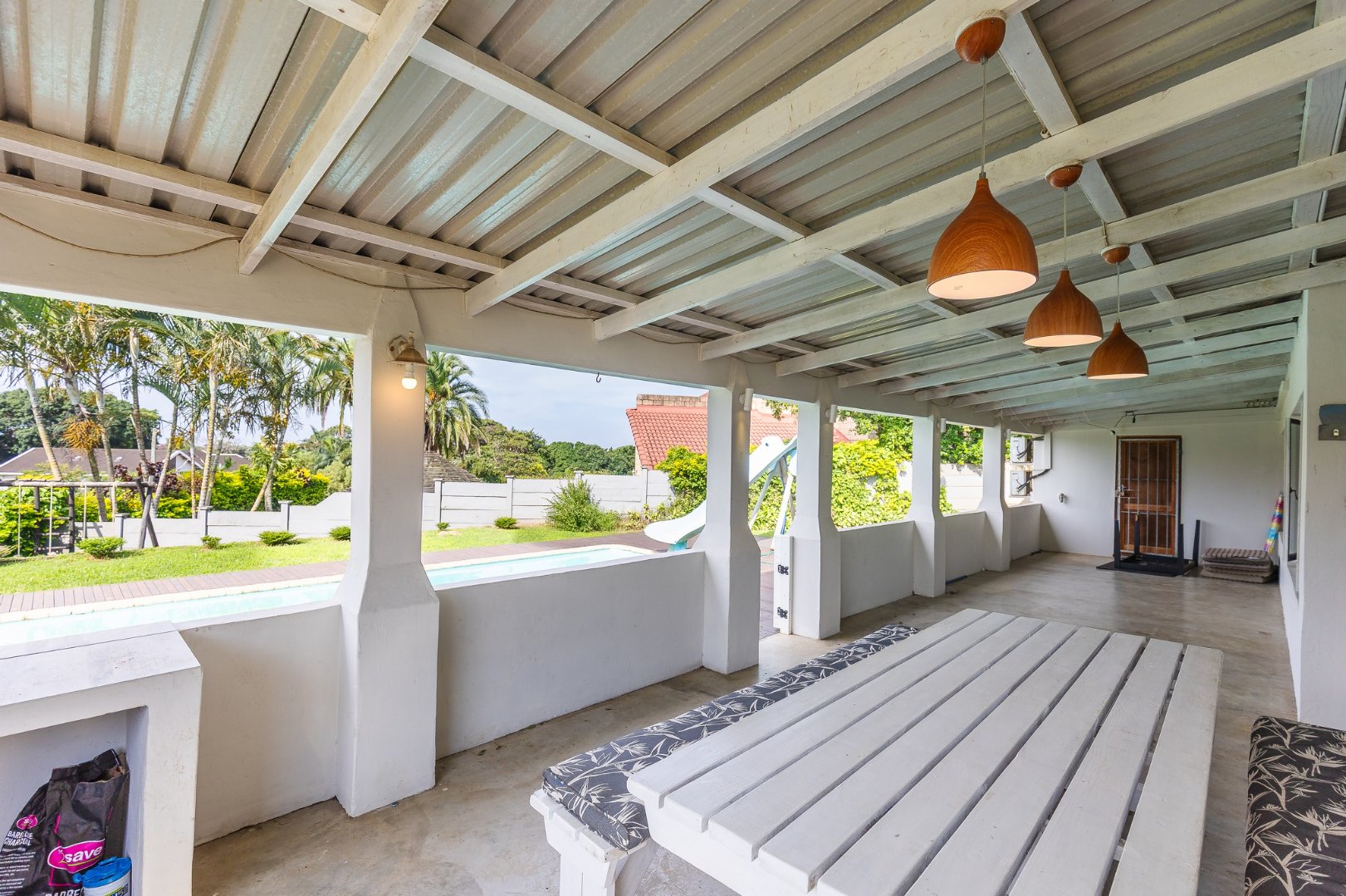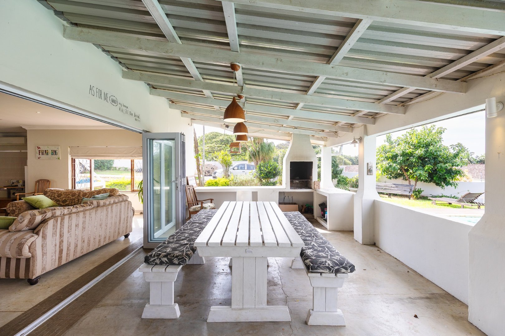 The lounge leads to a large patio, via stack doors. The patio has a built-in braai, and overlooks the swimming pool .
